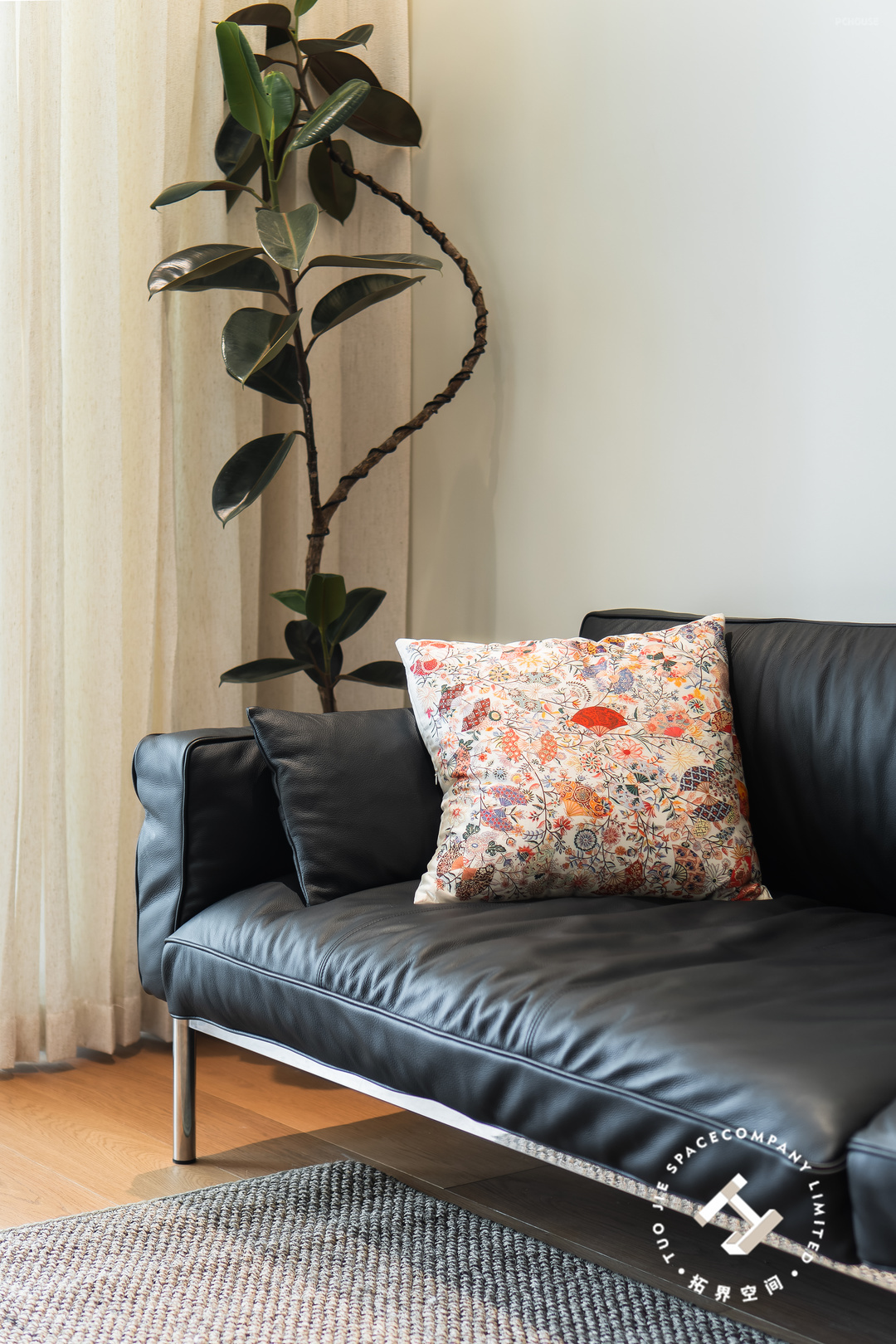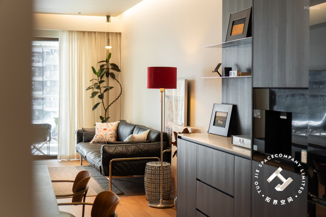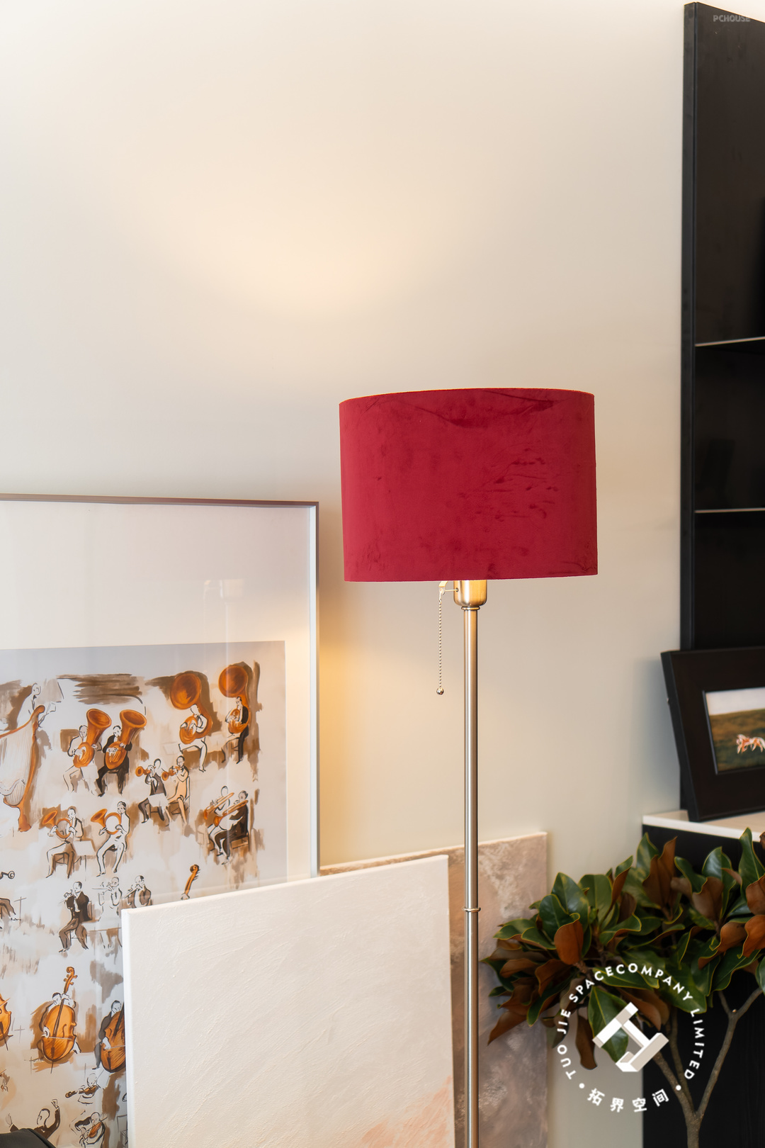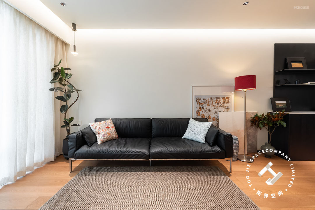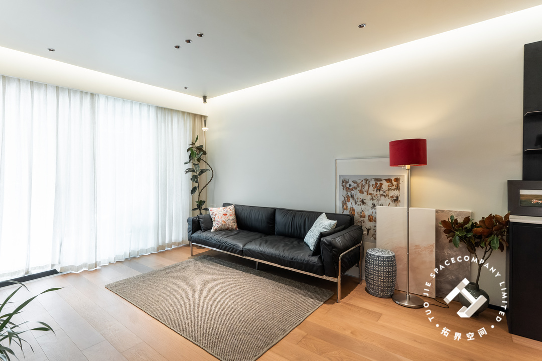 跳脱的红色落地灯为这个客厅增添了活力和温度,再通过地毯、画框、绿植的点缀,让空间显得更有层次和氛围。