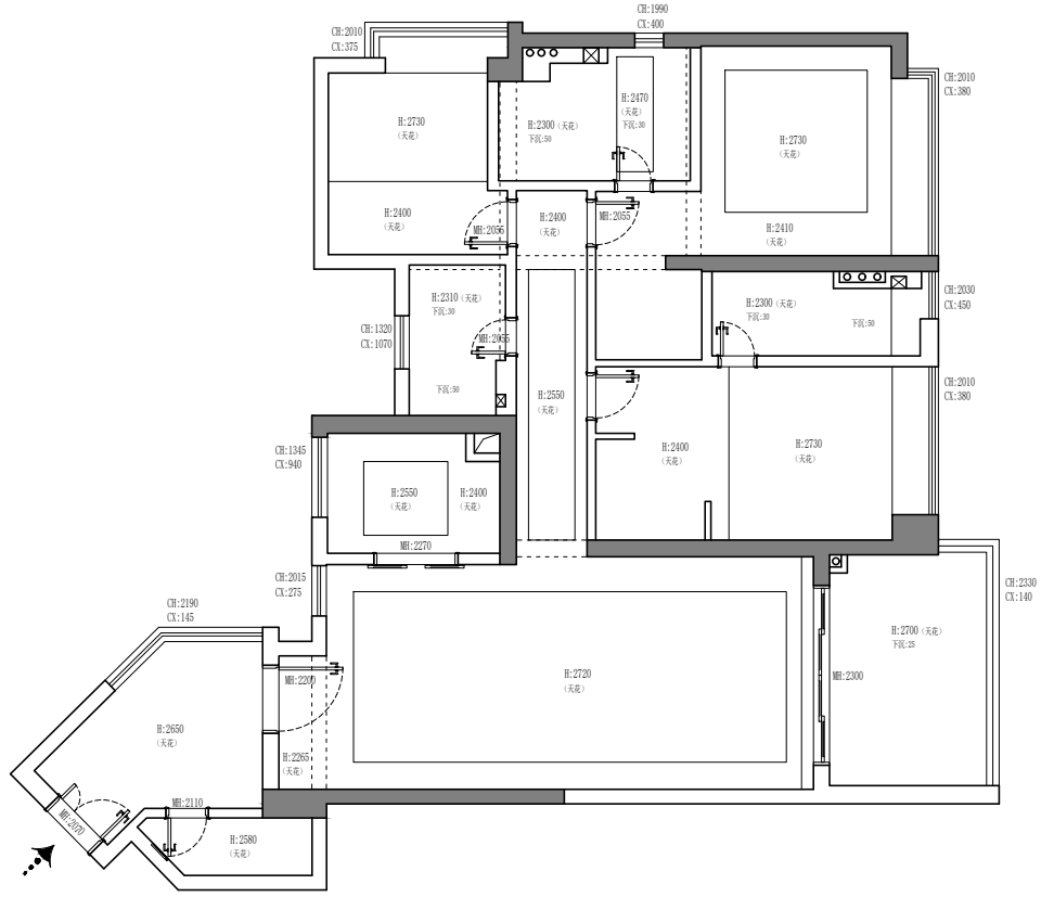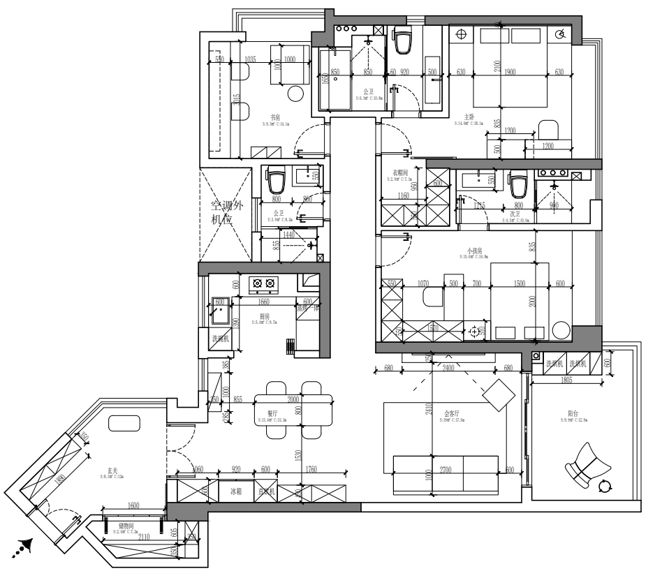 装修前:玄关与厨房都影响了通透性;主卧的衣帽间有压抑感;次卧内的隔断影响空间感。