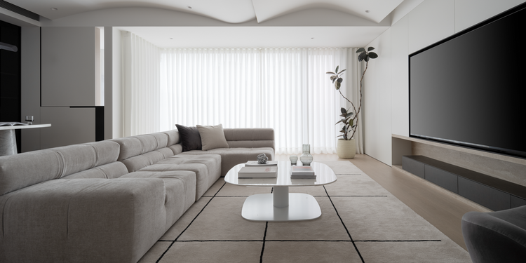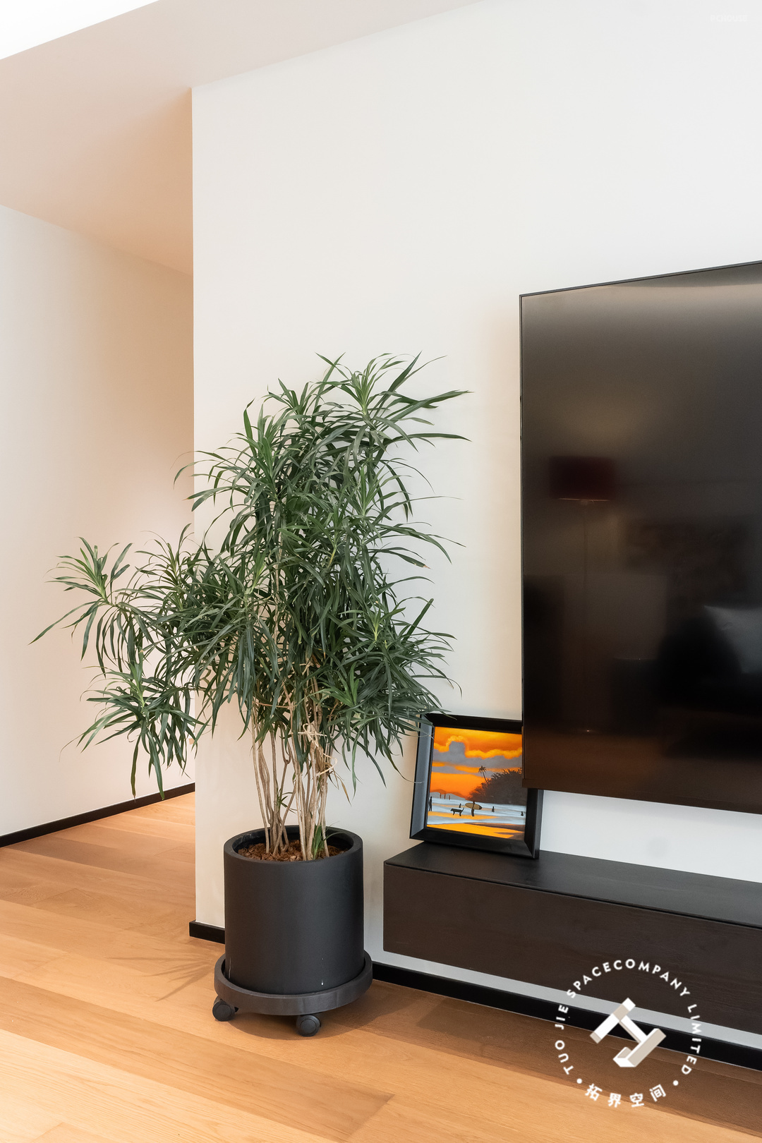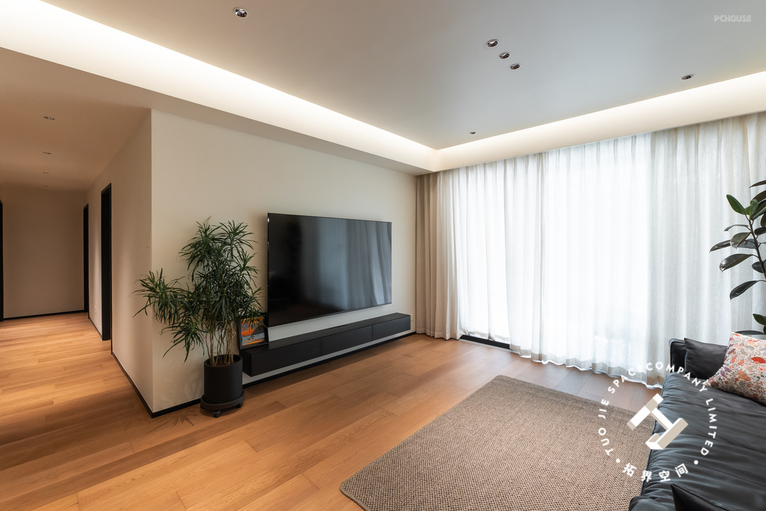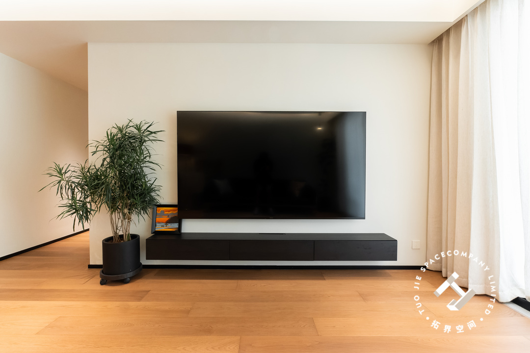纯白电视背景墙没有过多的造型修饰,搭配一组黑色悬空电视柜和壁挂电视机,化繁为简,在视觉上给人一种延伸感。