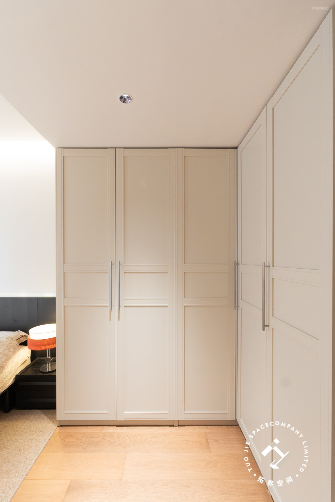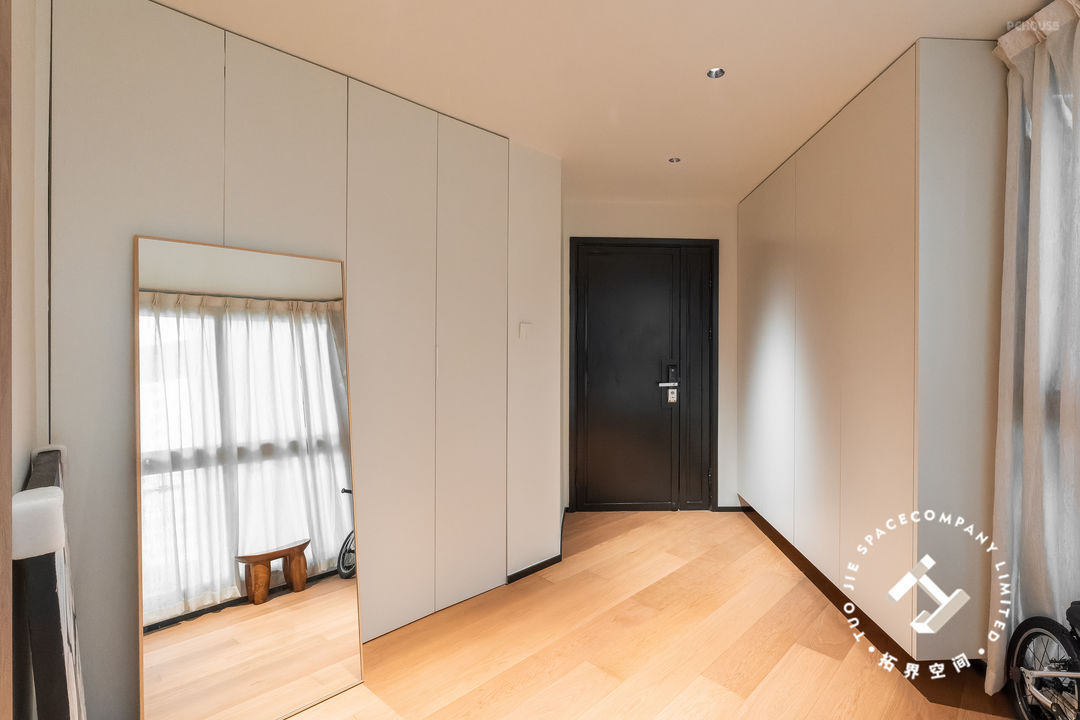 沿着转角空间定制一门到顶的衣柜,更显干净利落,而内部储物能力强大;米色+线条感十足的柜面,让整体的复古氛围慢慢凸显出来,展现了柔和、温暖的感觉。