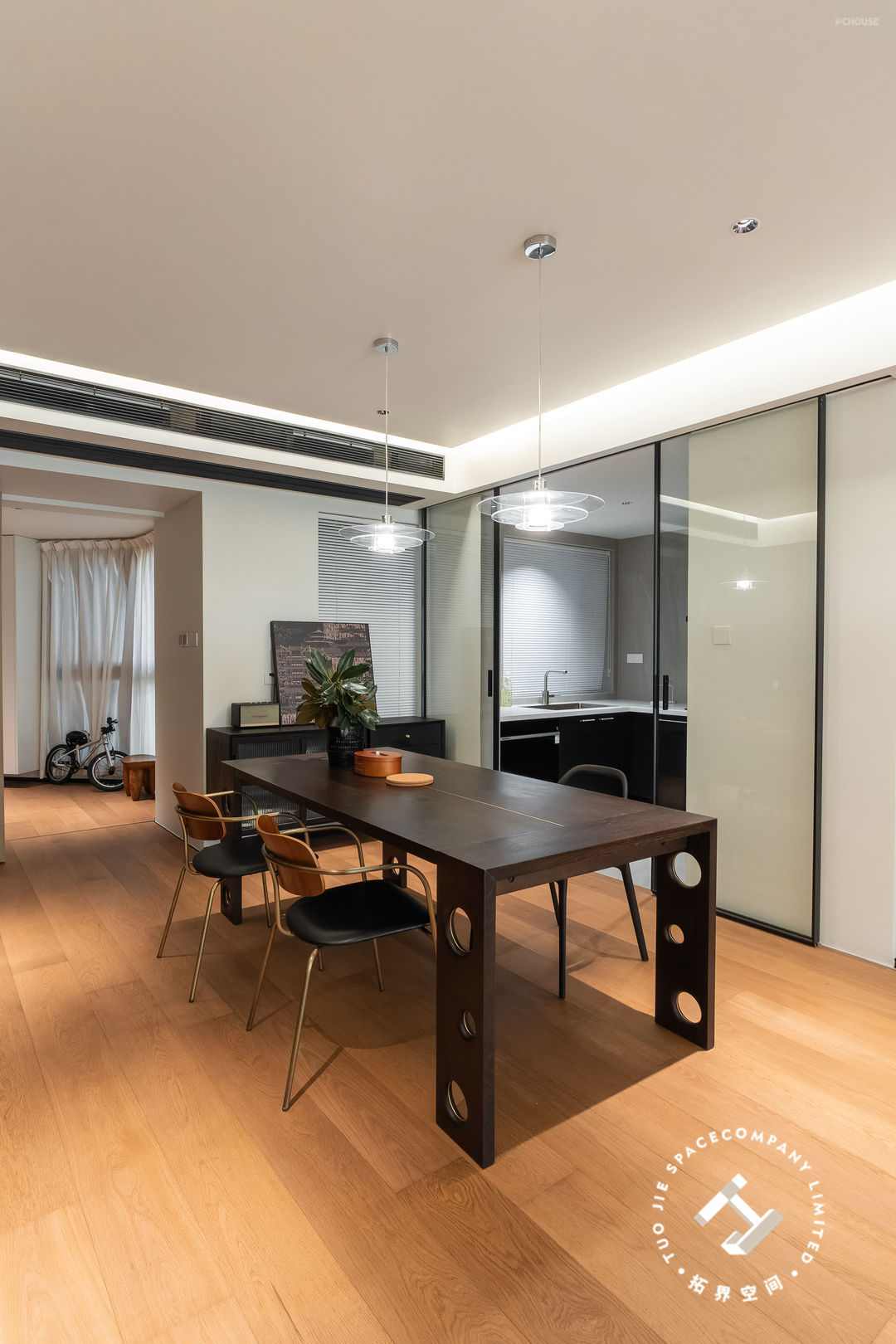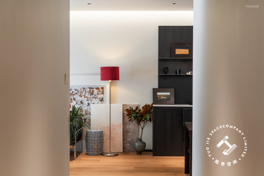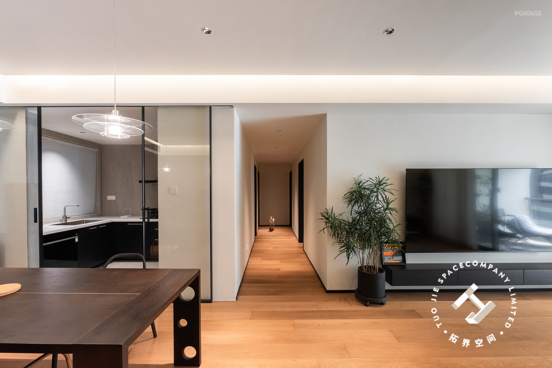 进入客餐厅的隔断是一扇偏轴旋转门,既保持了空间的独立性,开启时又能让空间更具有连贯性和通透性,赋予空间更多的美好与灵活性。