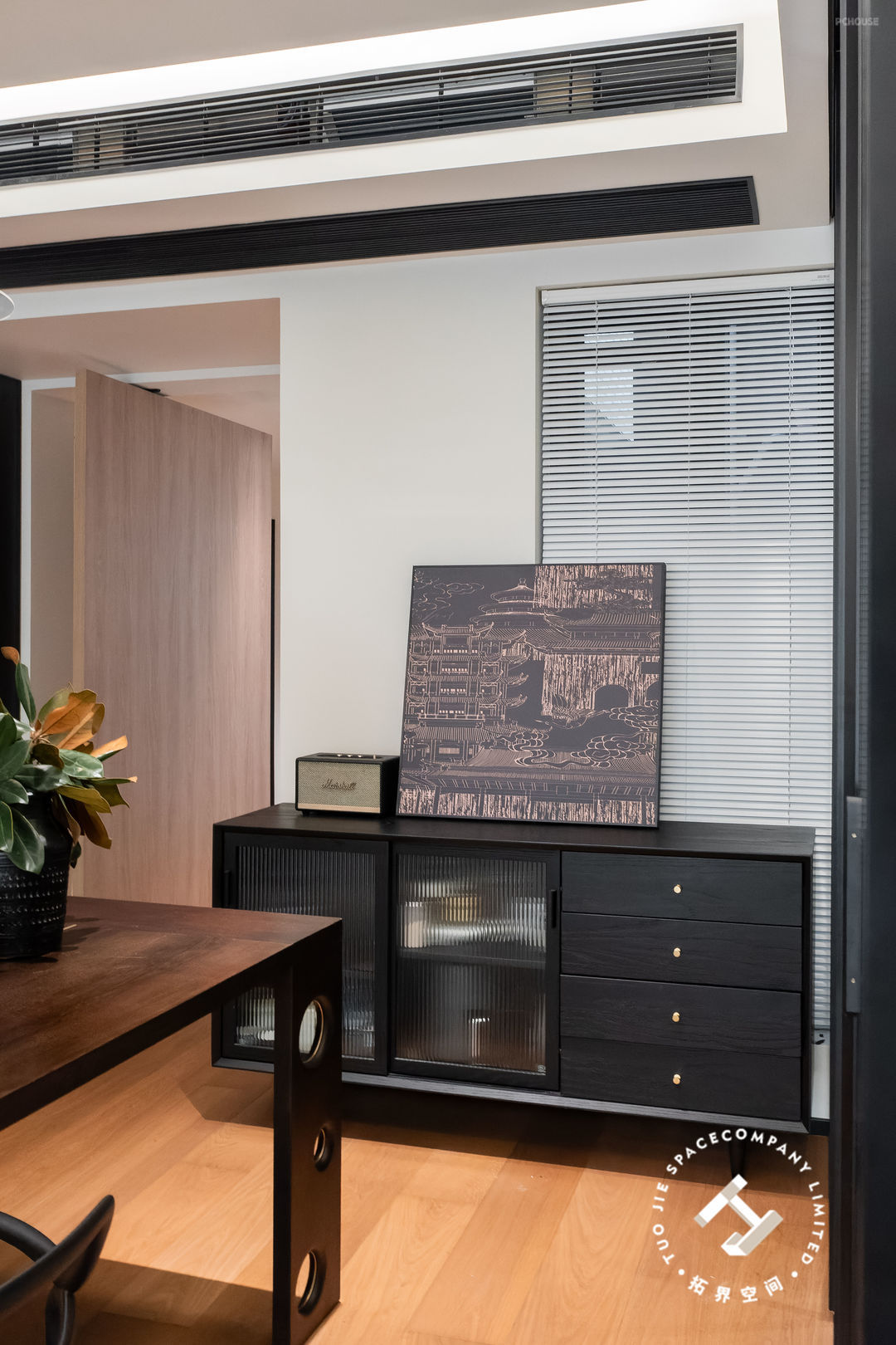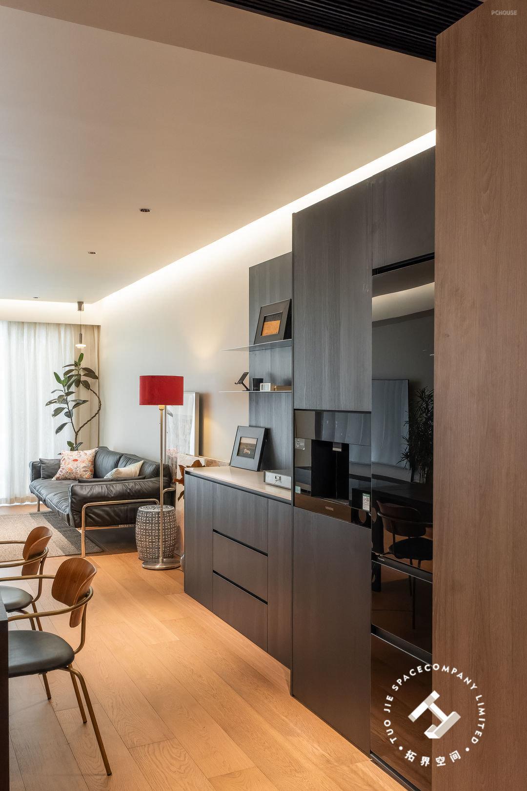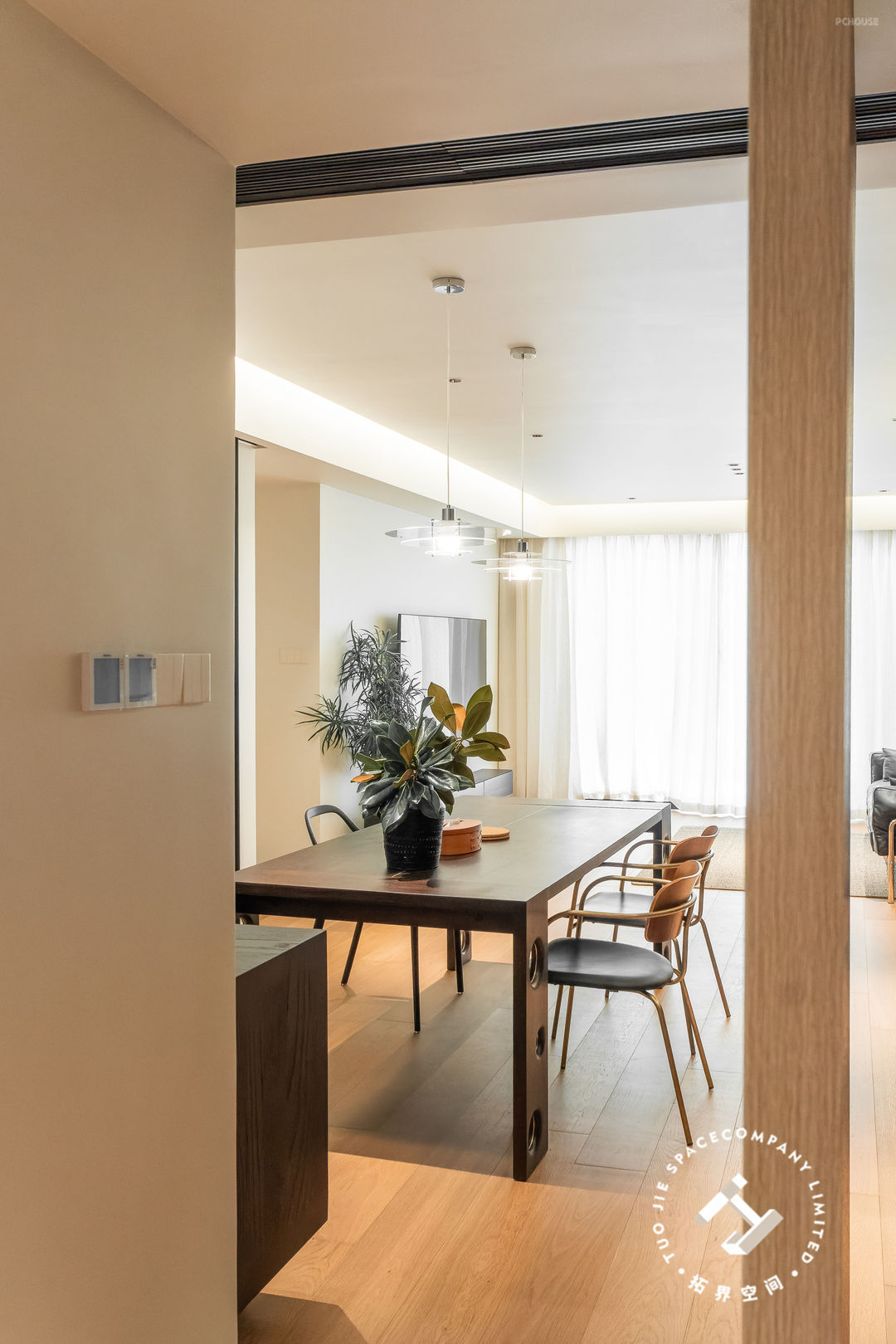 进入客餐厅的隔断是一扇偏轴旋转门,既保持了空间的独立性,开启时又能让空间更具有连贯性和通透性,赋予空间更多的美好与灵活性。