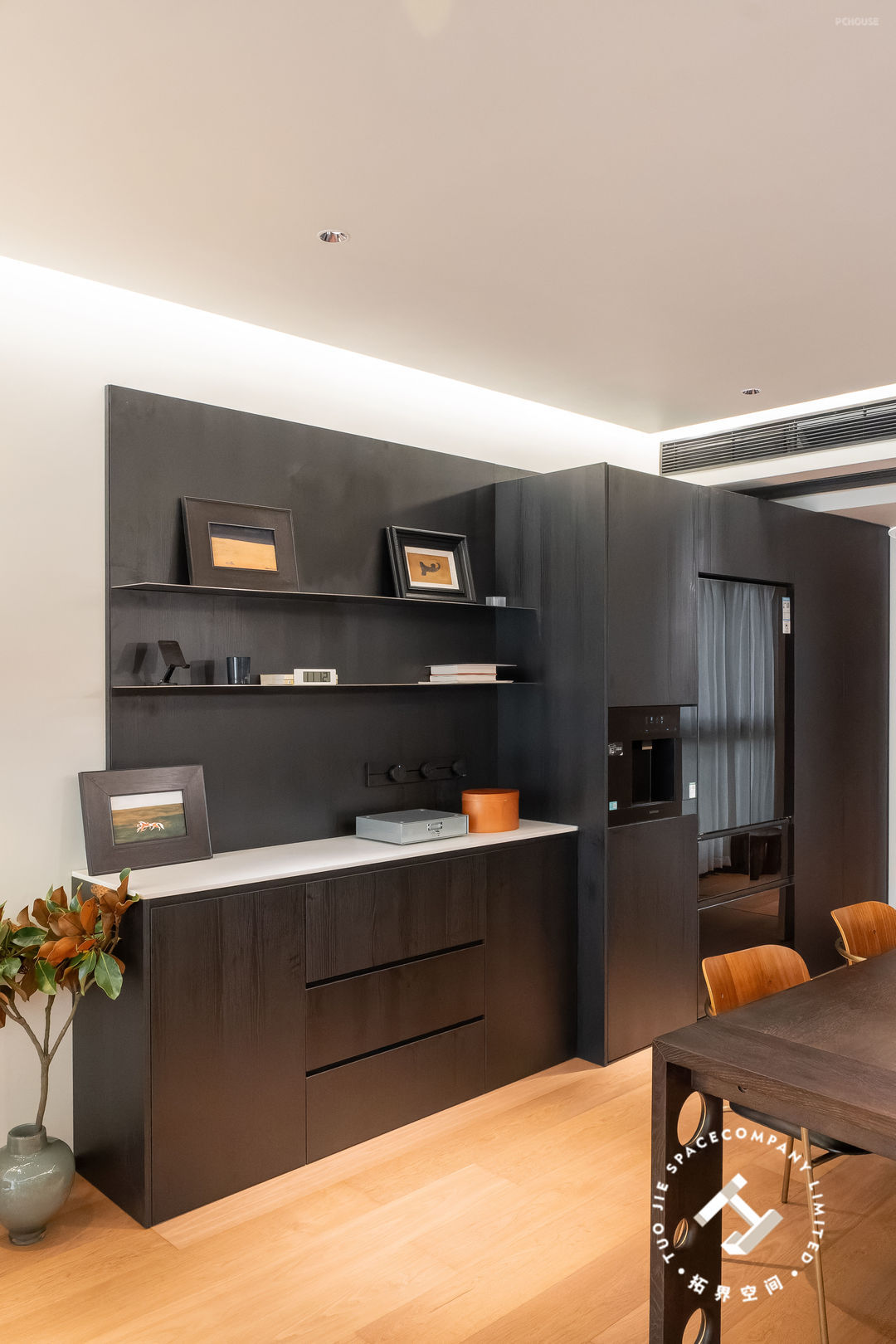 餐边柜区域是以一面黑色木饰面作为打底,再定制同色系的高柜与矮柜组合,巧妙地和整体装修风格融为一体,凸显立体的质感。