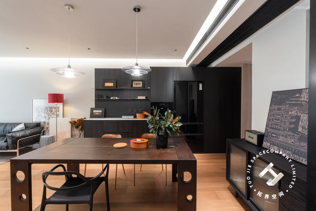 当你来到餐厅区域,就会被这个富有格调的餐厅所吸引,深色黑木材质餐桌与顶部的透明吊灯形成鲜明对比,彰显出空间的层次感与深度。