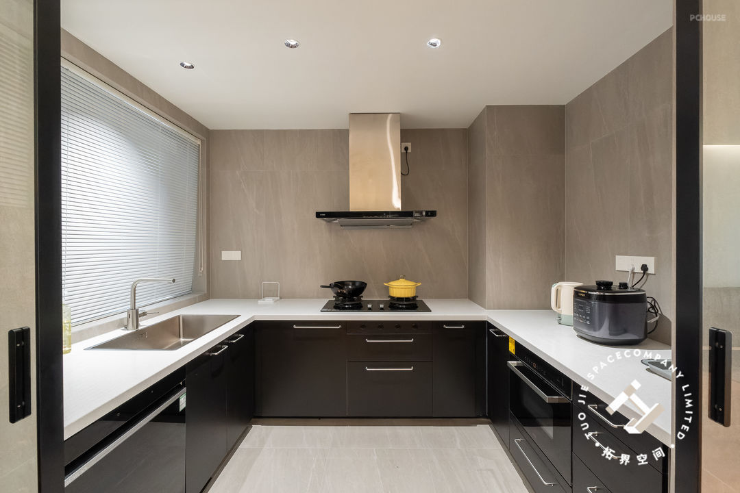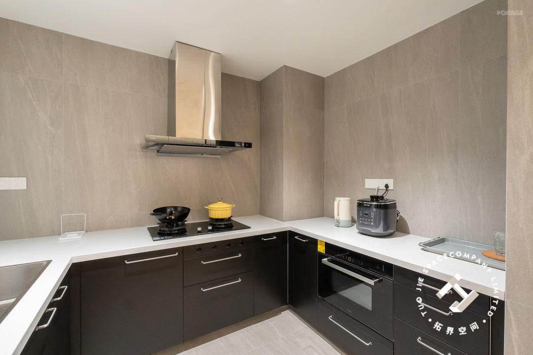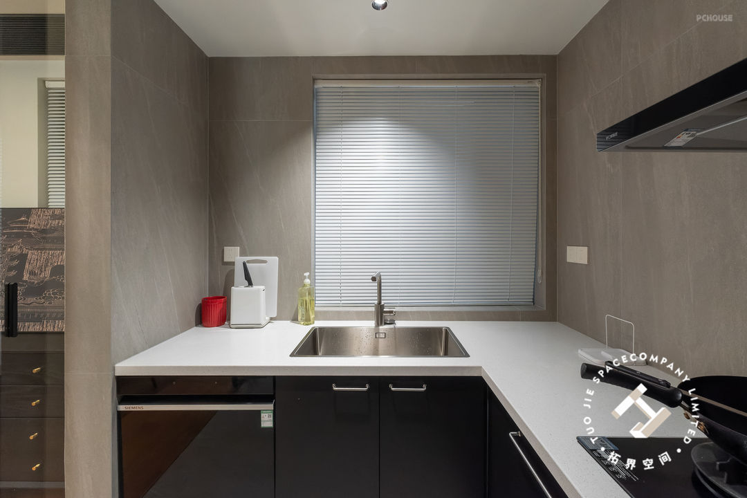 厨房是以灰色墙砖为主,营造一种不张扬却又有股别致的时尚感;橱柜沿着三面墙体定制,呈“U型”布局,舍弃吊柜的做法,简单不压抑。