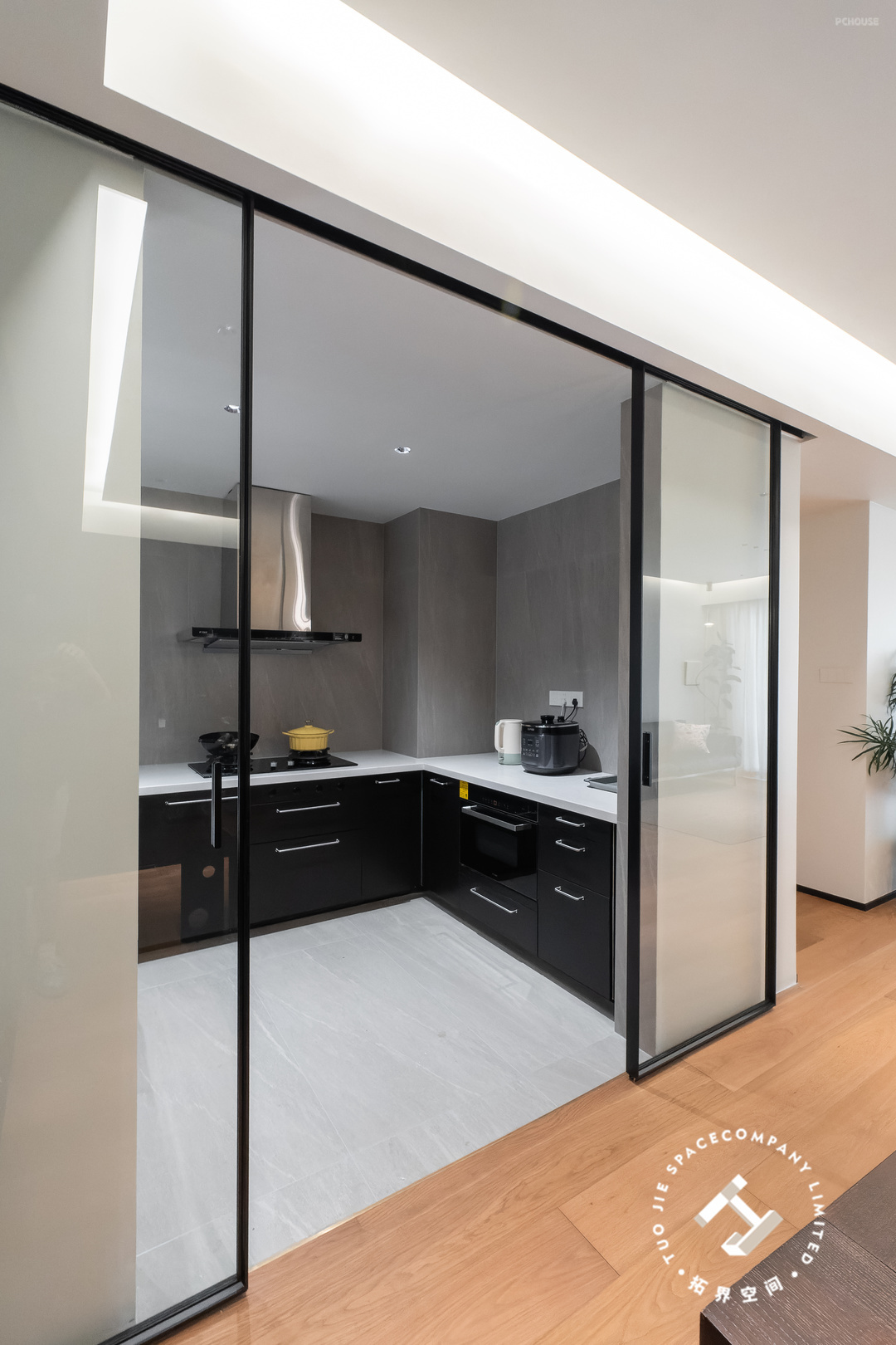 厨房隔断是两扇对开的玻璃推拉门,打开时门隐藏在墙体处,有半开放式的感觉,轨道安装在顶部,减少了许多清洁死角。