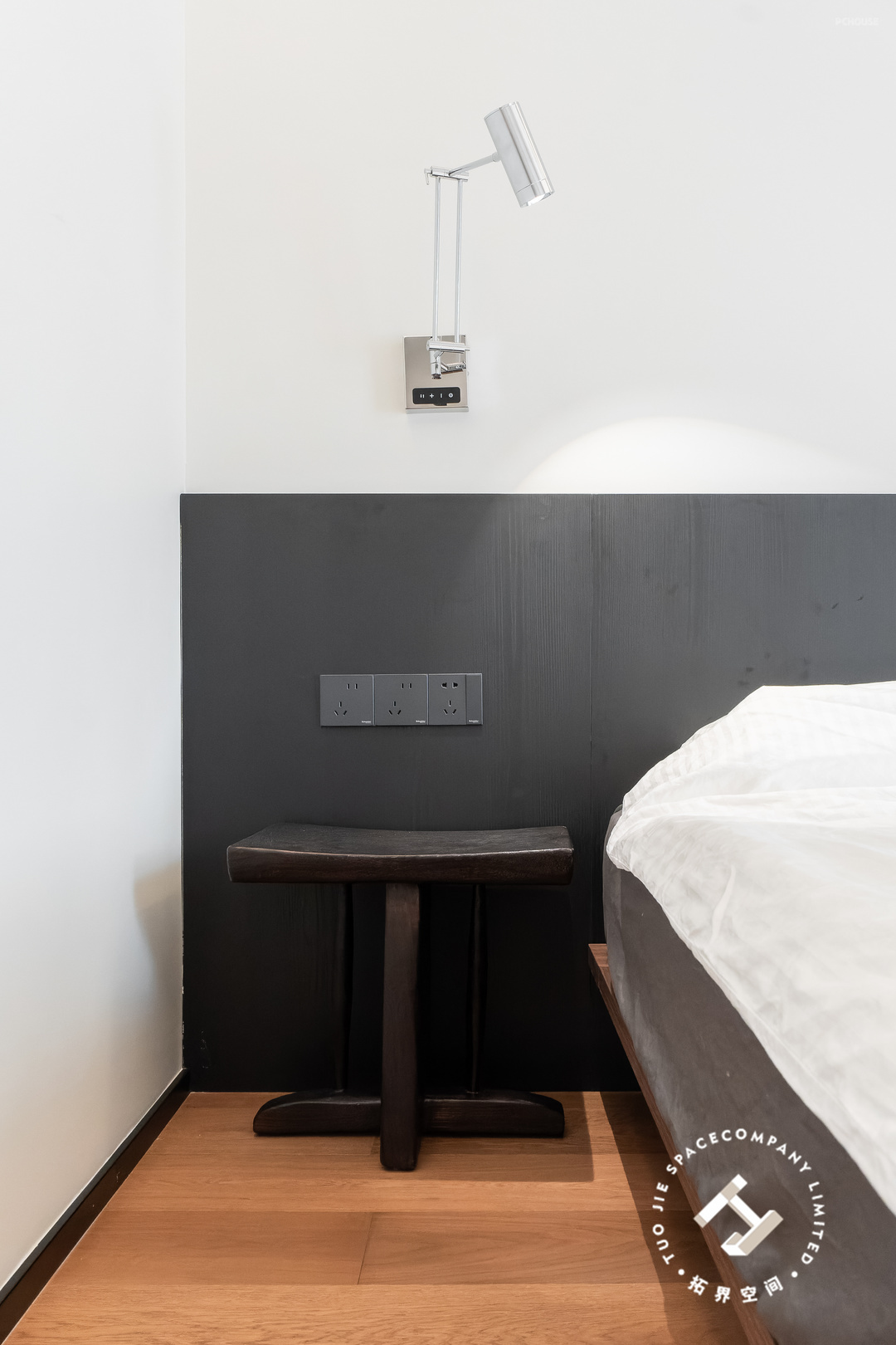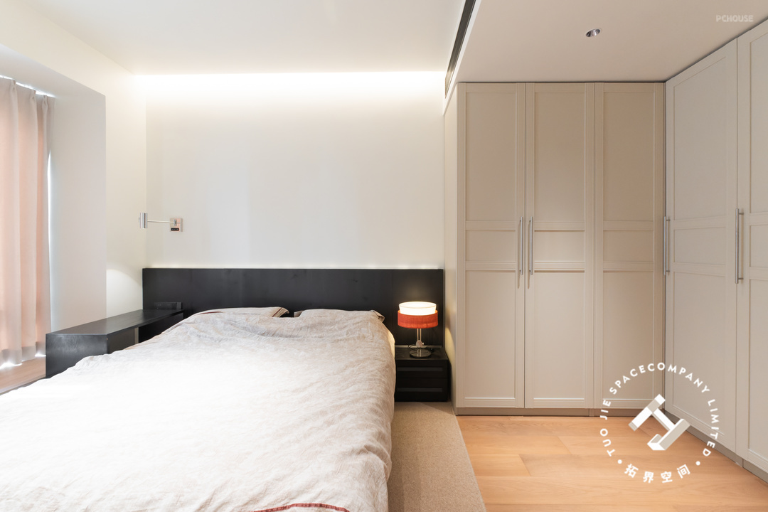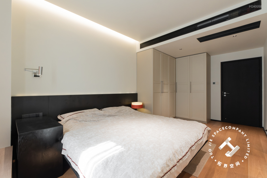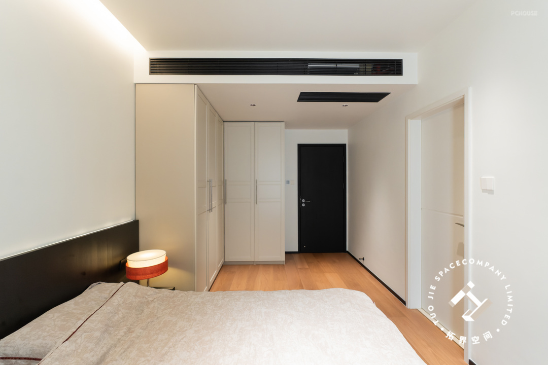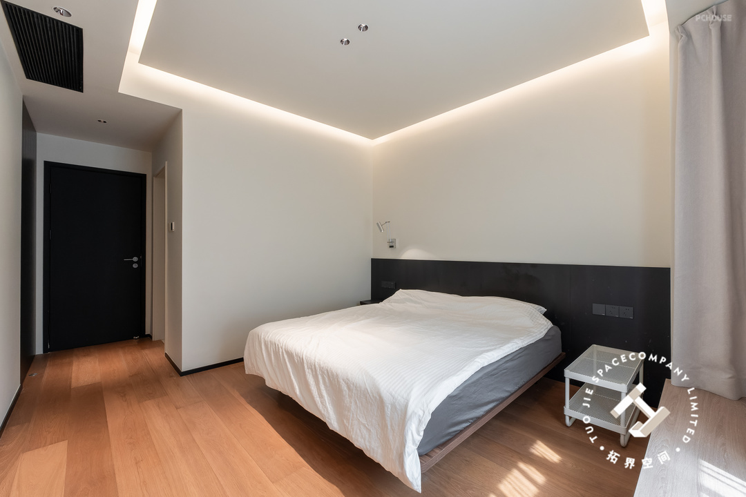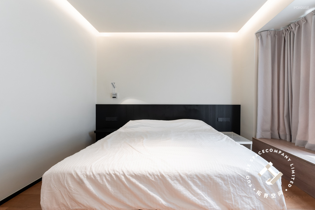 主卧延续整体的风格色调,悬浮吊顶+边吊的组合,不仅拉高了层高也增加了氛围感;床头设计半墙黑色护墙板,与墙体的黑白经典配色,使空间更加鲜明、立体。