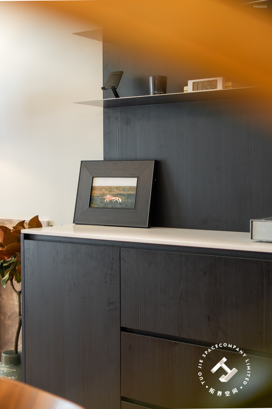 即是餐边柜也是茶水柜,冰箱与茶水机嵌入柜体,让将空间视觉形成了和谐统一的效果;矮柜上方还安装了两层搁板,展示画框与装饰摆件,带来更多精彩的观感。