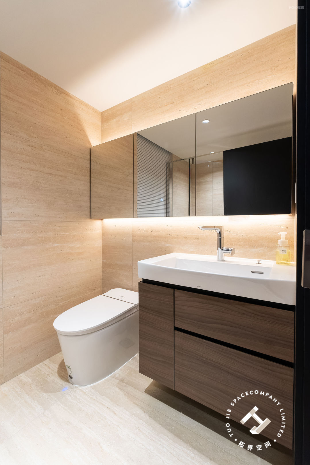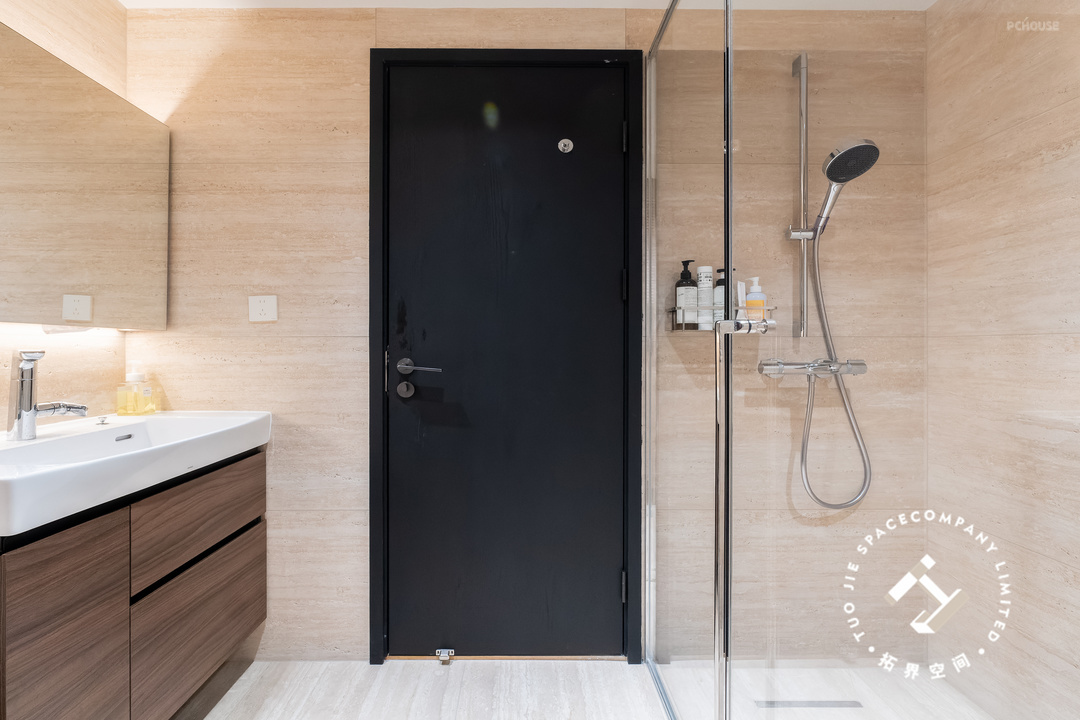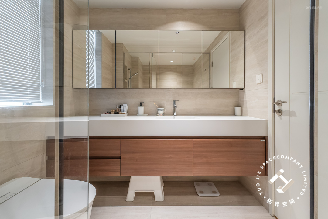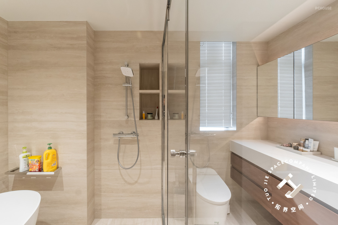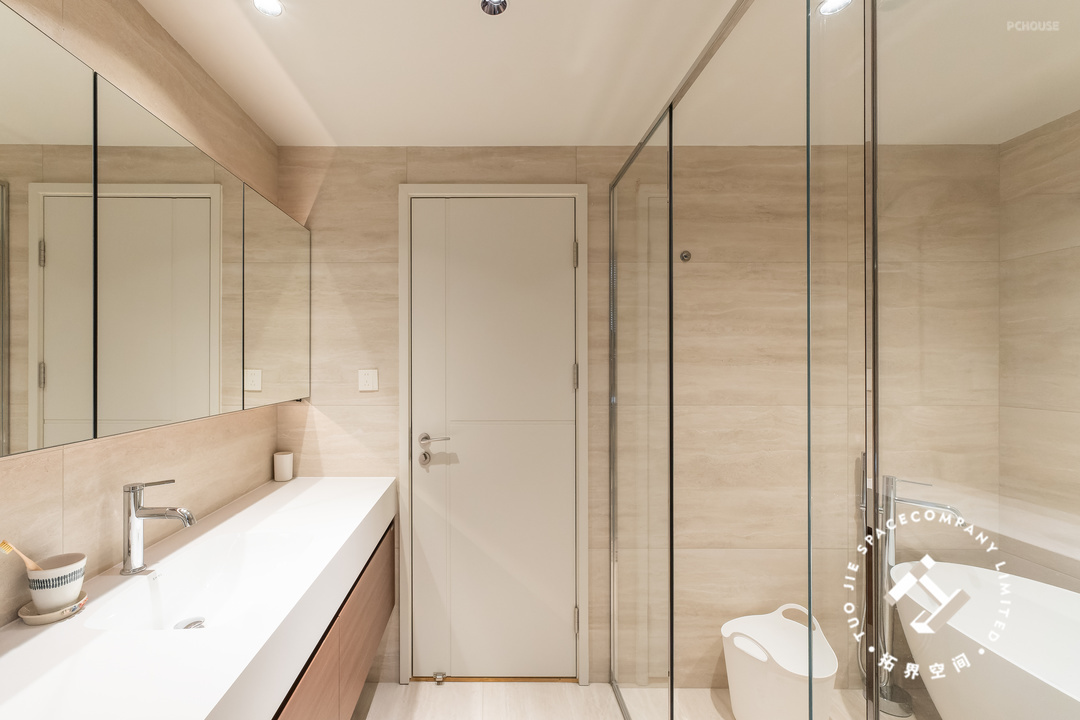 这个家一共设计了三个卫生间,家里的成员都有自己的独立浴室;均以洞石瓷砖通铺,以独特而丰富的纹理、色调,展现出无尽的自然魅力。