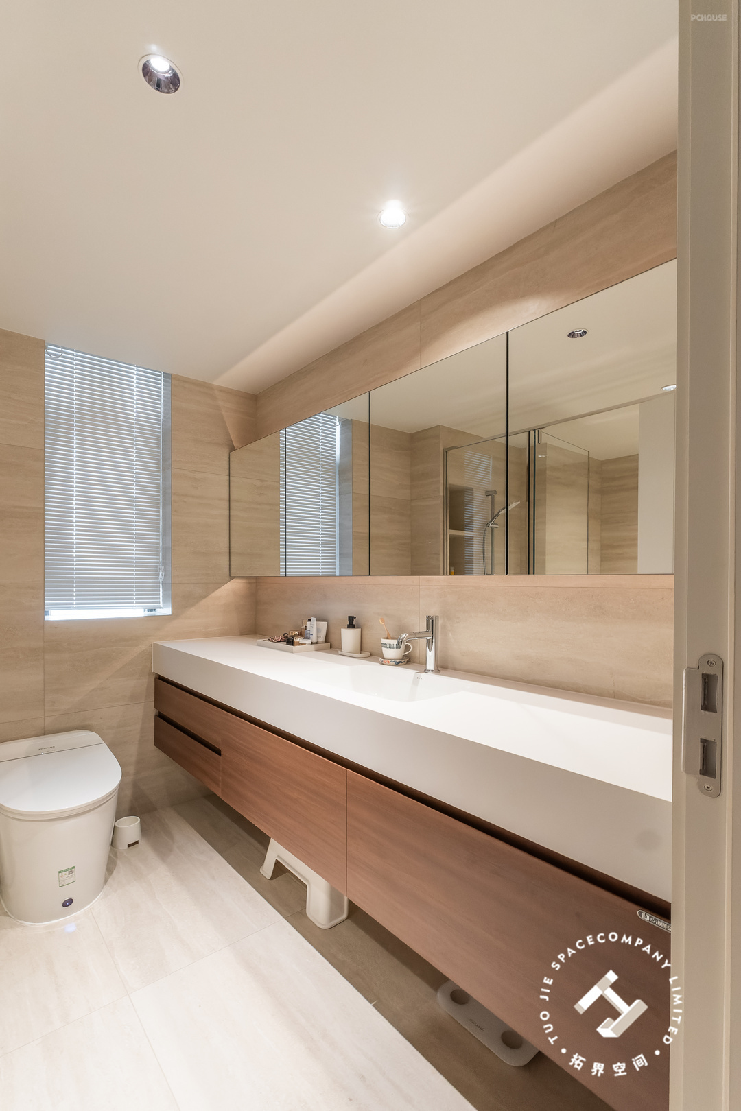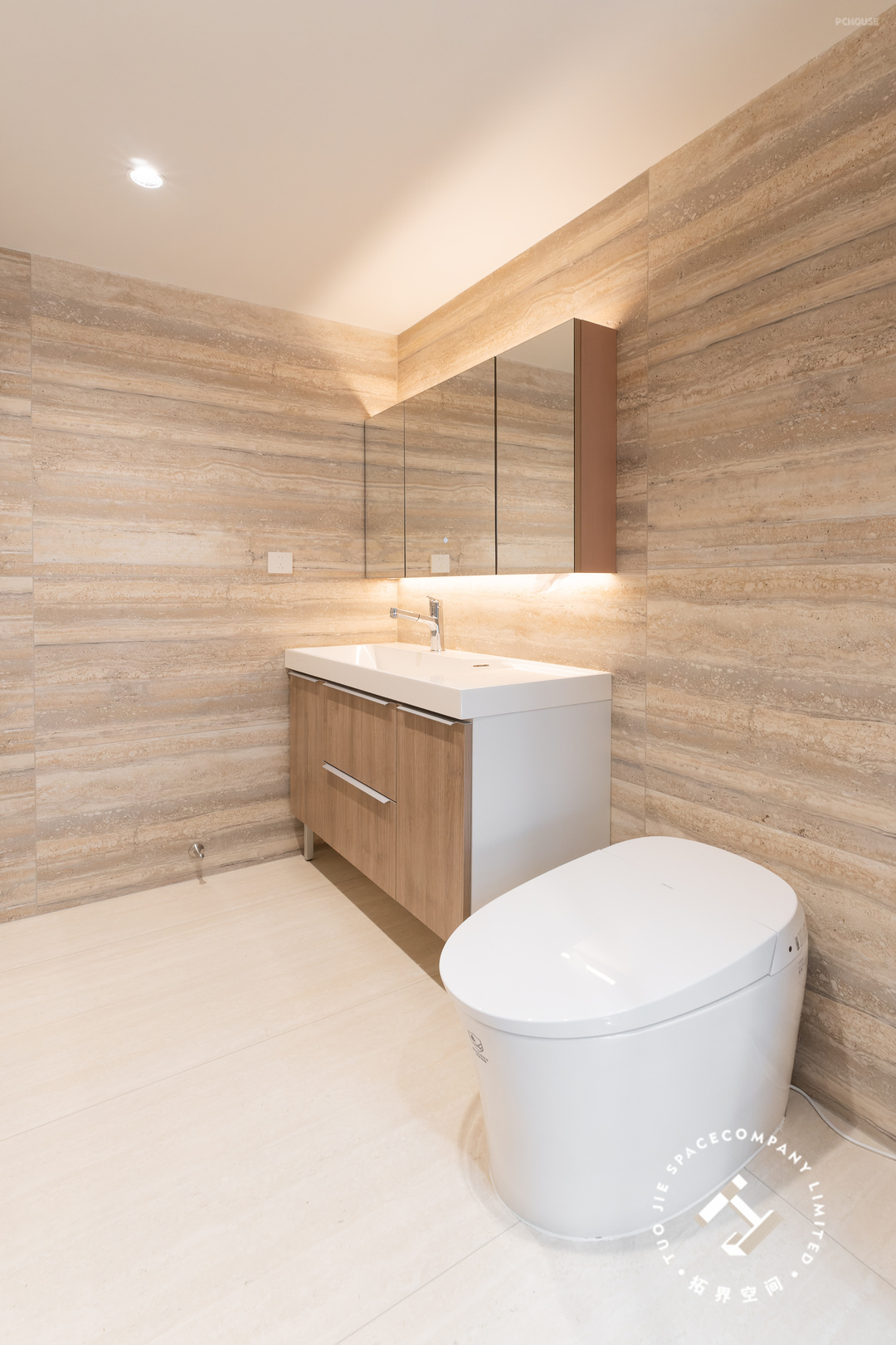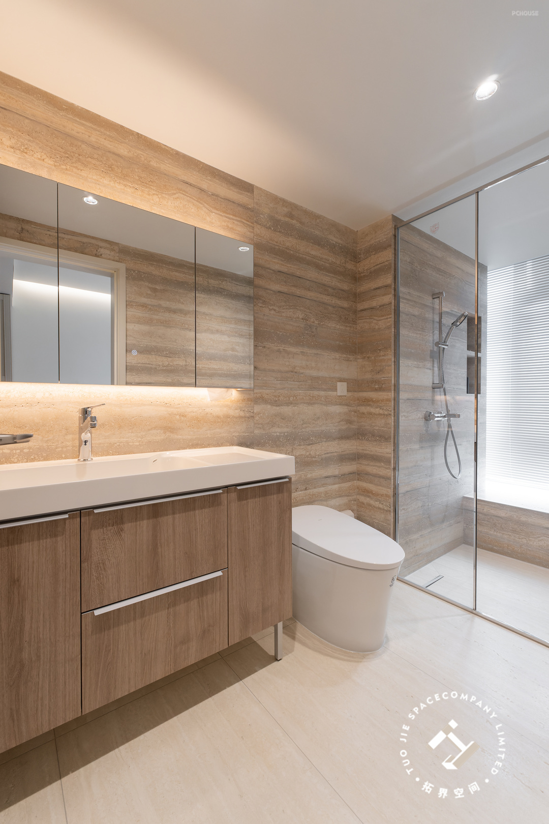 这个家一共设计了三个卫生间,家里的成员都有自己的独立浴室;均以洞石瓷砖通铺,以独特而丰富的纹理、色调,展现出无尽的自然魅力。
