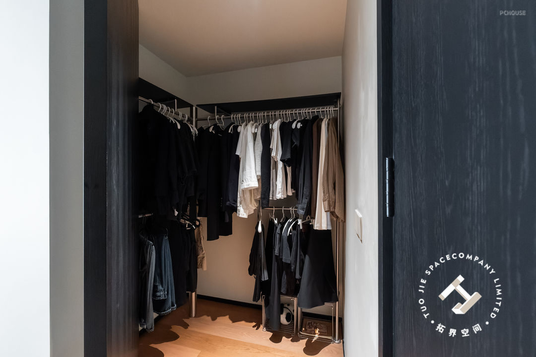 引用玄关偏轴旋转门的设计,在衣帽间做一道隔断门,赋予整体空间高级感;内部做开放式布局,减少空间的压抑感,拿取衣物也比较方便。