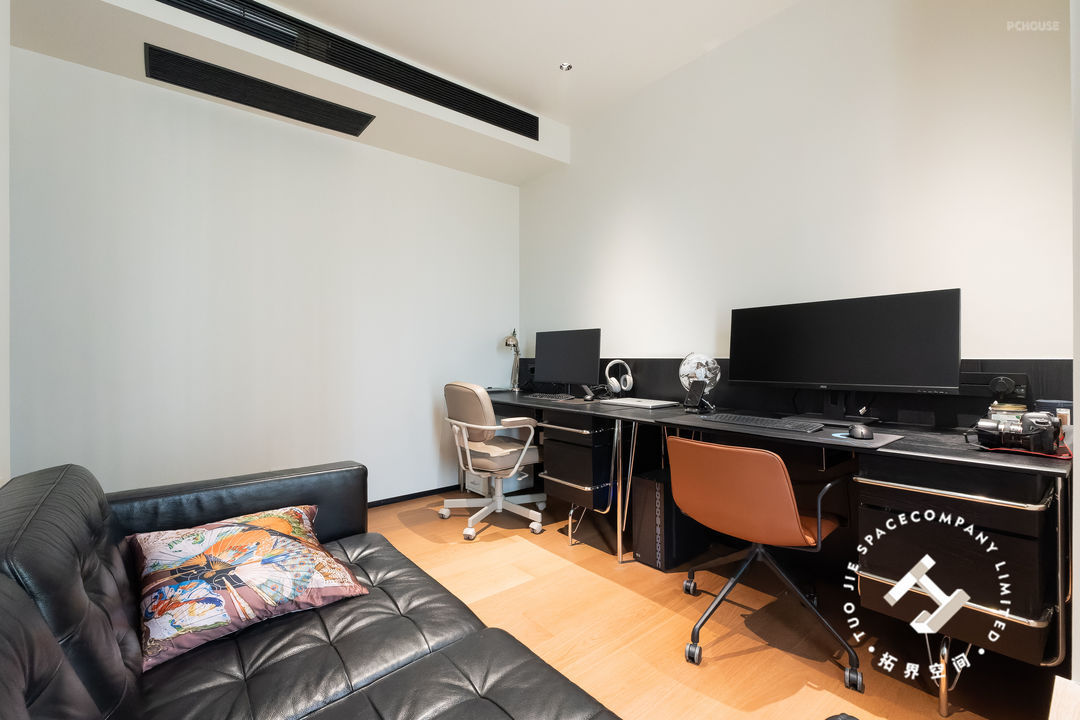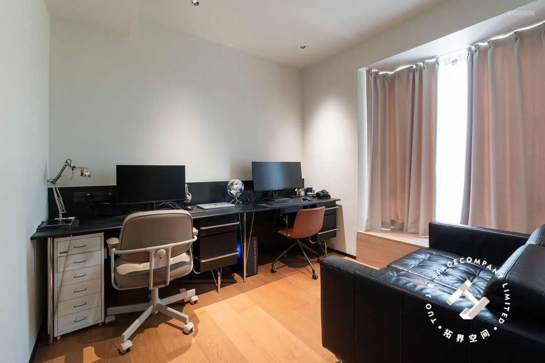 书房结合了办公与休闲功能,沿墙定制双人大书桌,黑色的桌面与木地板形成鲜明对比,有种稳重而惬意的感觉,办公、看书都能沉浸下来。