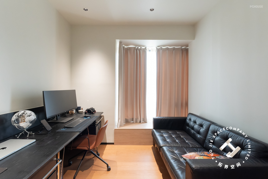 书桌背后是休闲的沙发,可以是陪伴家人办公的一角,也可以是午后看杂志的角落,有种自在随性的家居氛围。