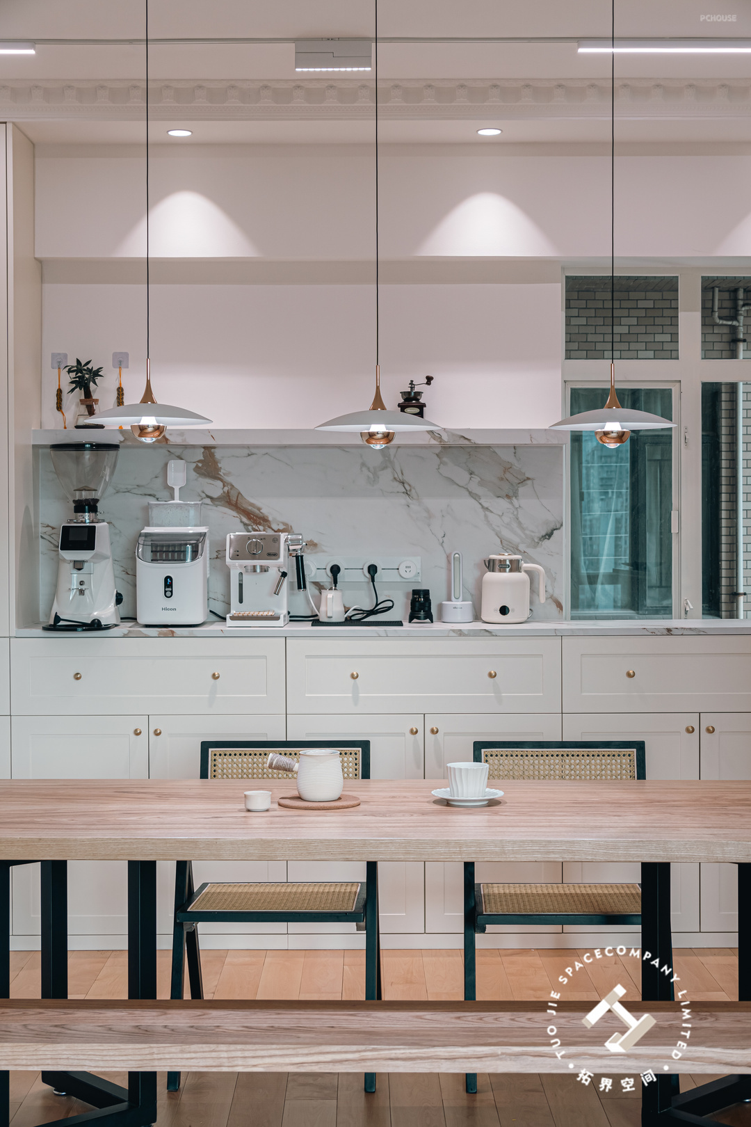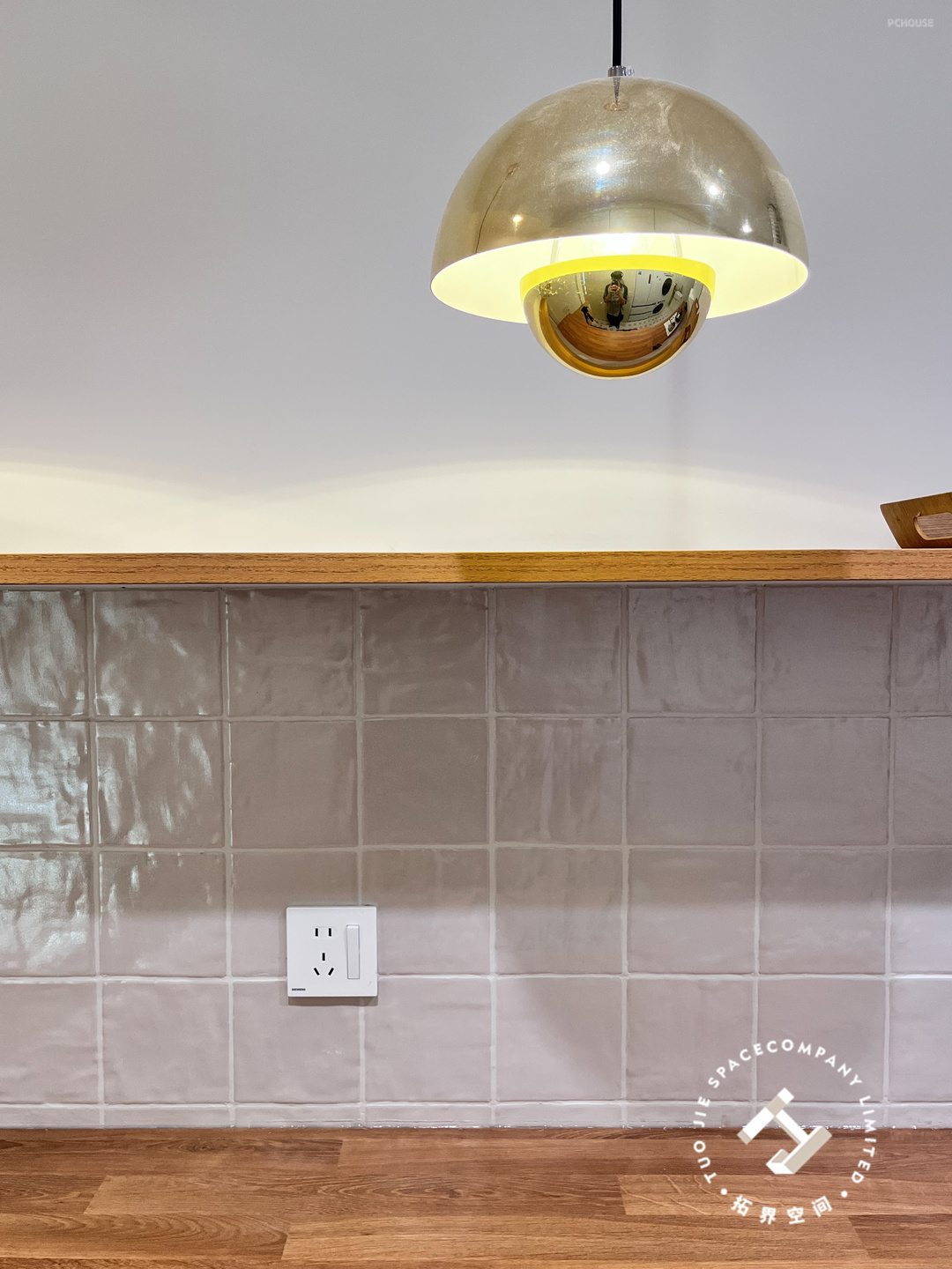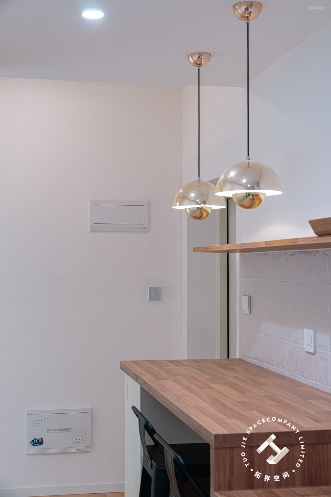 在玄关和橱柜之间用木板搭建一个简易吧台,搭配两盏暖色小吊灯,增加生活的仪式感,也可以充当橱柜台面的延伸,墙面安装搁架,收纳精致的杯子和出入的小物件。