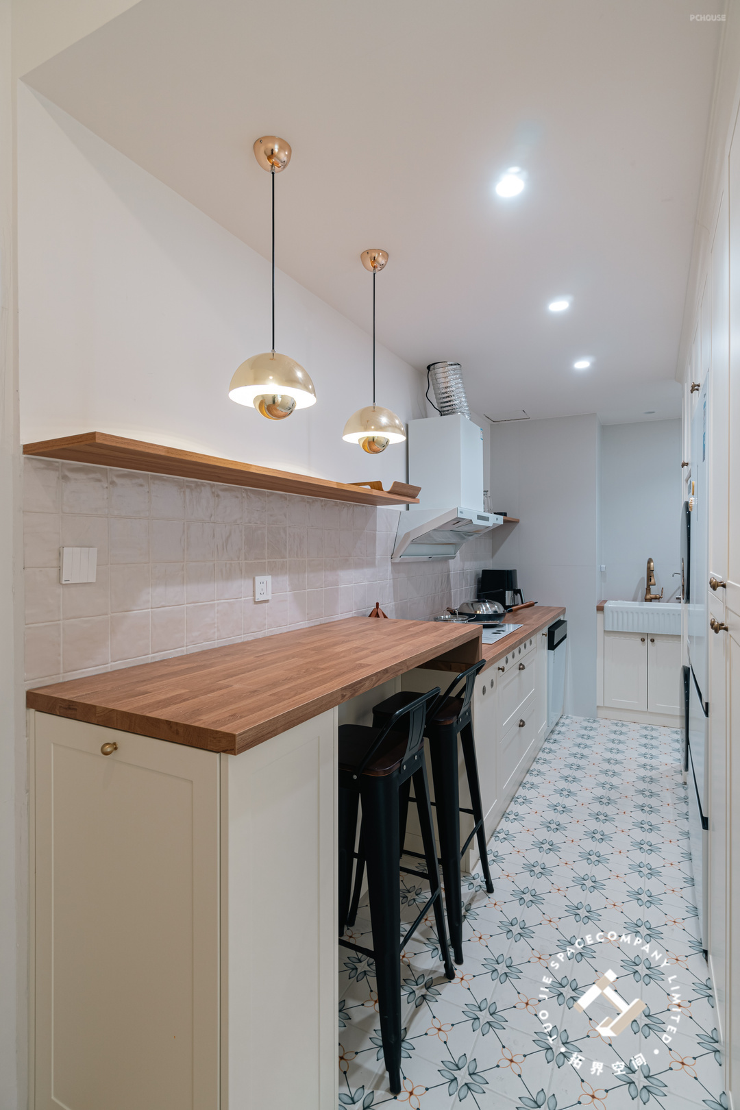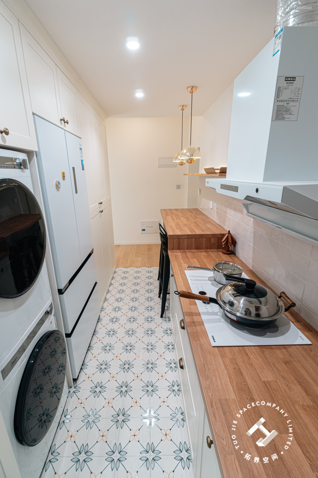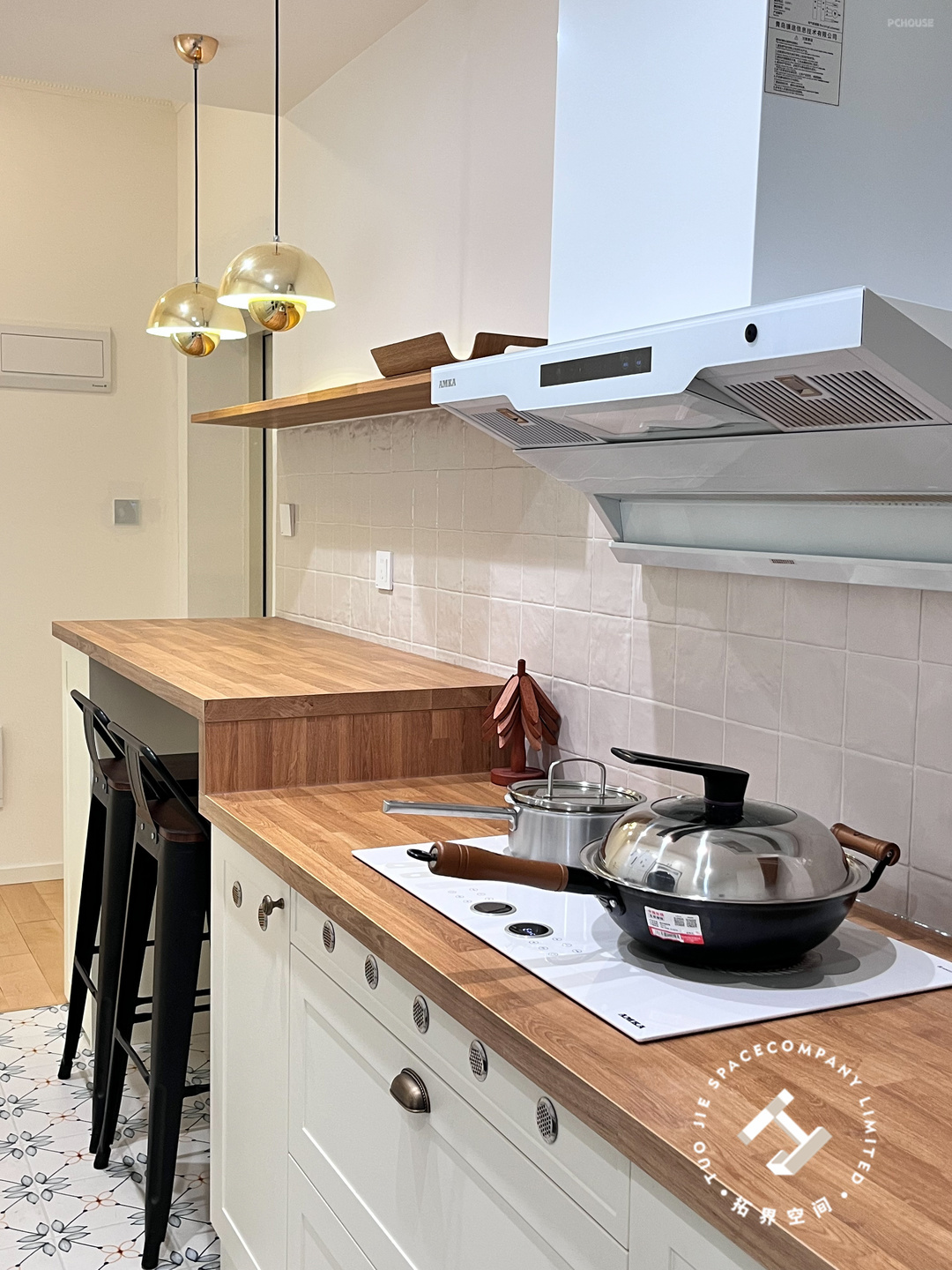 半开放式的厨房减去了吊柜的做法,即使是狭长的空间也能舒适宽敞;米白色橱柜搭配木纹台面、半墙釉面手工砖,使得空间充满了温馨治愈的氛围。