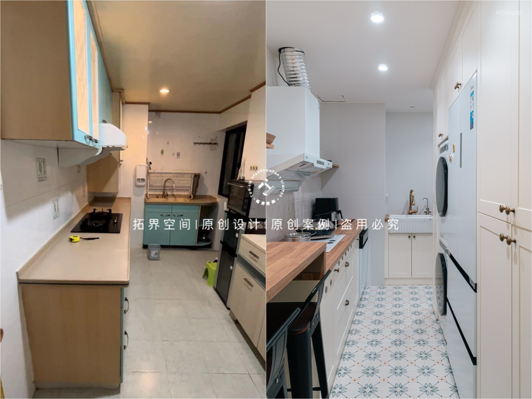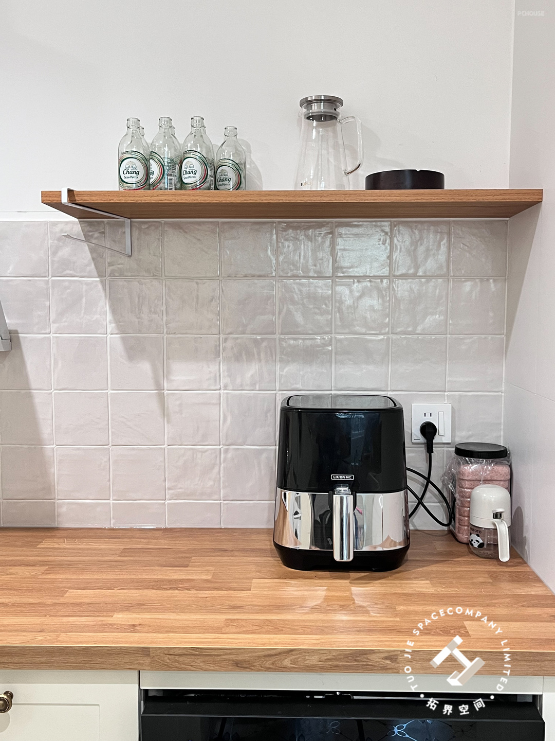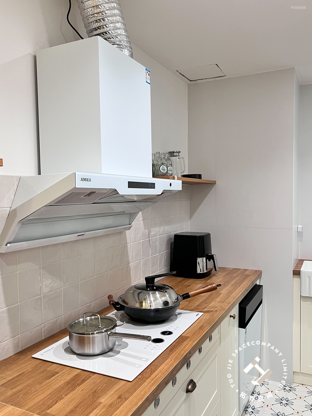 半开放式的厨房减去了吊柜的做法,即使是狭长的空间也能舒适宽敞;米白色橱柜搭配木纹台面、半墙釉面手工砖,使得空间充满了温馨治愈的氛围。