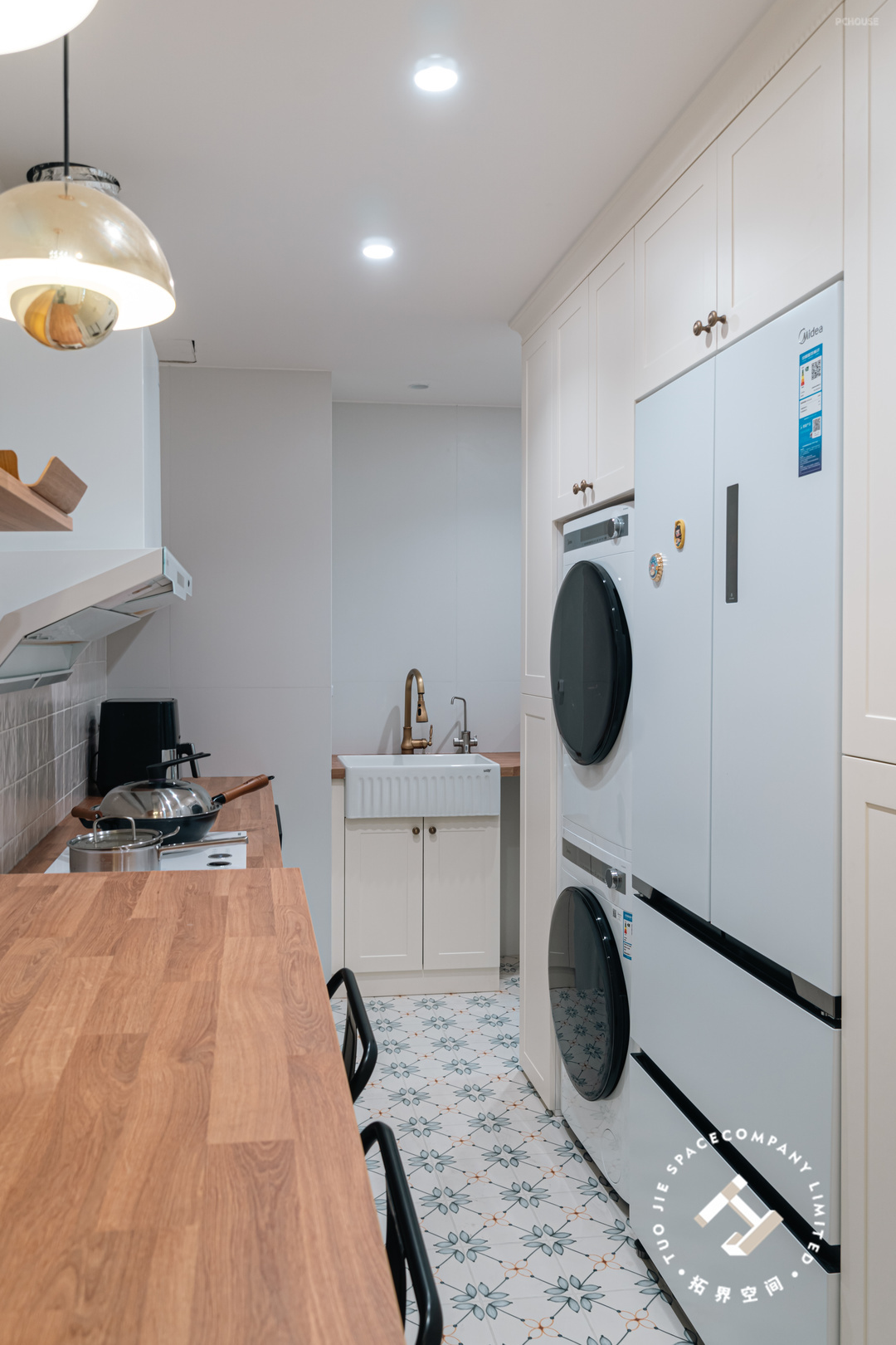 橱柜对面打造满墙的家政柜,大型的冰箱、洗衣机烘干机都嵌入其中,收纳与颜值同时在线,还有转角柜设计,家中的杂物和换季的鞋物通通收起来。