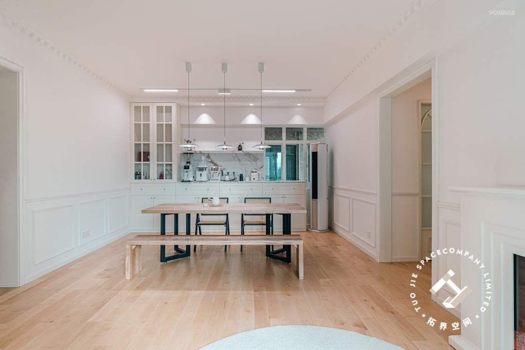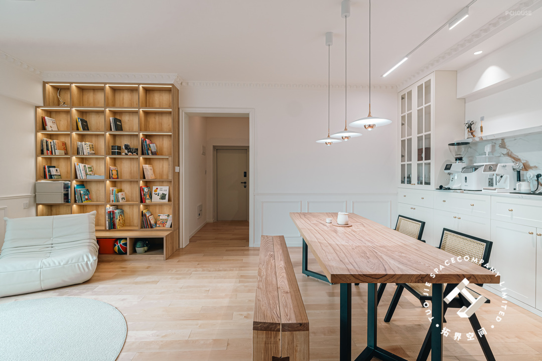 长桌和长凳的布置,可容纳多人一起用餐,业主平时也喜欢坐在这办公;橡木色与整体的风格色调融合,使得餐厅区域更具有温度,更为精致。