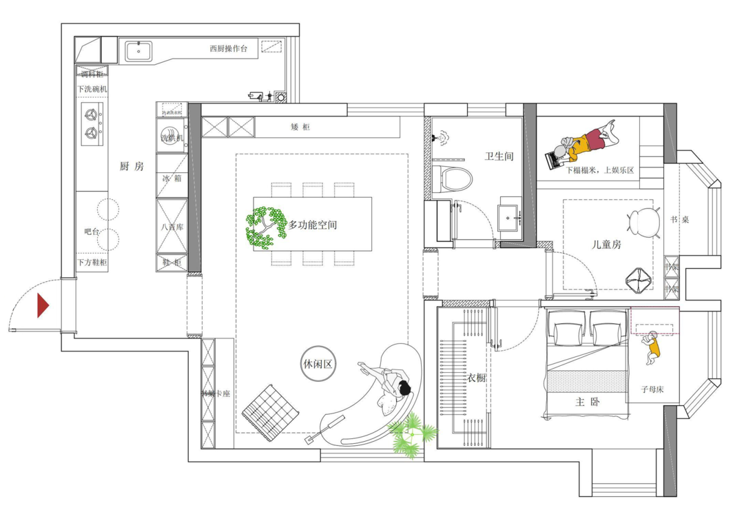 前言: 业主是四口之家,喜欢温柔浪漫的家;想要个可以画画的空间,还要有大书架;平时喜欢小酌一杯,有个吧台或许会很不错。