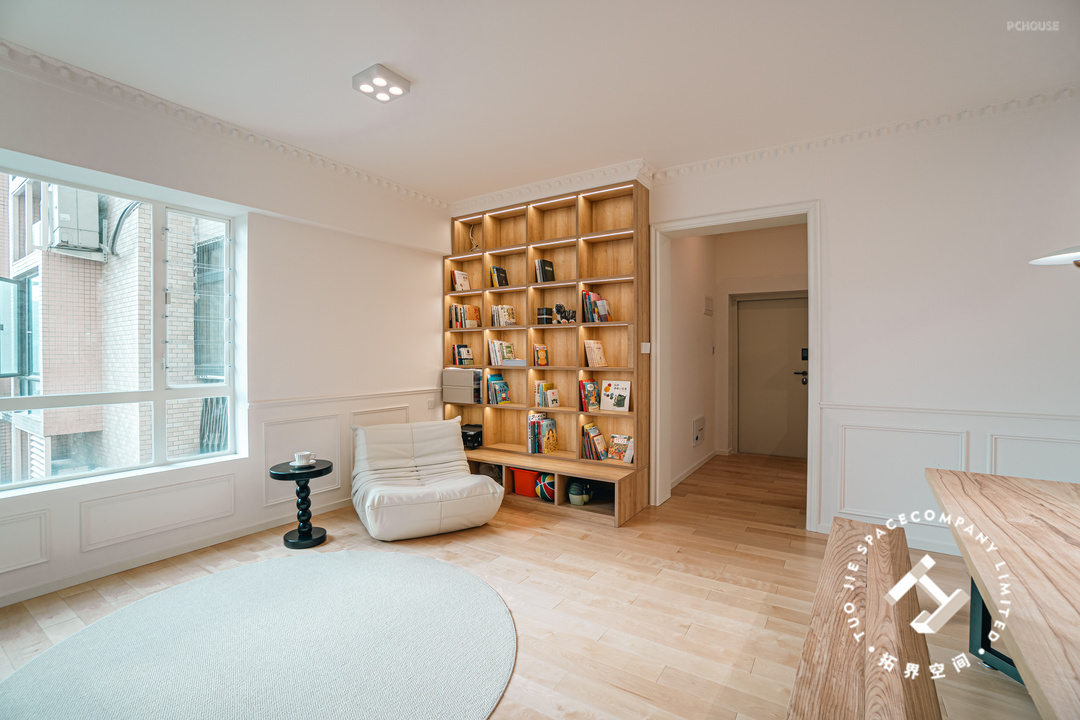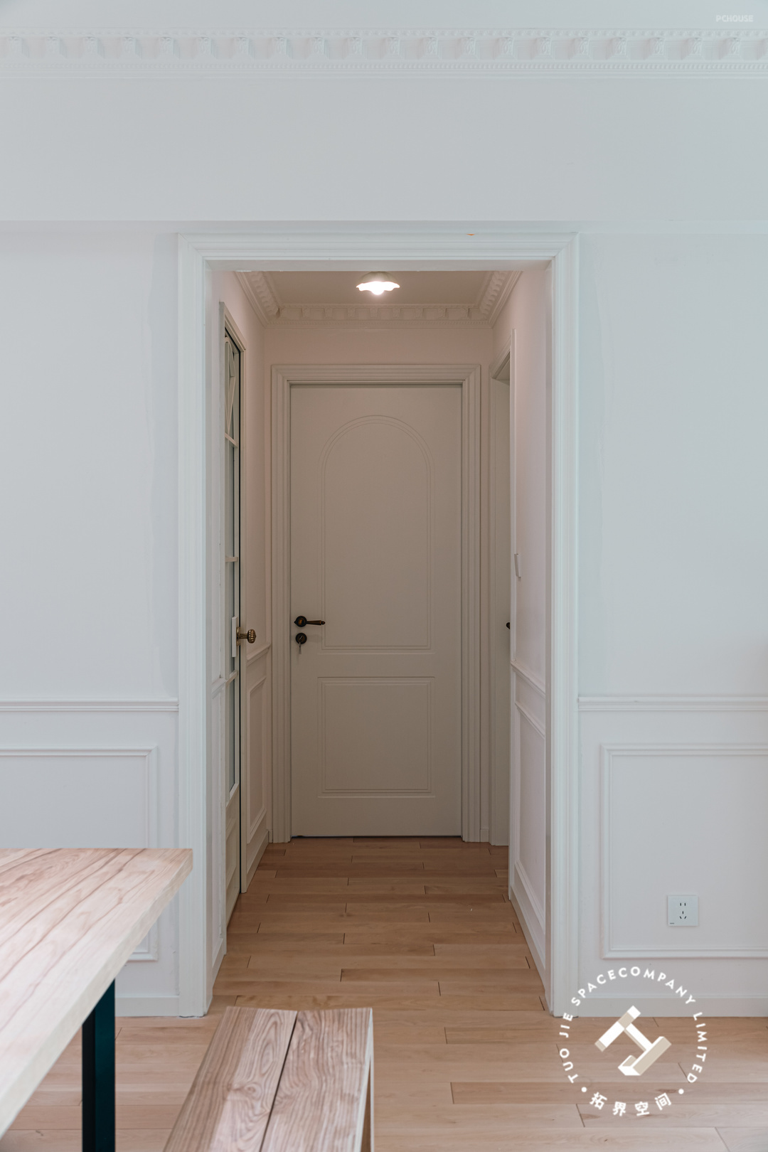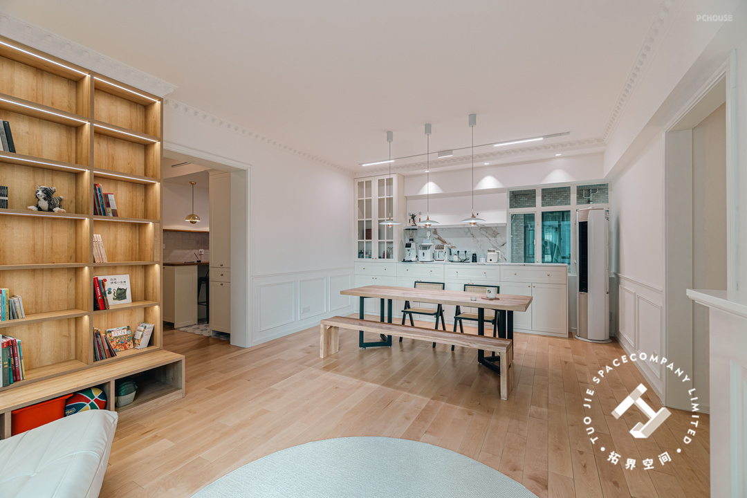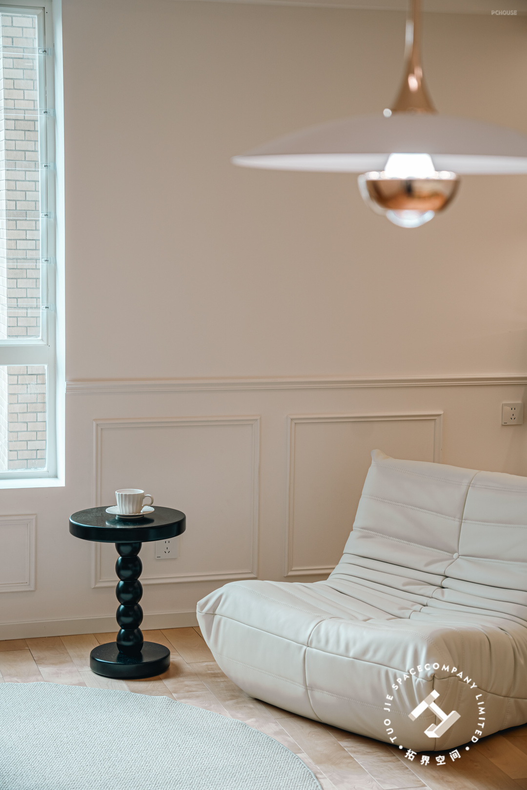 整屋通铺木地板,奶油白色的墙顶漆和四周环绕的简约石膏线,视觉上给人一种精致清爽的感觉,也有种恰到好处的松弛感。