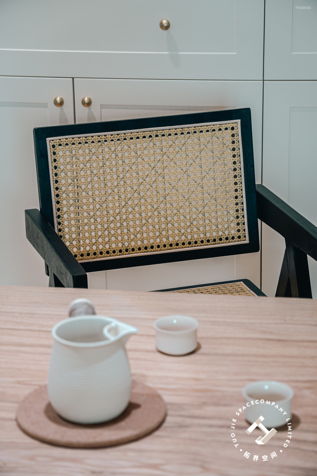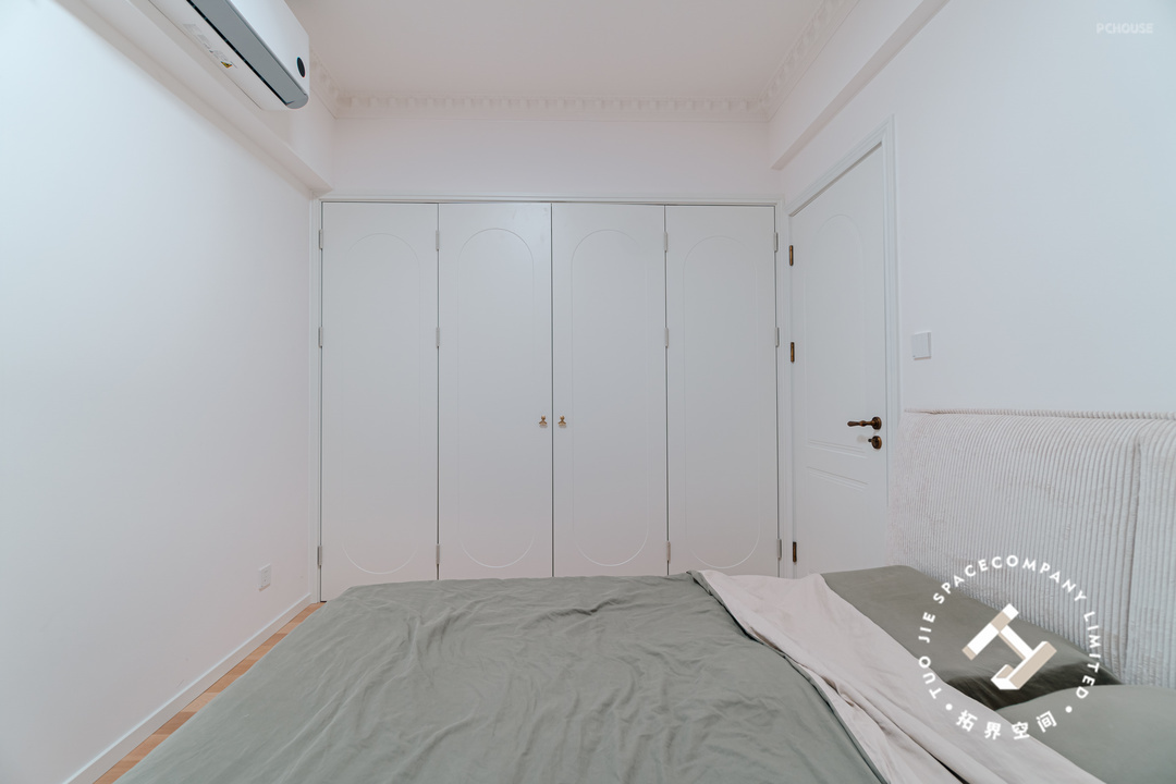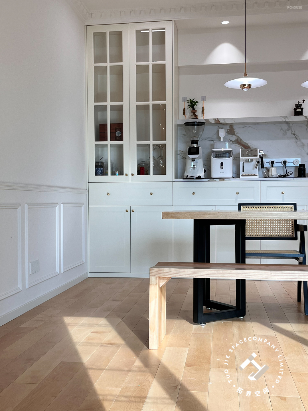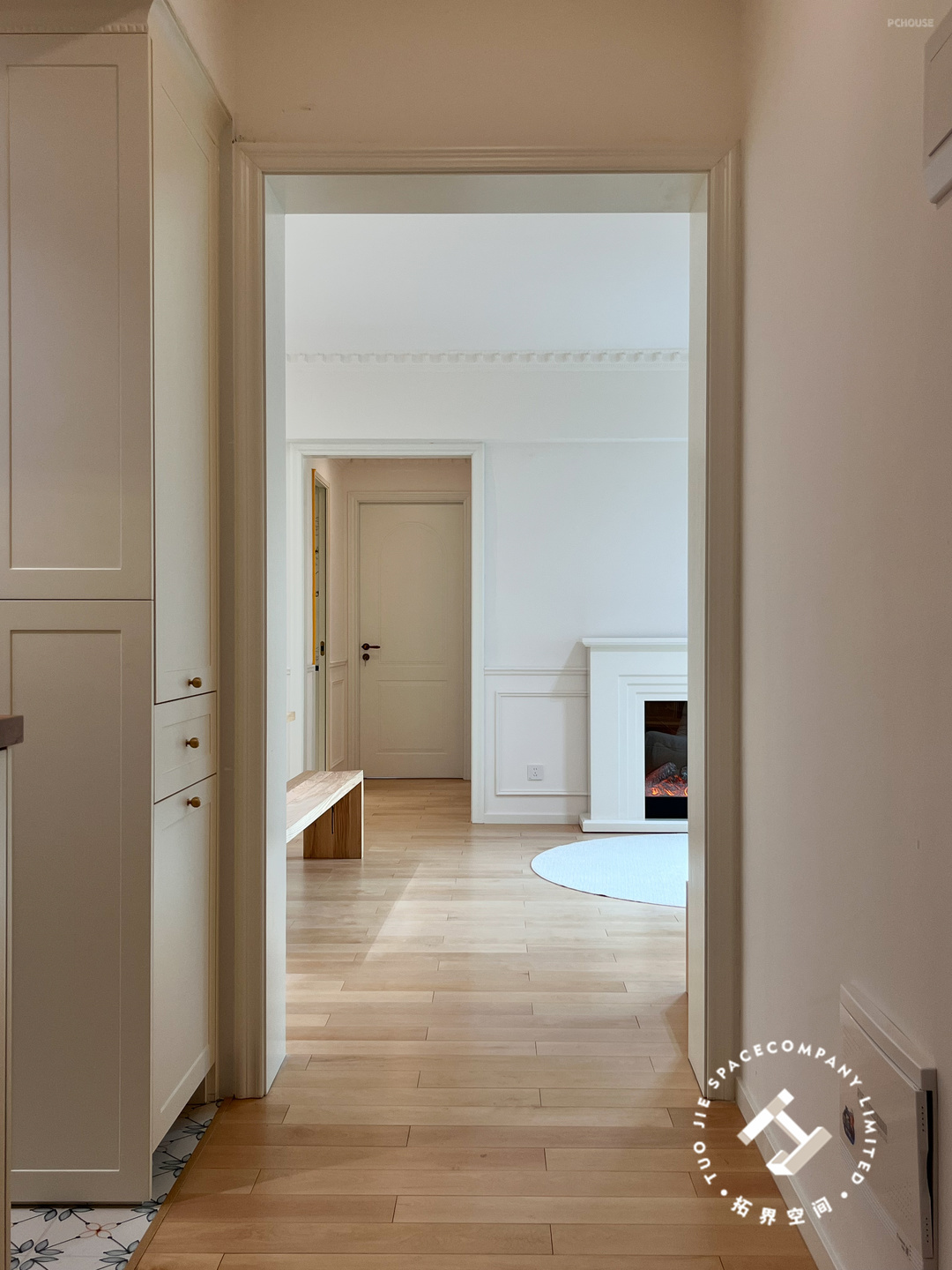 整屋通铺木地板,奶油白色的墙顶漆和四周环绕的简约石膏线,视觉上给人一种精致清爽的感觉,也有种恰到好处的松弛感。