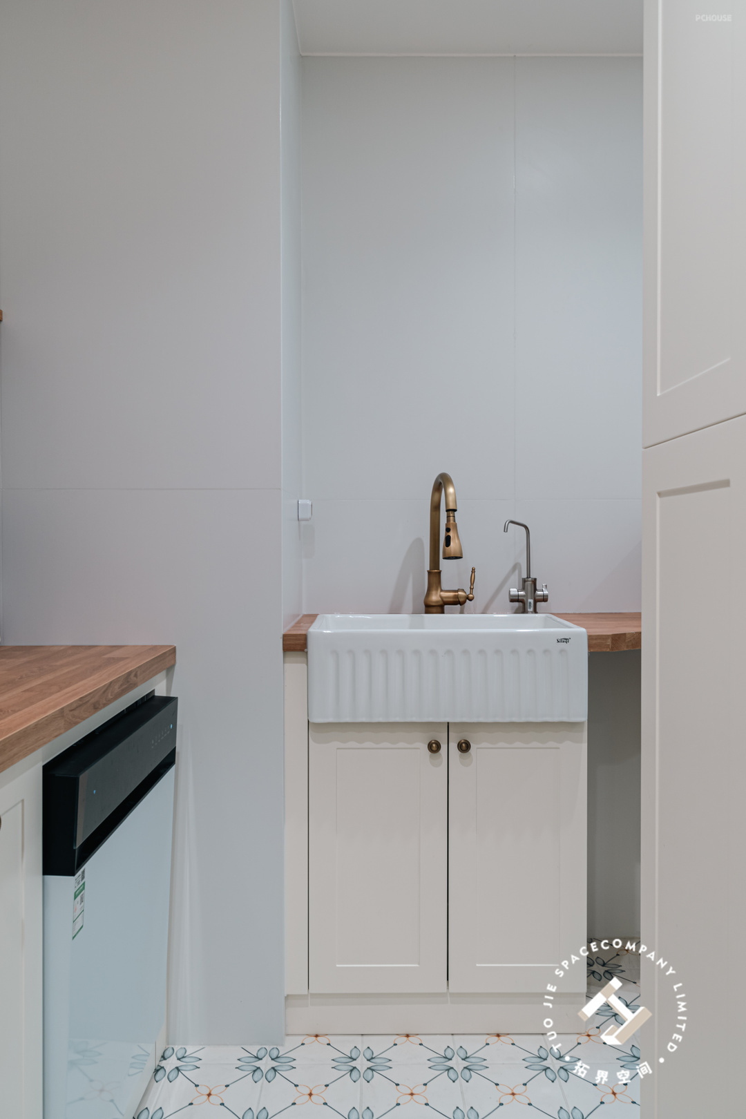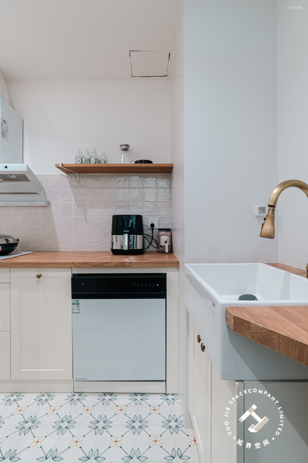这一片区域地面铺设了小花砖,与其它区域有明显的划分,个性氛围感十足;半嵌入式法式单槽设计,打破橱柜规规矩矩的布局,增添一份艺术气息。