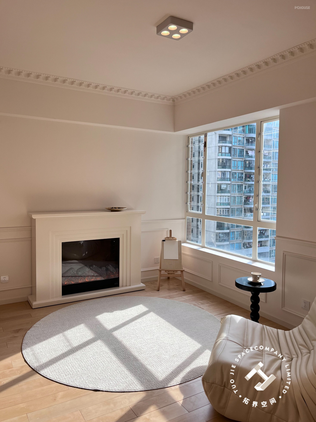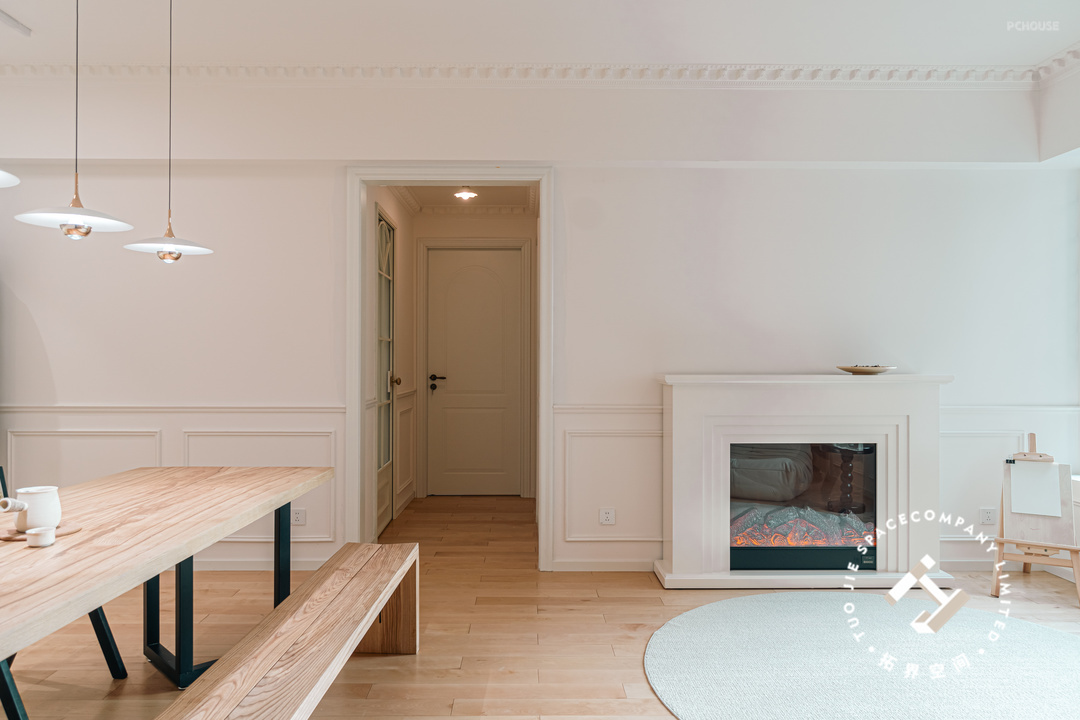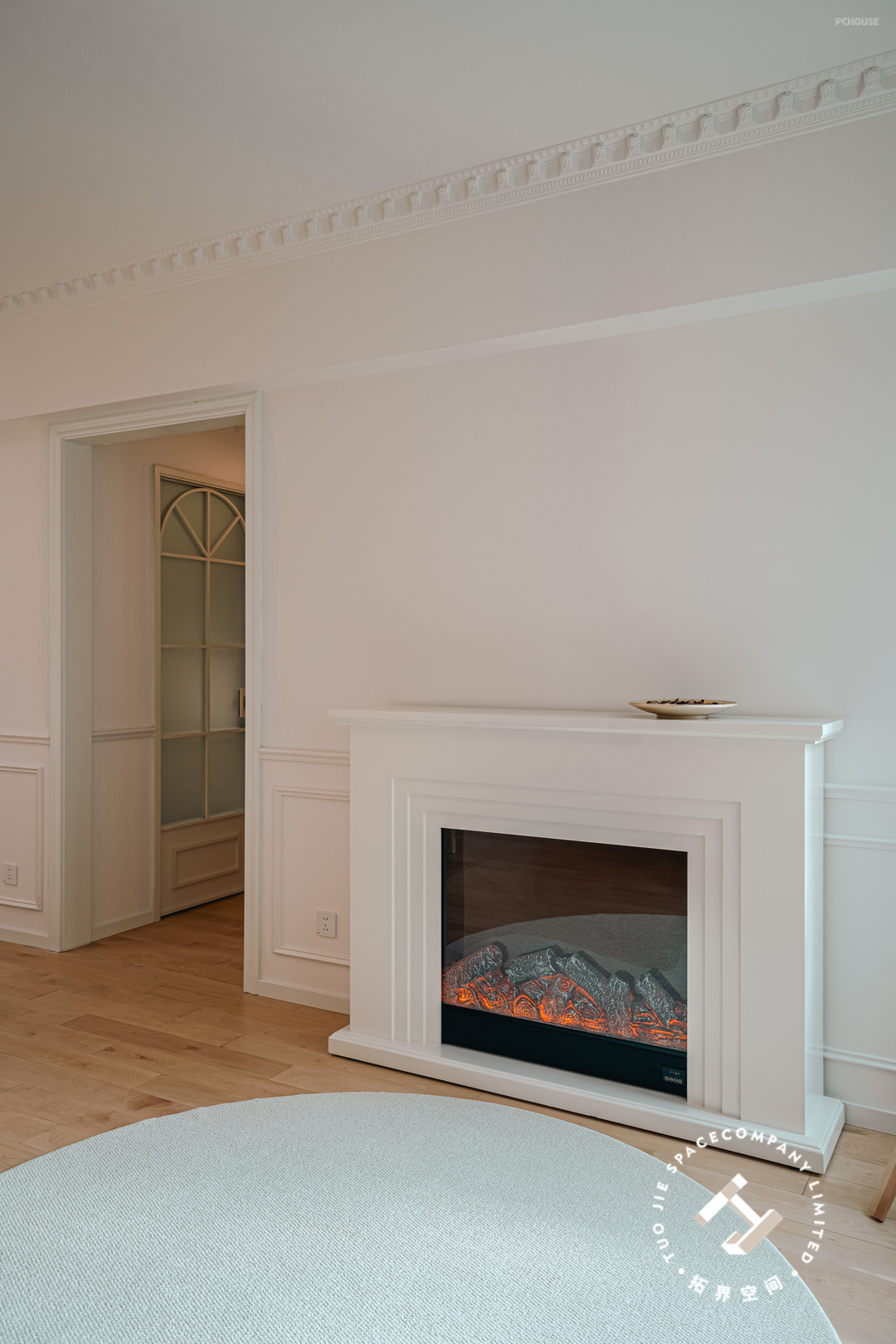壁炉的做法为这个空间注入了温暖的法式气息,仿真火焰在里面跳动着,增加了独特的视觉效果,生活氛围变得更加诗意。