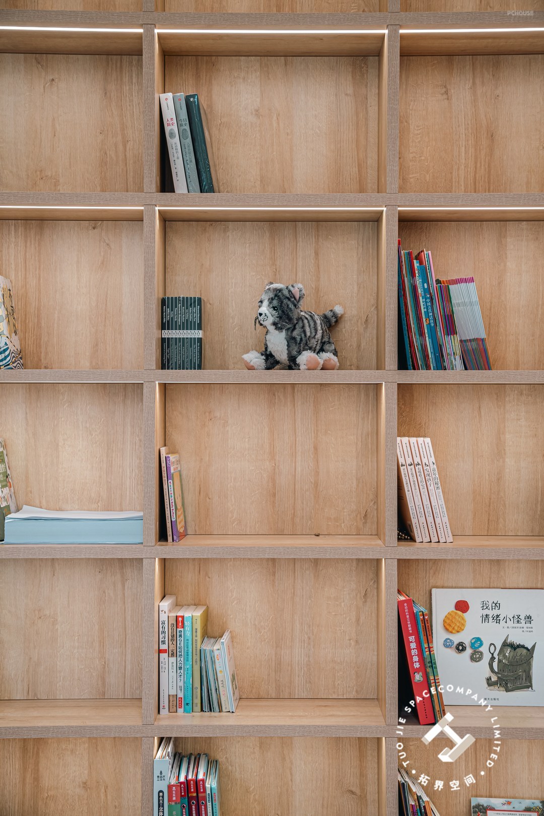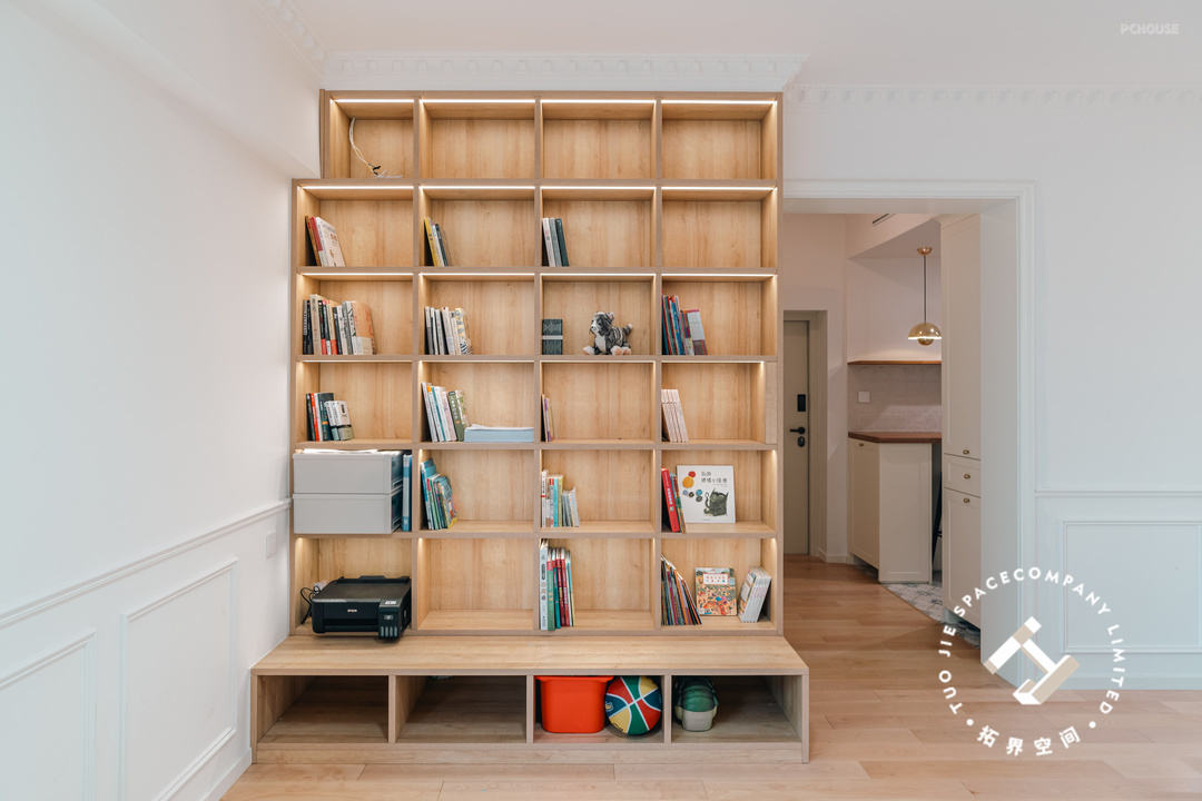 没有沙发、没有茶几、没有电视,取而代之的是开放式书柜,整齐有序的格局在灯带的衬托下,书香颜值瞬间拉满,底部还延伸了卡座,满足随时坐下阅读的小心思。
