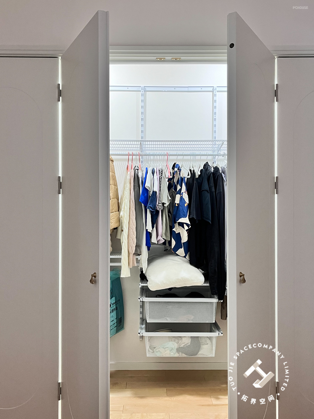 利用一通到顶的柜门打造步入式衣帽间,打开时是一个大的衣橱,内部的所有衣物一目了然;关上后看着就是正常的衣柜,几乎与墙面融为一体,让人容易忽视它的存在。