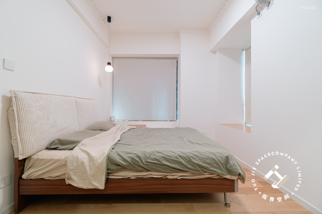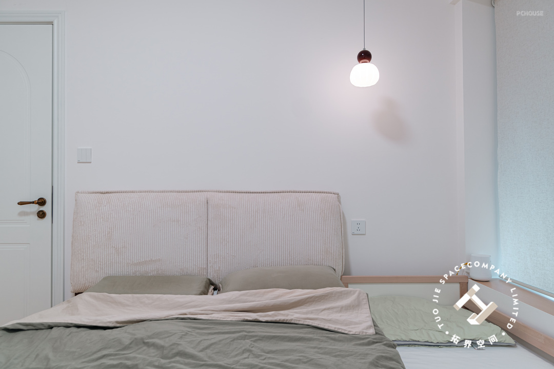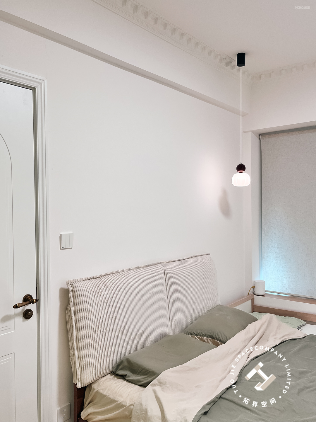 卧室在客餐厅的风格色调上加入了绿色系软装,给人清新活力的感觉;床头一角的吊灯自上垂下,散发出烂漫的光芒,诠释了有情调又不失精致的睡眠氛围。
