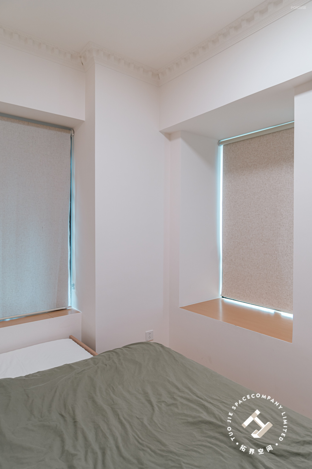 两个飘窗上分别贴上一层木板,在增加层次感的同时,也营造出充满悠闲氛围感的角落。