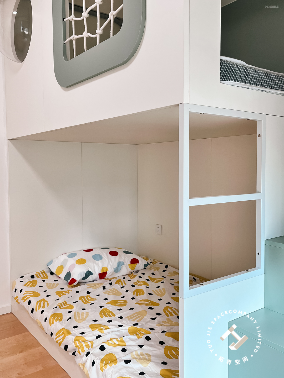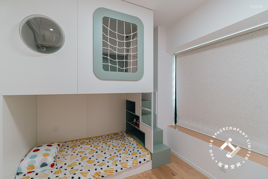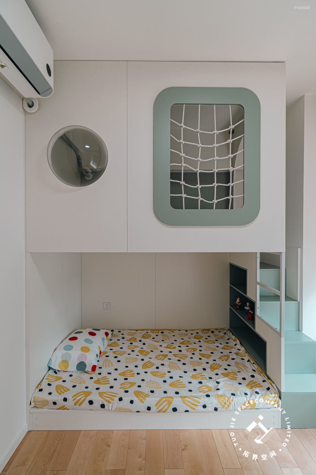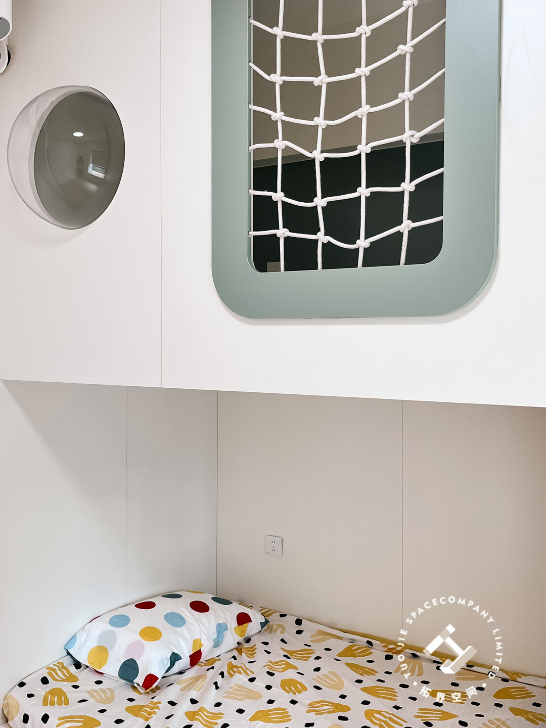 儿童房以树屋为灵感,设计上下床,满足家人的居住需求;上床的围栏加入了网状编绳和太空舱窗口设计,在保证安全的基础上增加了儿童房的趣味性。