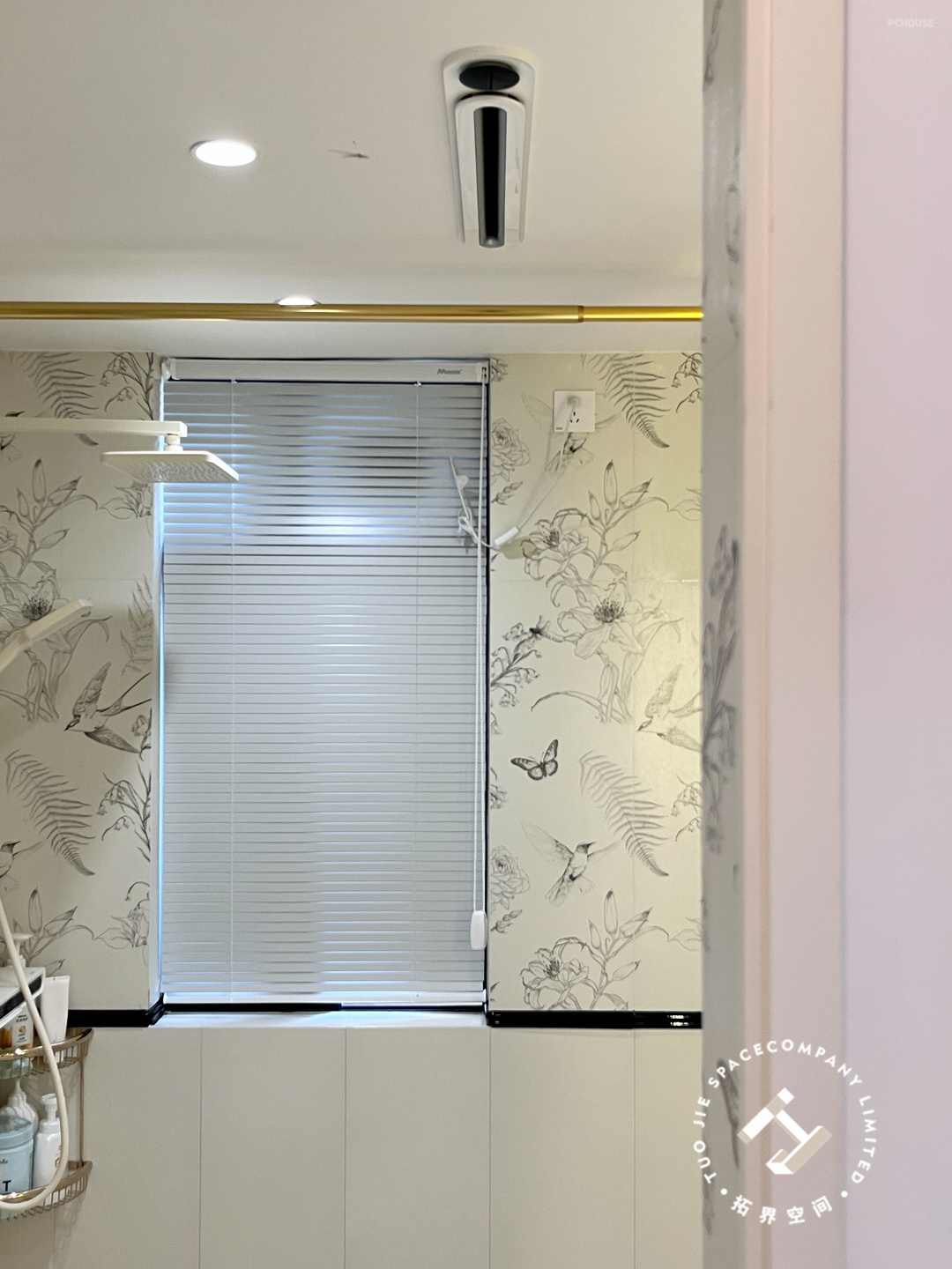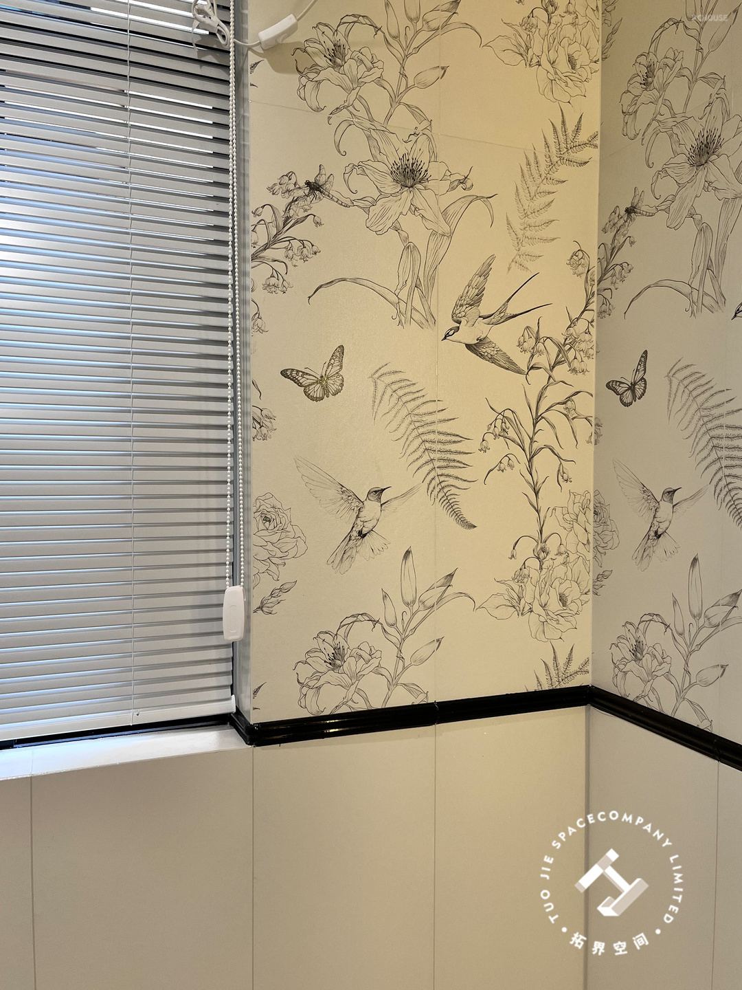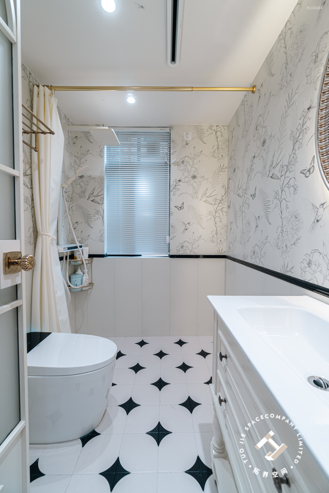 卫生间整体装修风格以黑白配色为主,利用浴帘做干湿分离,提高空间利用率;燕子花砖搭配奶白色素色砖,尽显空间的高级质感。