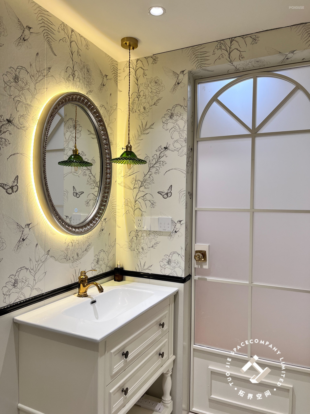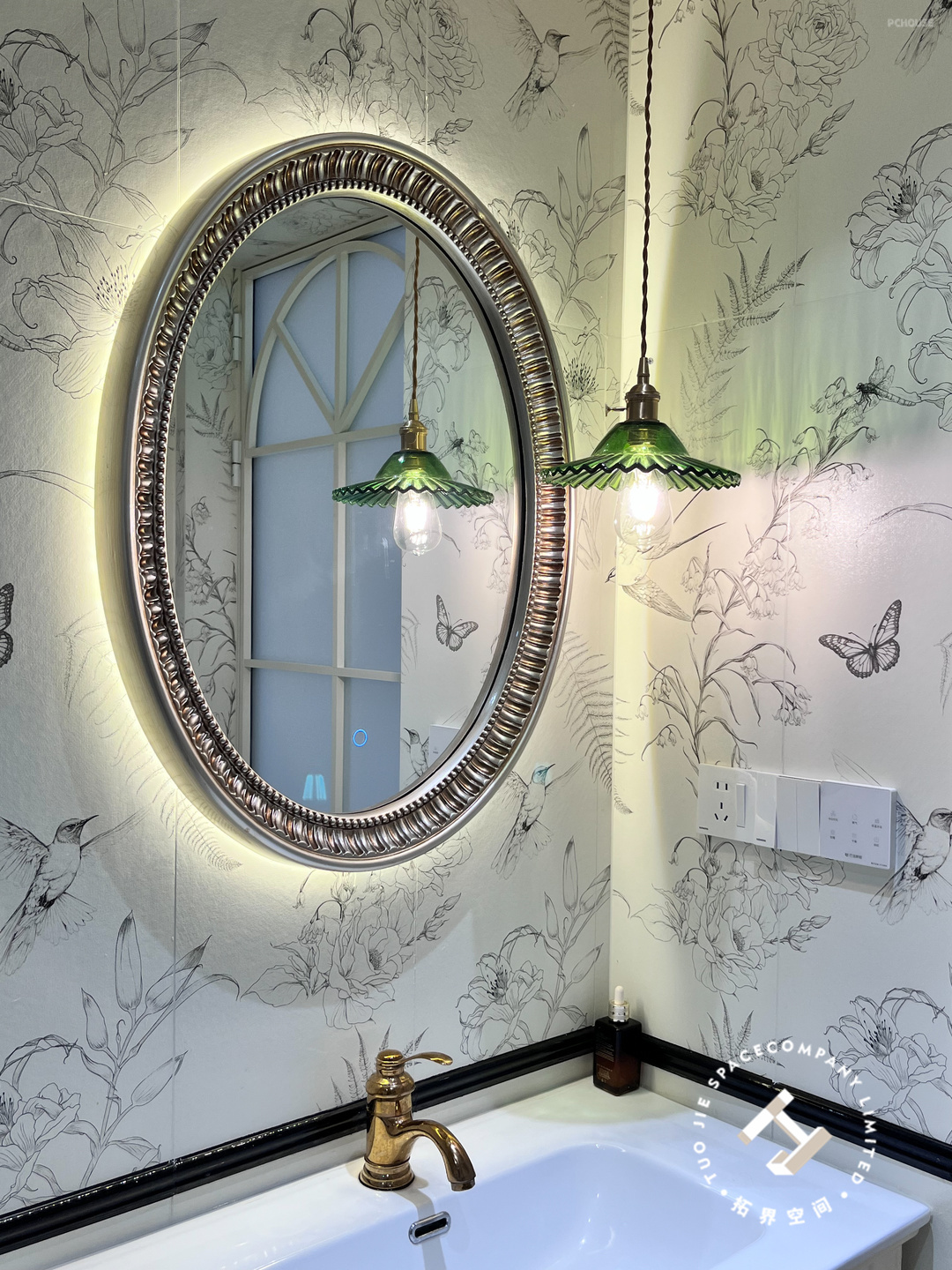 在洗漱区一角安装吊灯进行局部提亮,些许的绿色点缀,有几分俏皮的感觉。