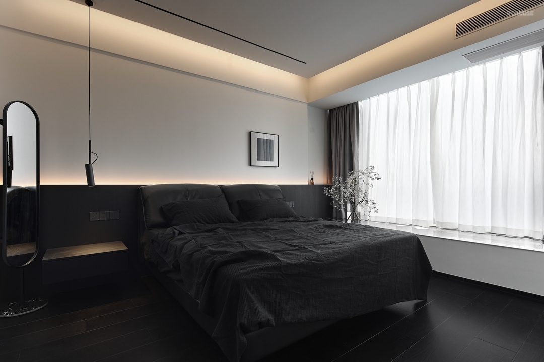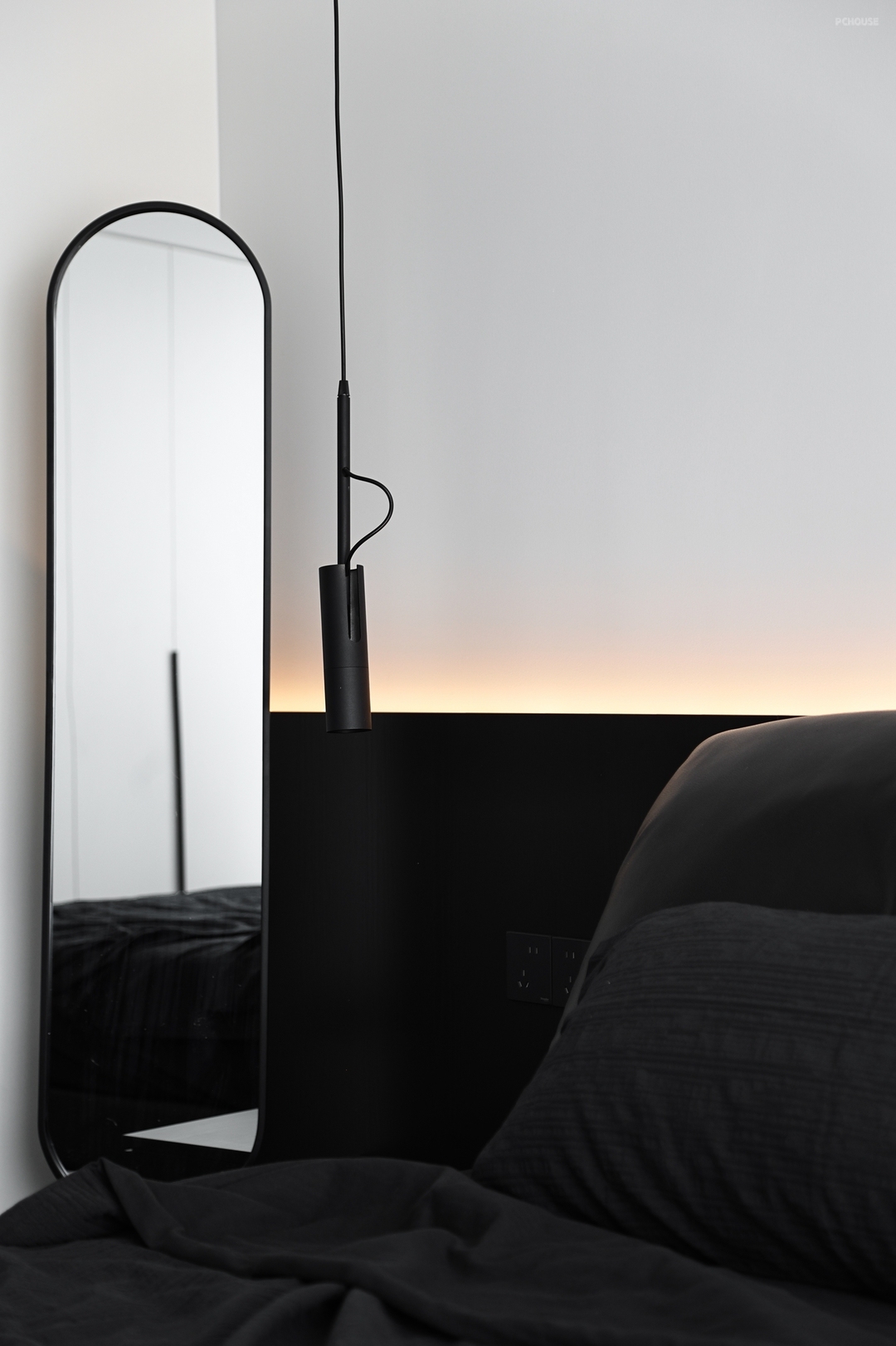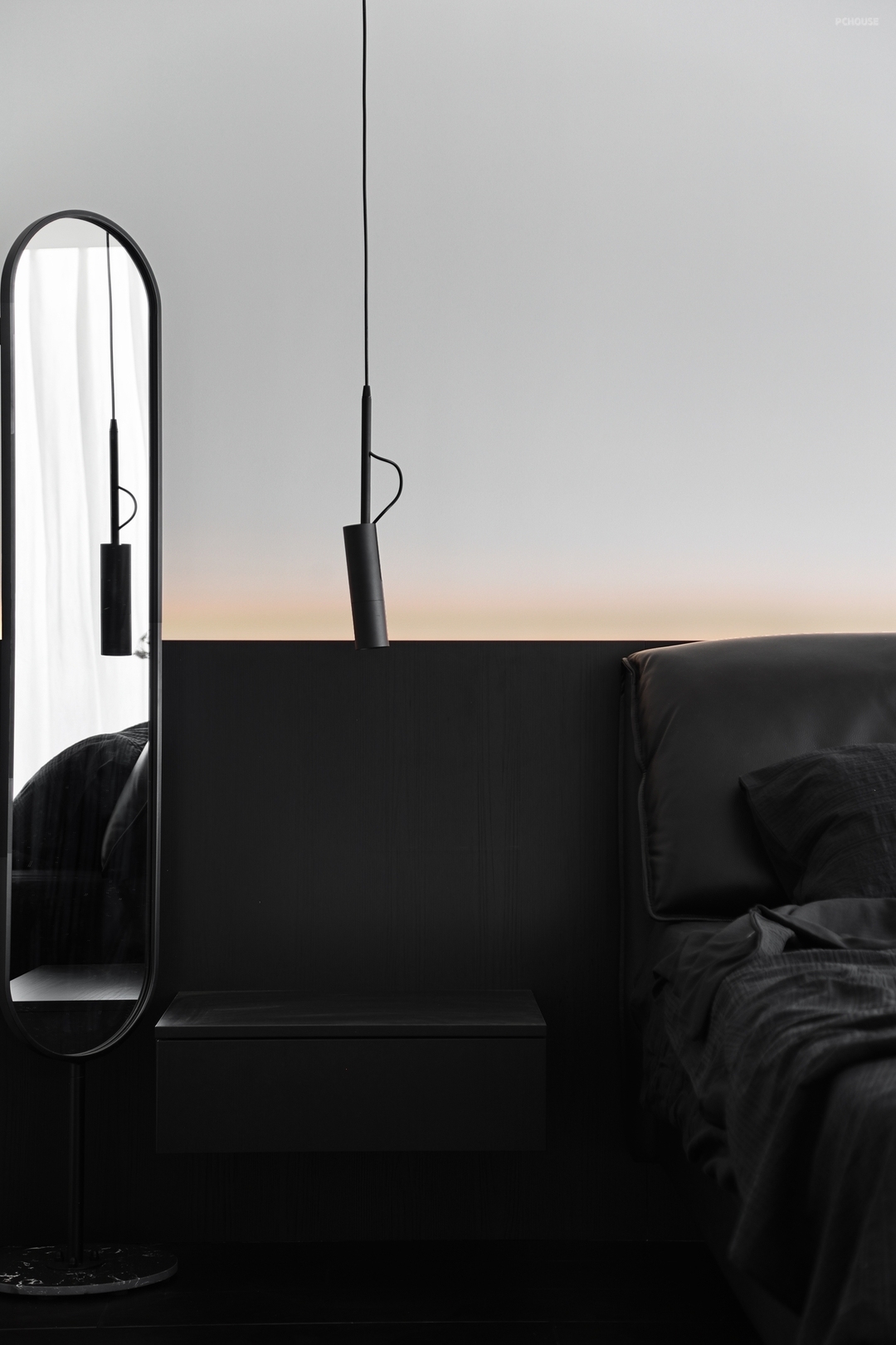 主卧室的氛围基调来自悬浮吊灯搭配床头半墙灯光的设计。