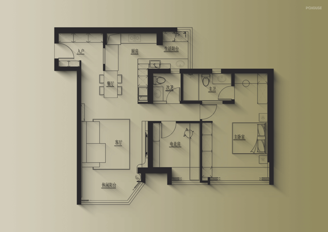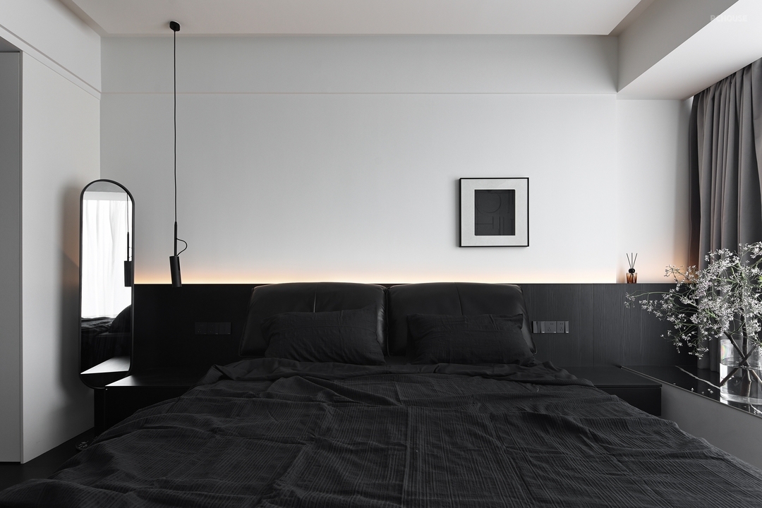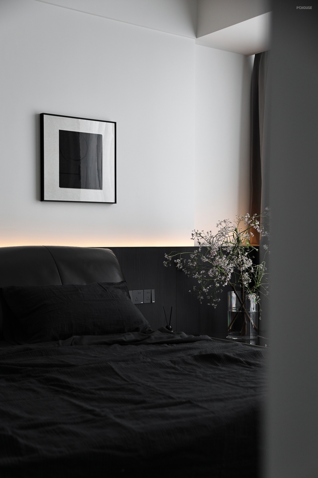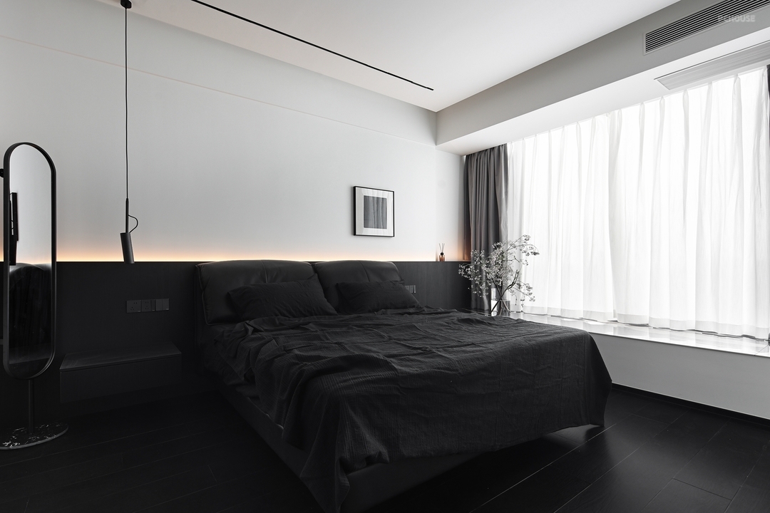 主卧室的氛围基调来自悬浮吊灯搭配床头半墙灯光的设计。