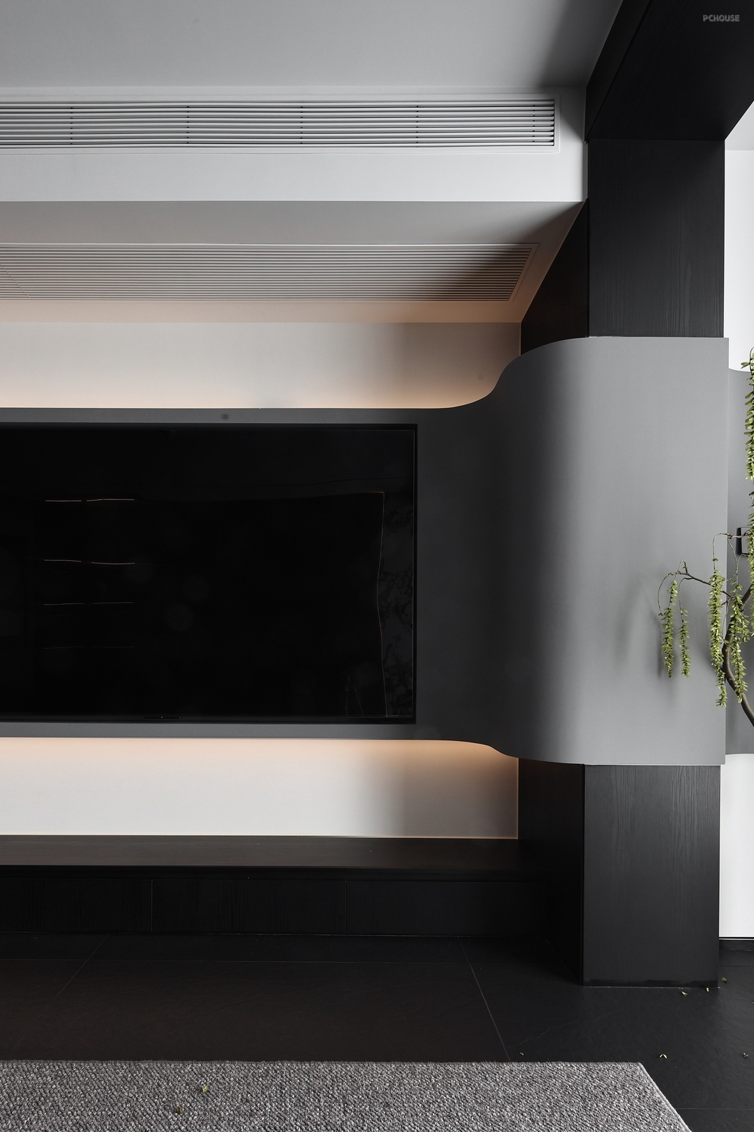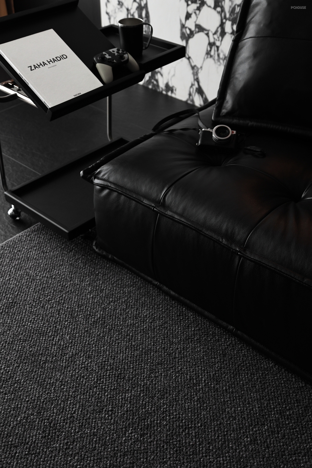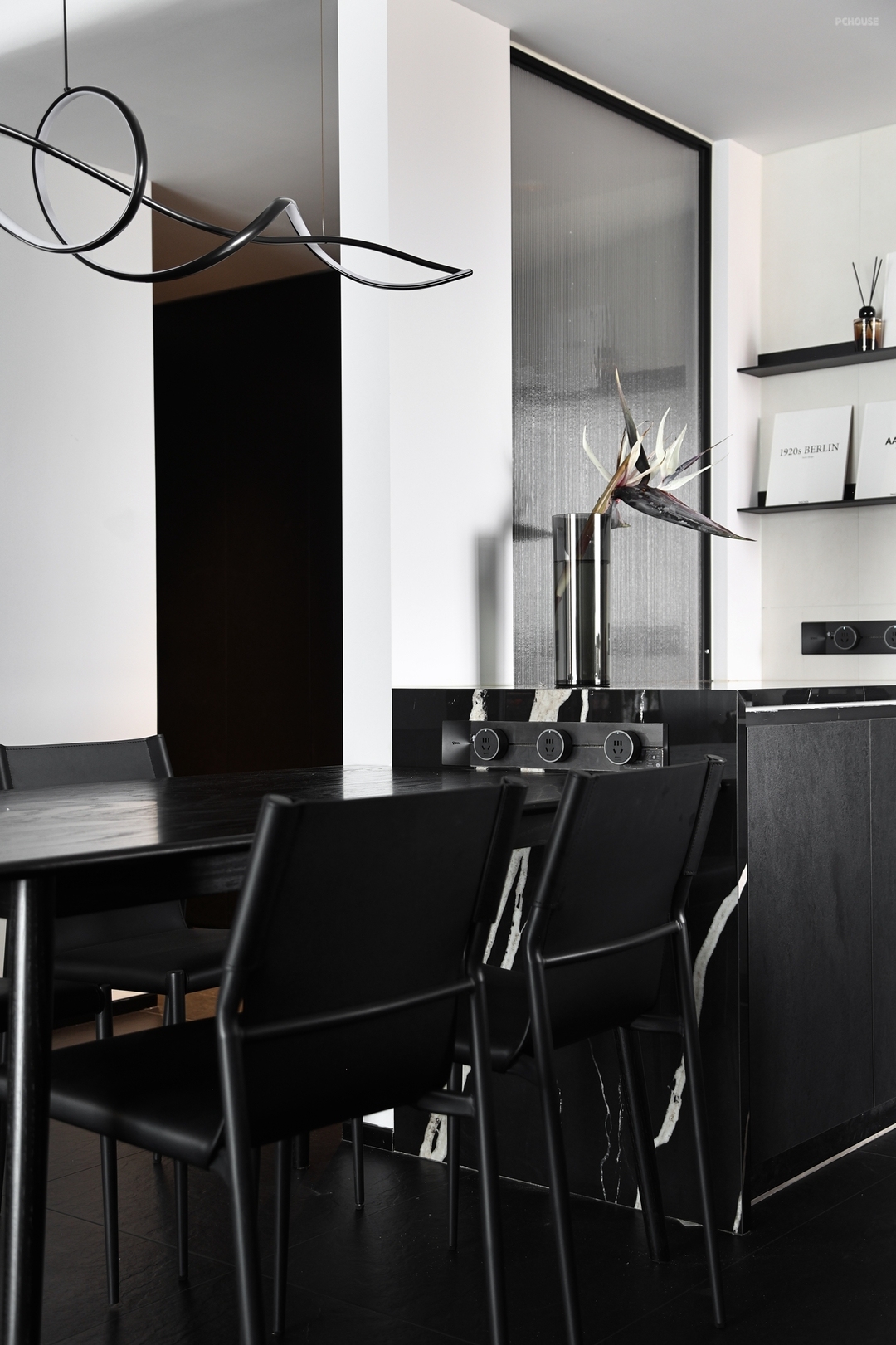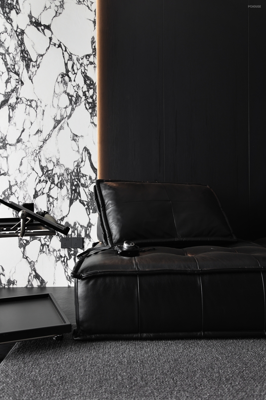黑白宝格丽岩板的加入,使整块黑色木饰面的沙发背景墙更有层次感了。