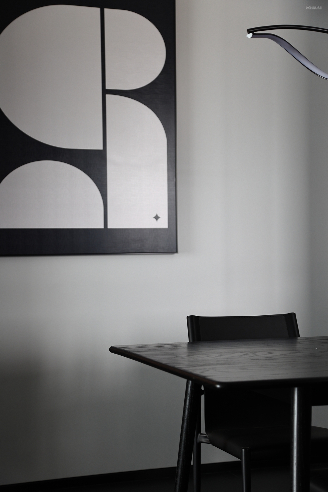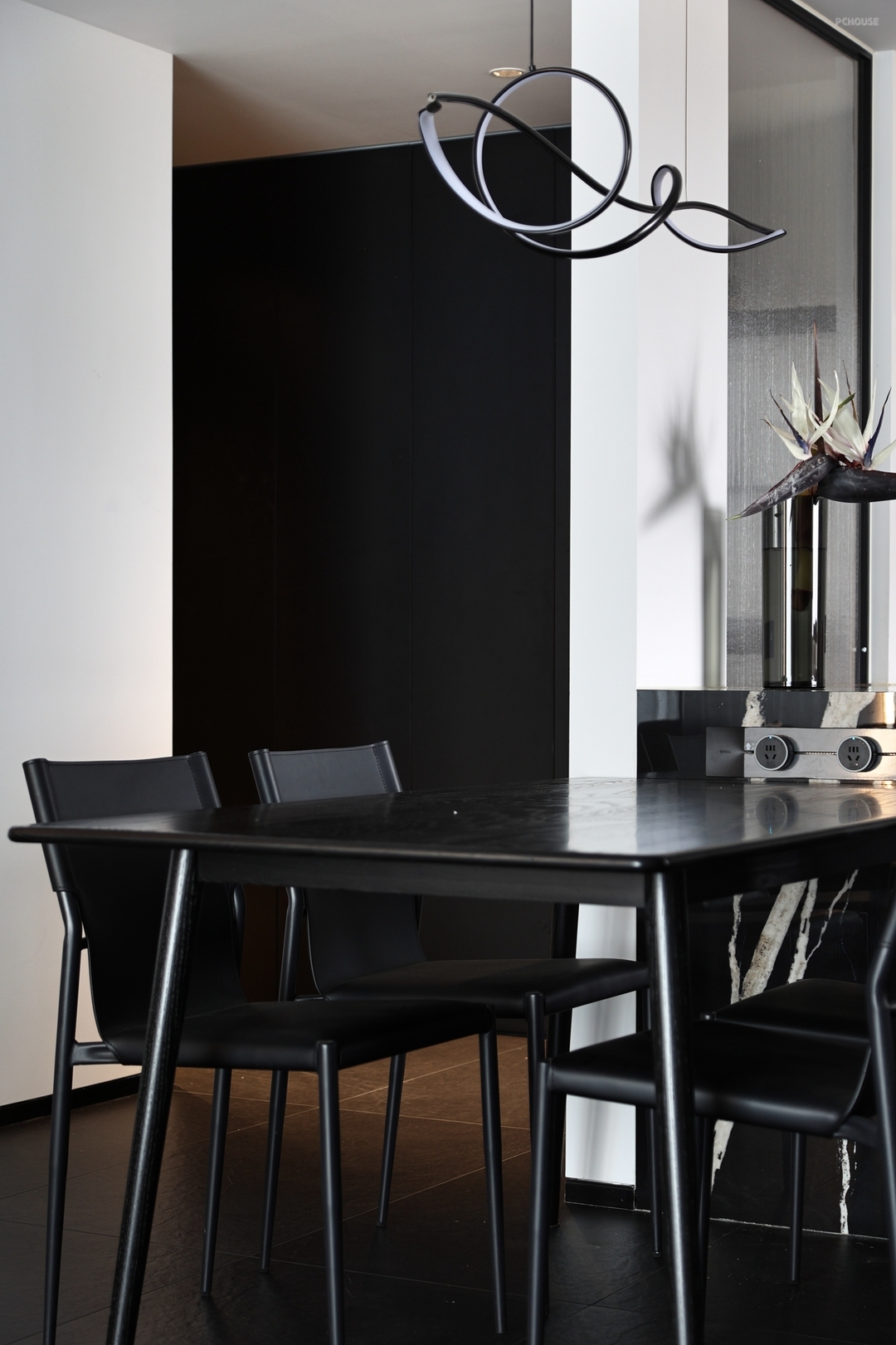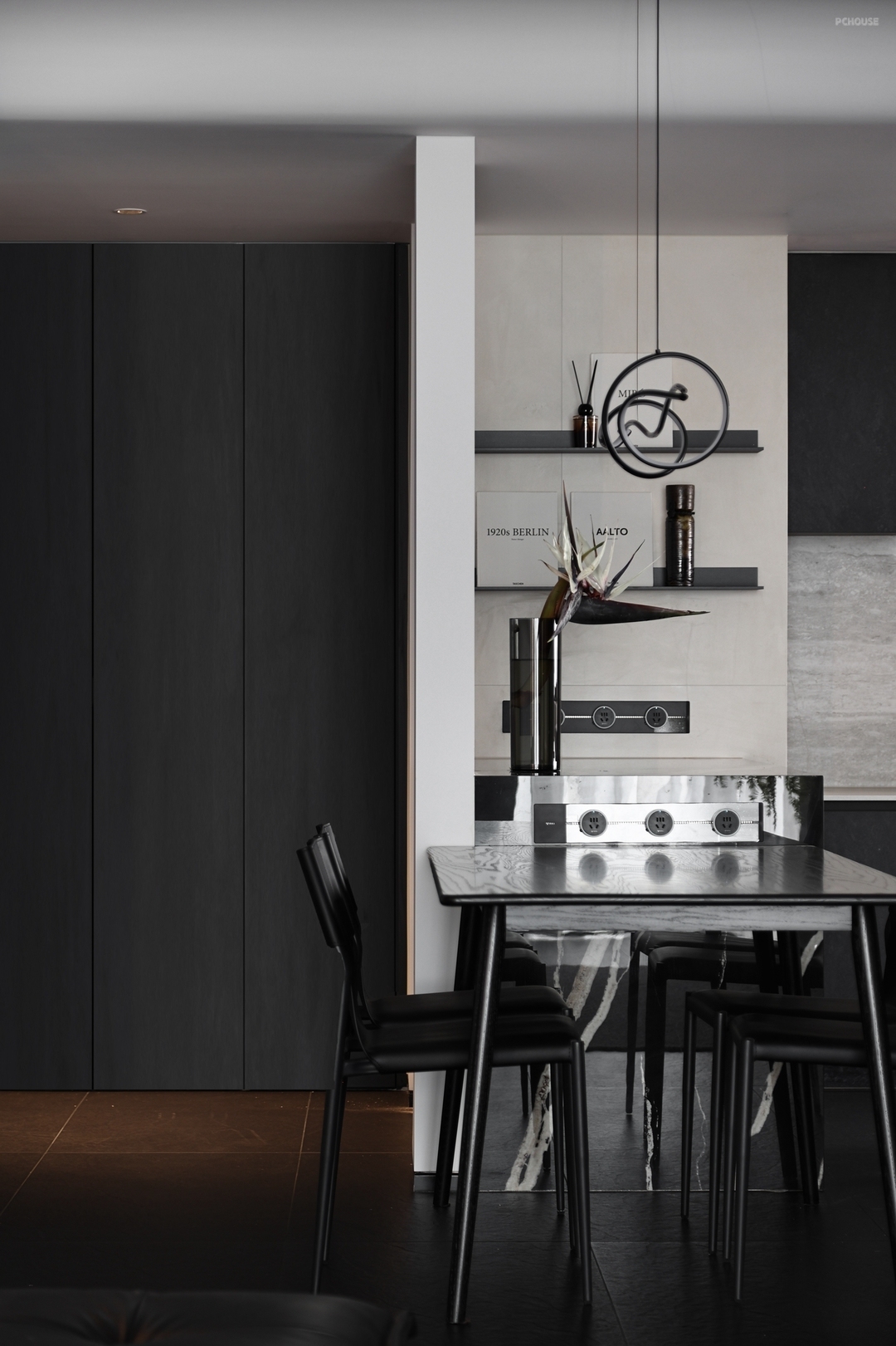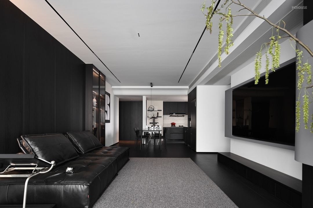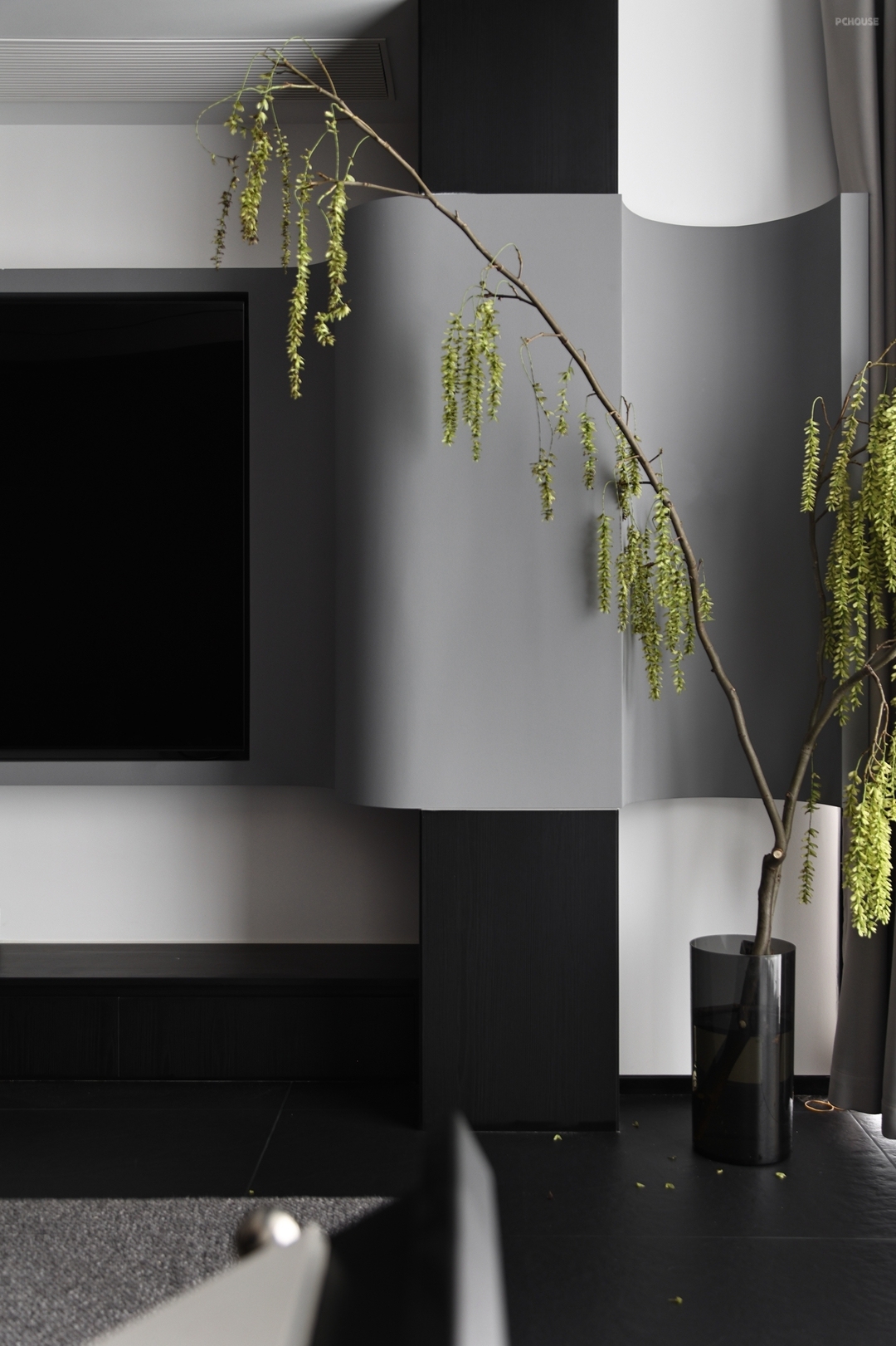 黑白宝格丽岩板的加入,使整块黑色木饰面的沙发背景墙更有层次感了。