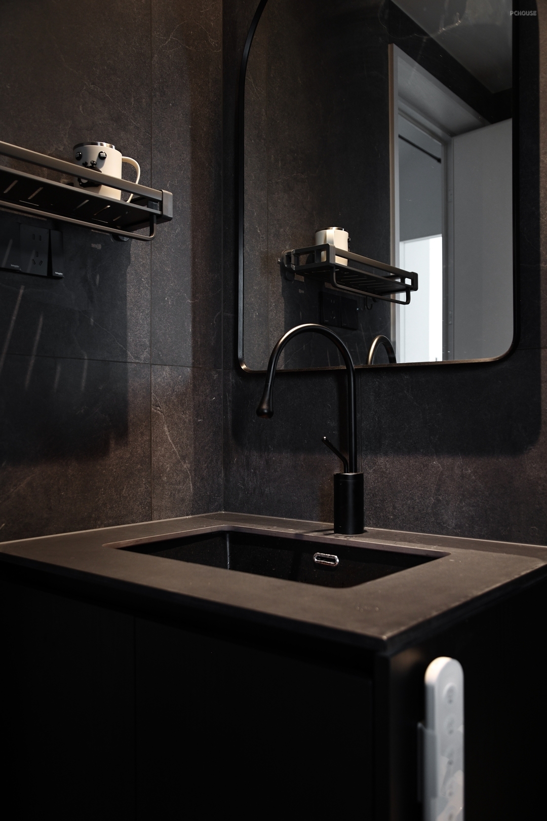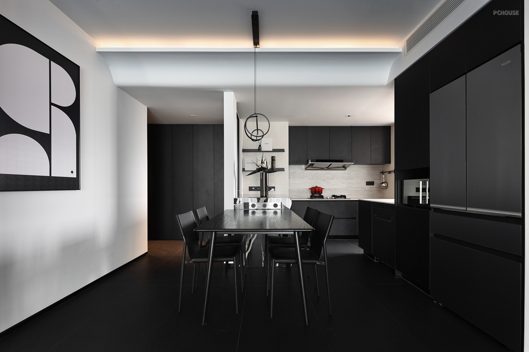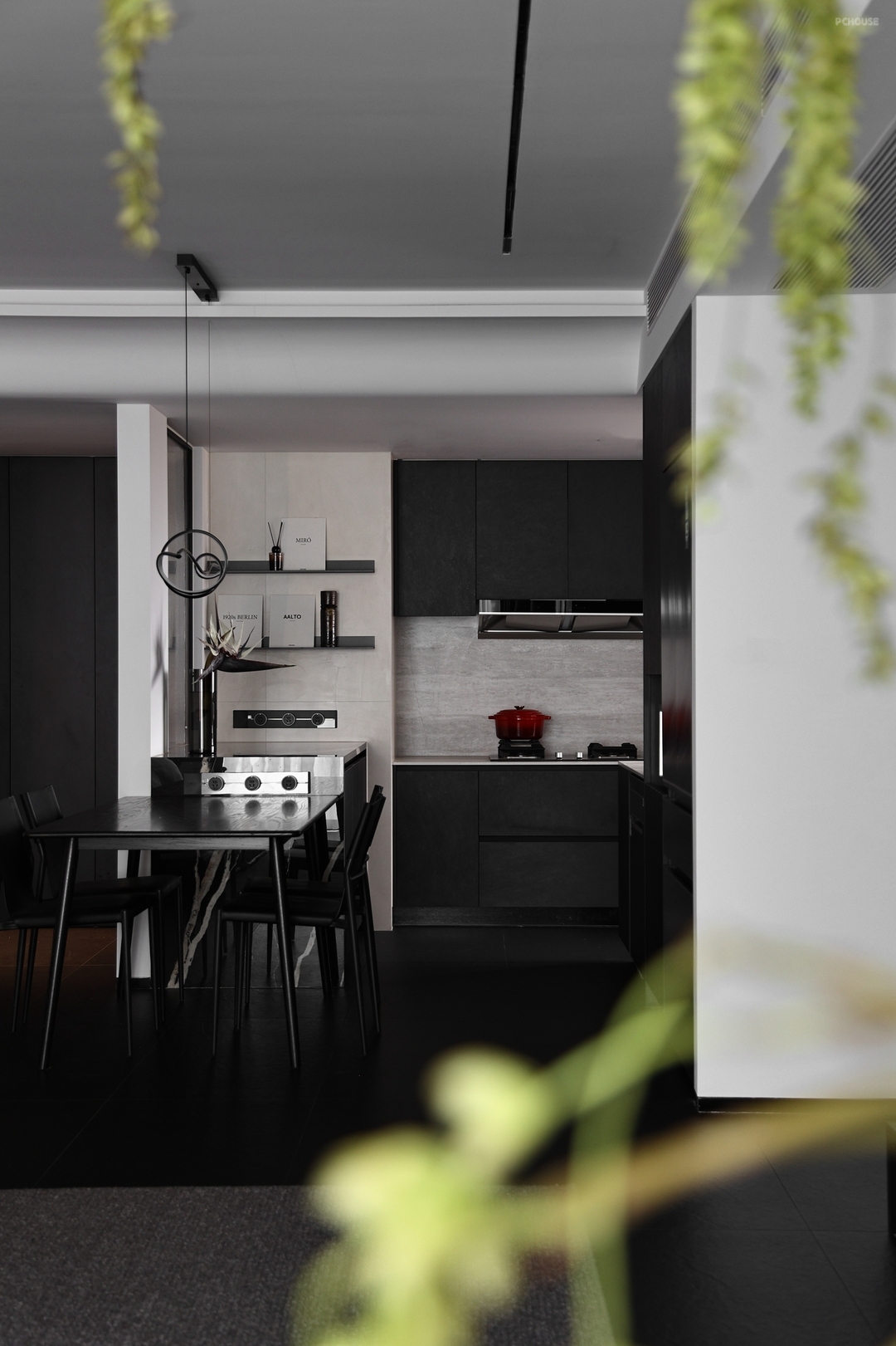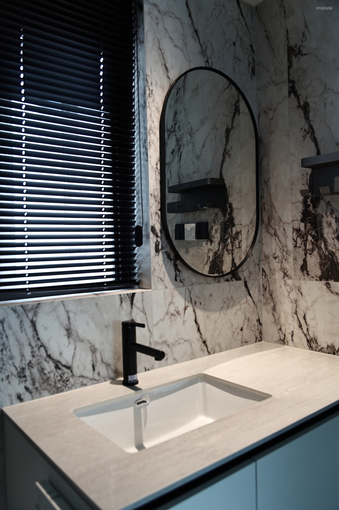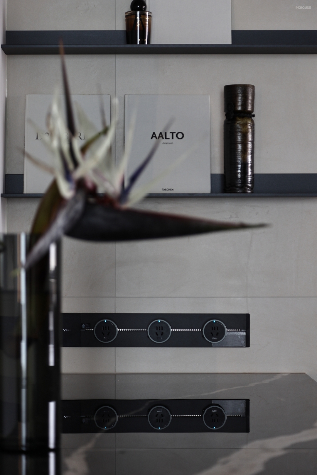 黑白宝格丽岩板的加入,使整块黑色木饰面的沙发背景墙更有层次感了。