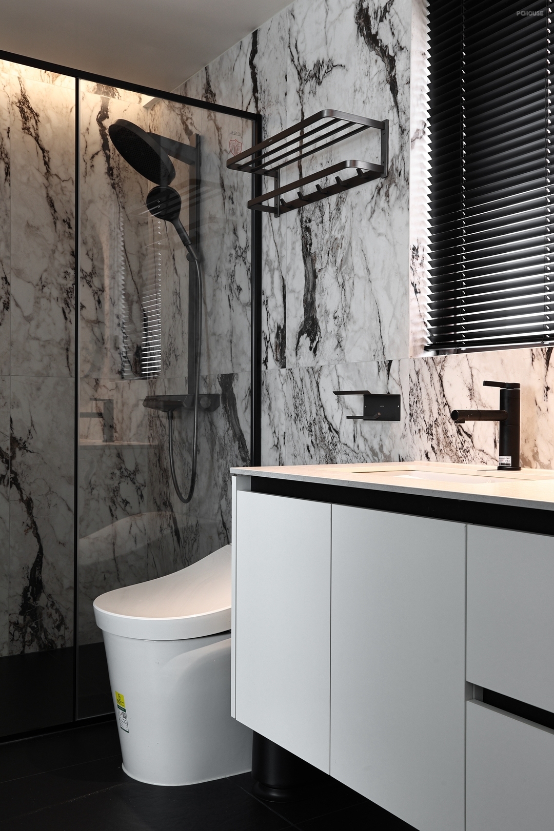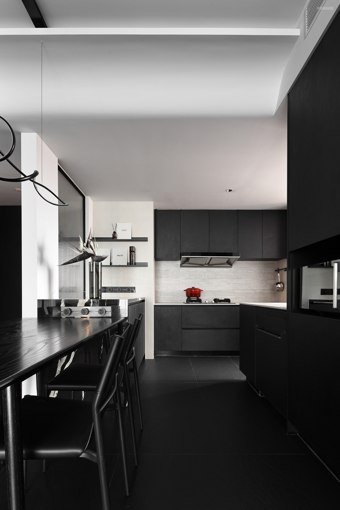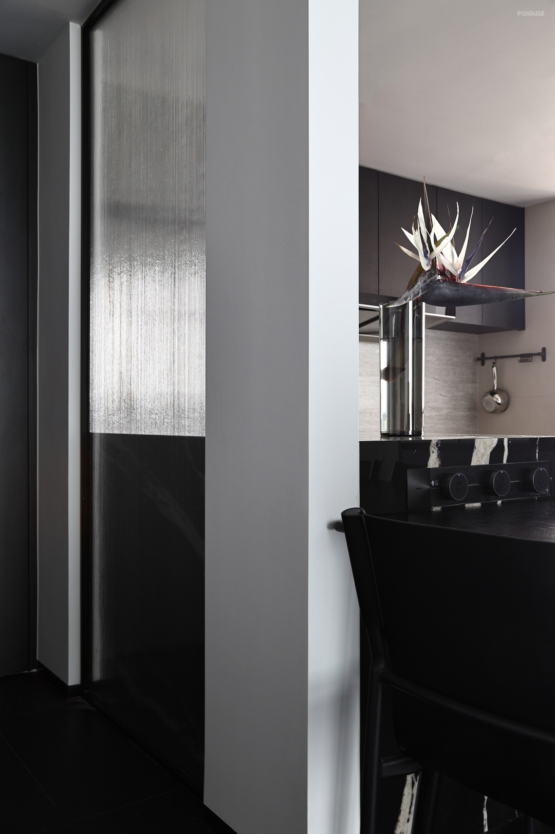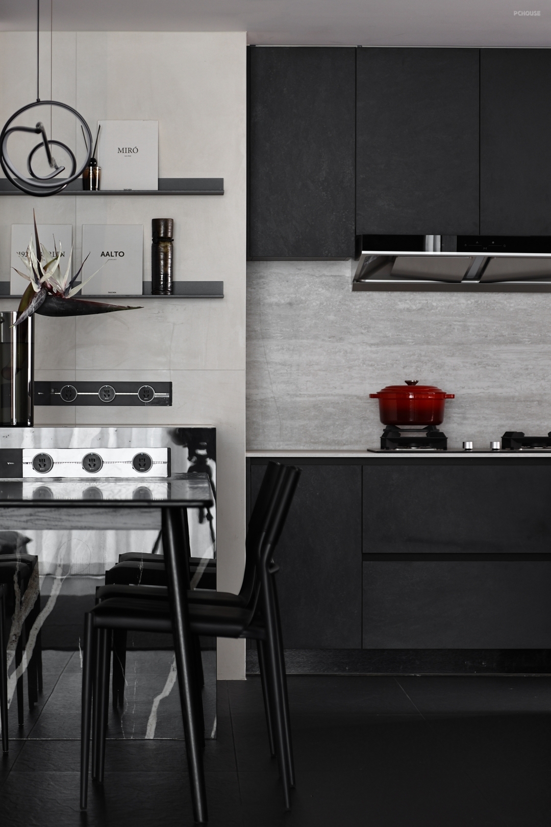 黑白宝格丽岩板的加入,使整块黑色木饰面的沙发背景墙更有层次感了。