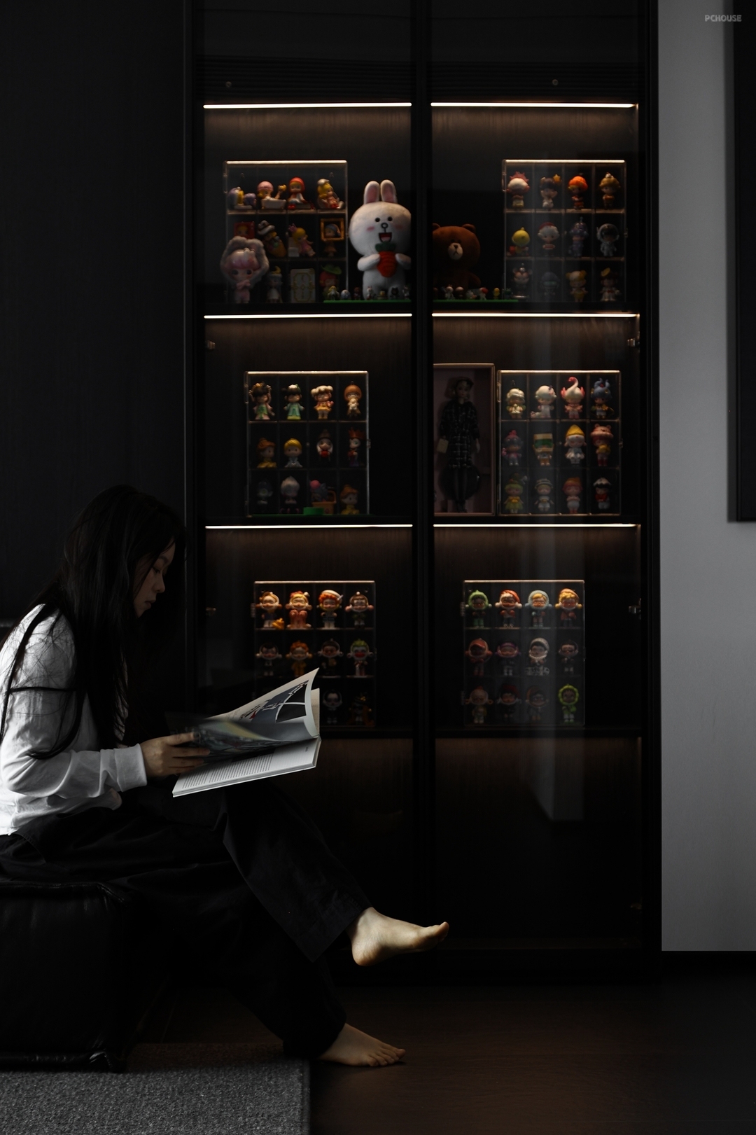 沙发背景墙与走廊相对的部分,设计师现场定制了一组薄柜,专用于收纳男女主人的浪漫纪念品。