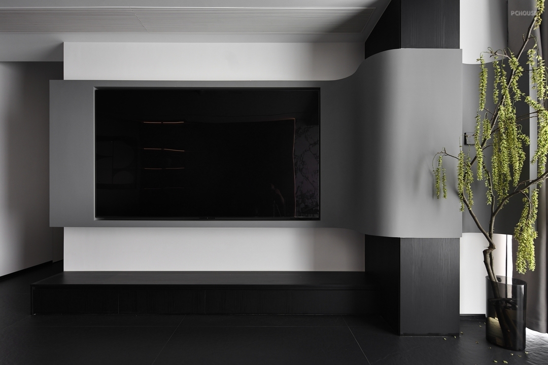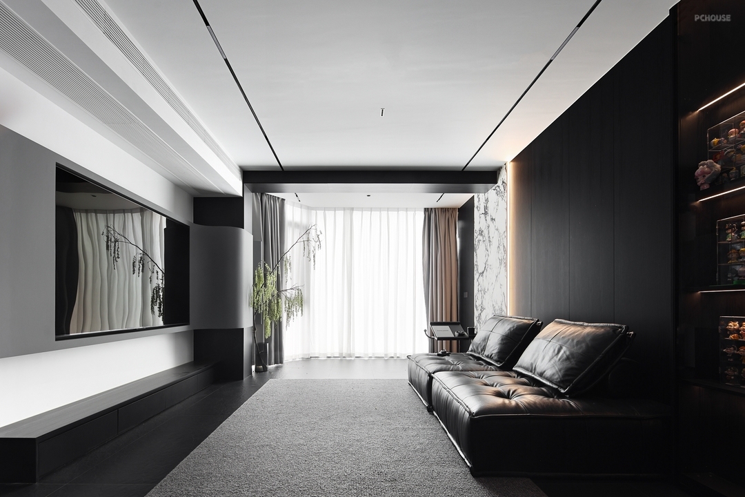 面对整体偏狭长的客厅,设计师以电视墙与沙发背景墙整体贯通到休闲阳台的方式,增添了整个客厅“景深感”。