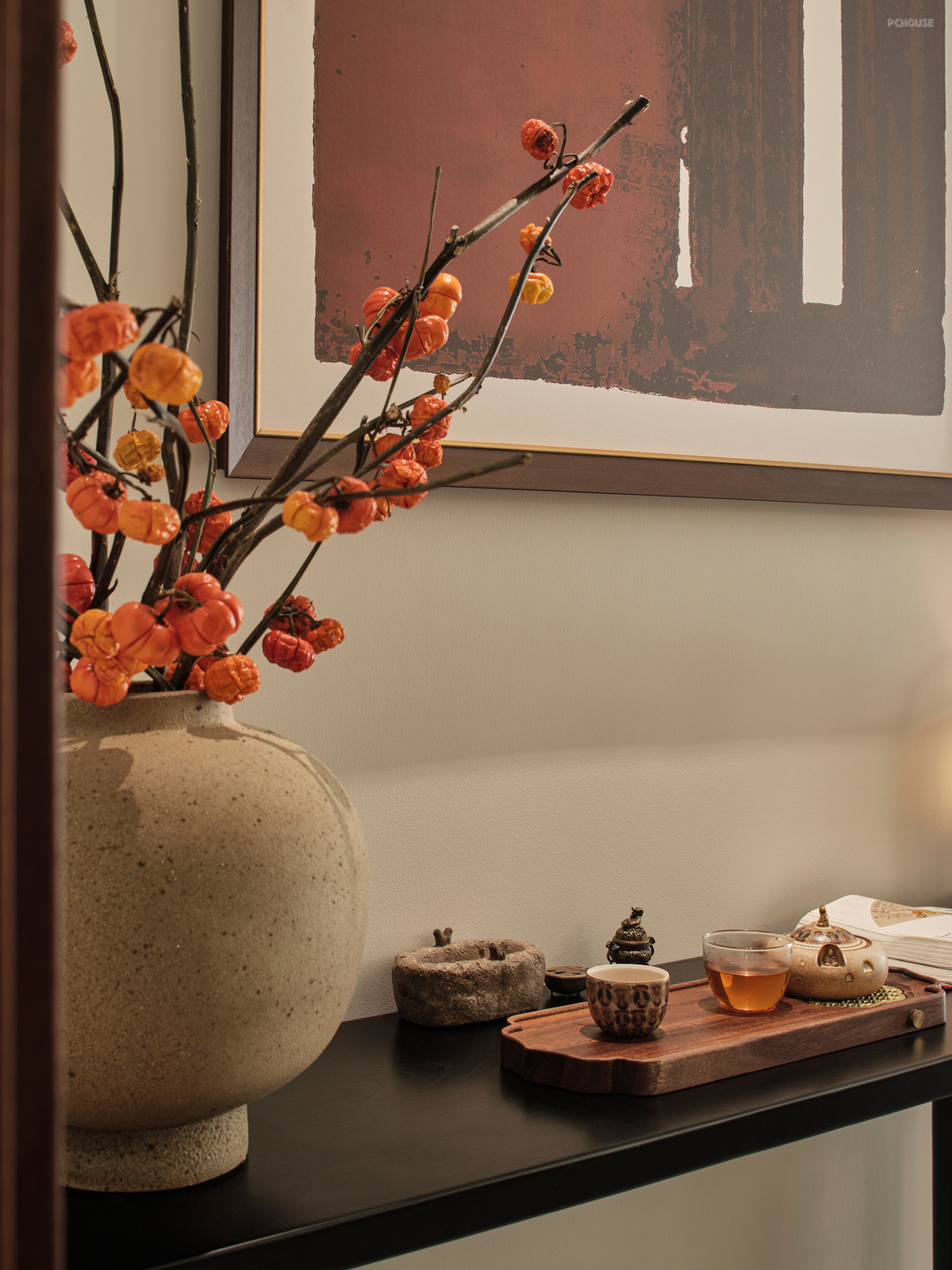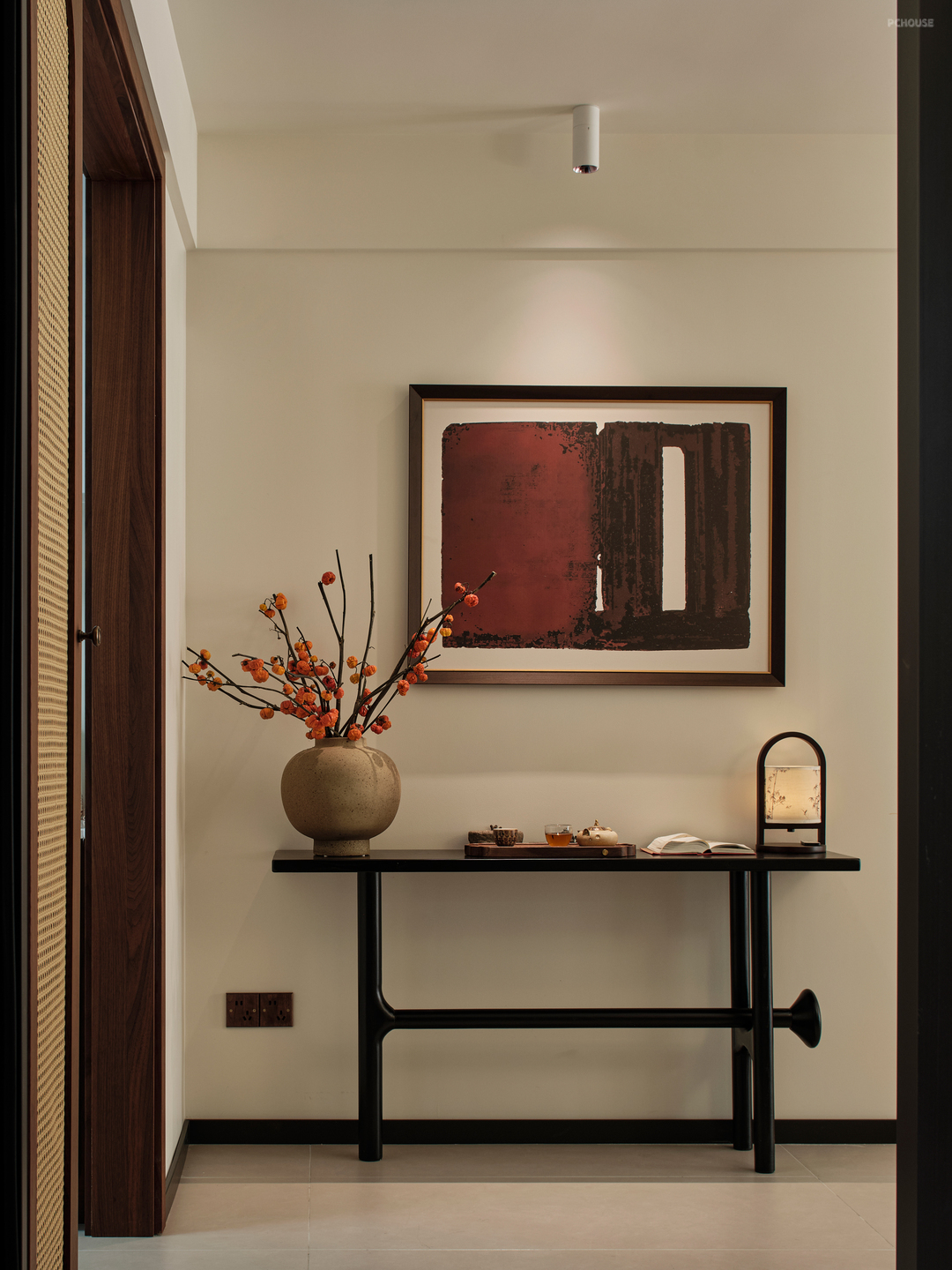 踏入家门的那一刻,玄关率先映入眼帘,宛如一方精心雕琢的艺术天地。复古的黑色桌台静静伫立,沉稳而大气,承载着生活的细腻与从容。其上,古朴陶罐插着些许柿柿如意,橙红饱满的果实仿若跳跃的精灵,俏皮地传递着岁岁皆如意、年年皆吉祥的美好祈愿。抽象的画作挂于墙面,浓淡相宜的色调,为空间注入艺术气息。一盏温润的禅意小灯,柔和光线晕染开来,温馨满溢。