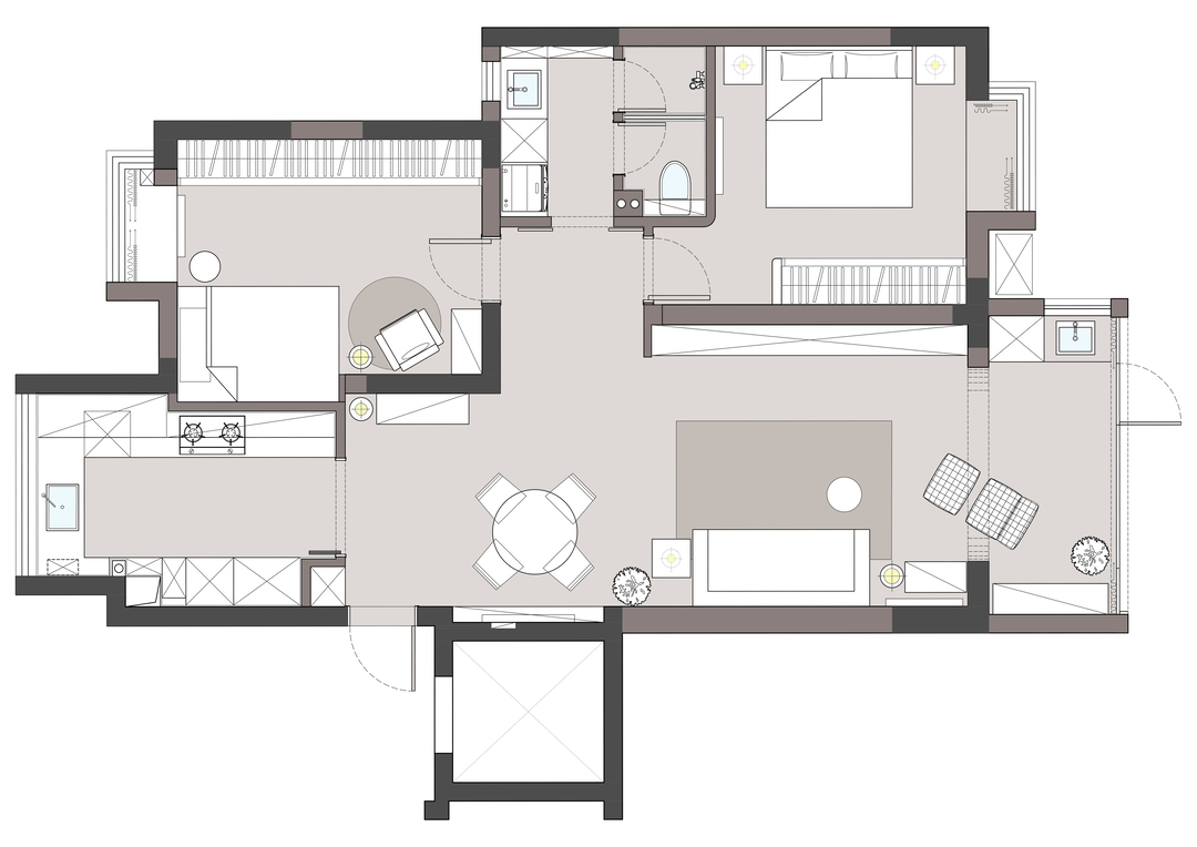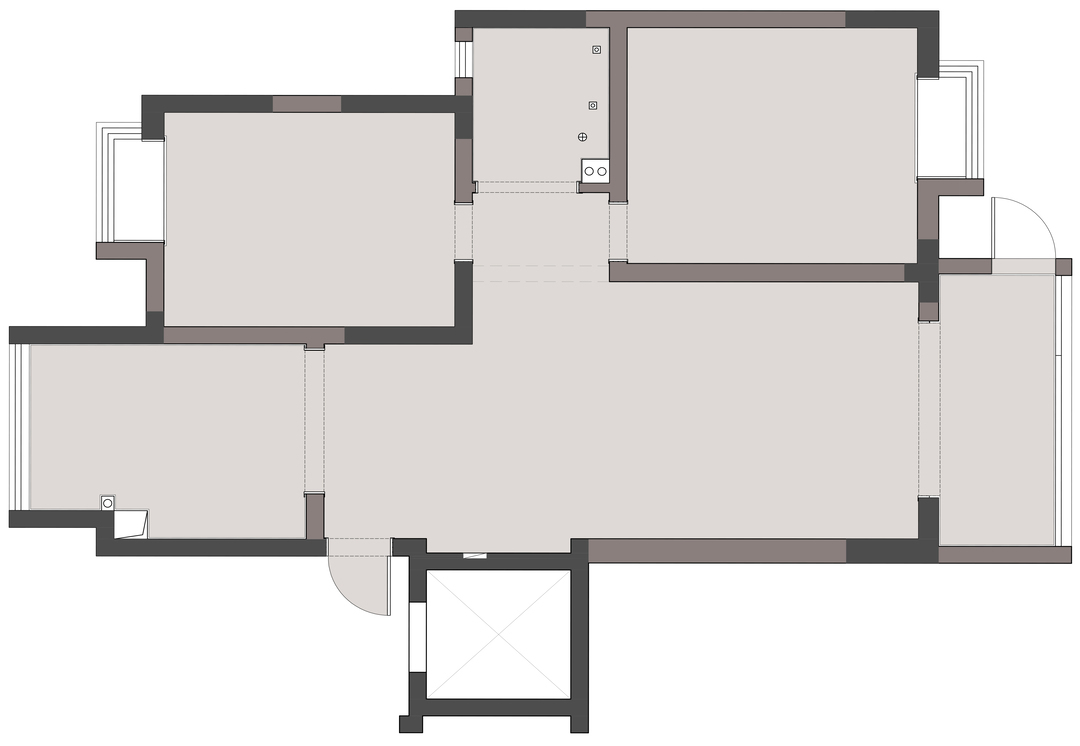 3.卫生间面积较小,拆除卫生间与主卧之间的墙体,新建墙体向主卧延伸,从而扩大卫生间,形成了四分离格局,满足多功能的需求。