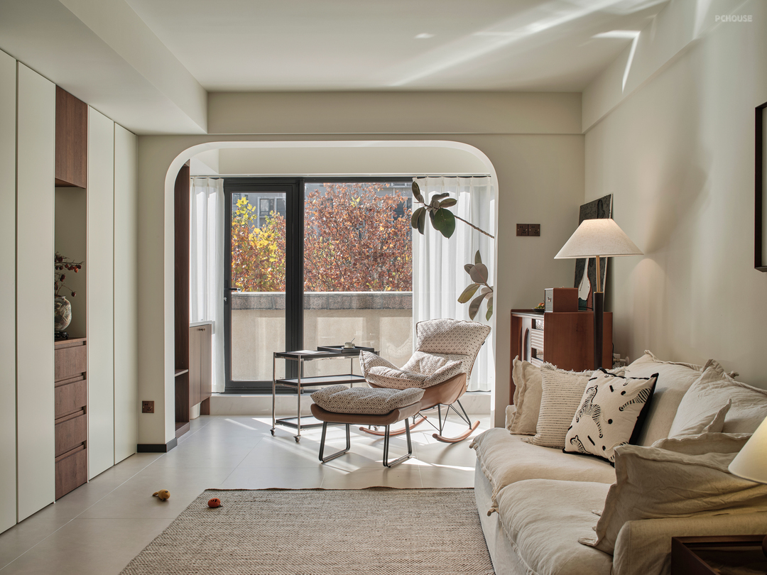 阳台处,大面积玻璃窗似通透画框,框起四季更迭的绚丽。此刻,窗外树叶染上斑斓秋色,红褐与金黄交织,在阳光下闪烁。轻柔的白色纱帘随风微漾,似给这景致蒙上一层朦胧滤镜,光影透过缝隙洒入,在地面勾勒出灵动图案。造型别致的摇椅,搭配柔软坐垫,每一次轻摇,都似在编织惬意梦境;搭配上黑色的推车边几,传递出东方情调和复古的气质,满足多种收纳需求。于此,可在白日倚坐摇椅,沐阳光、赏景,让人沉醉于岁月的温柔与宁静。