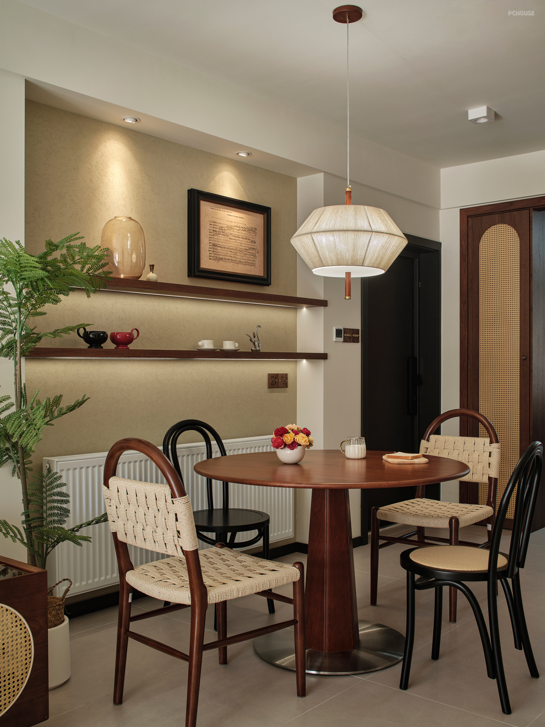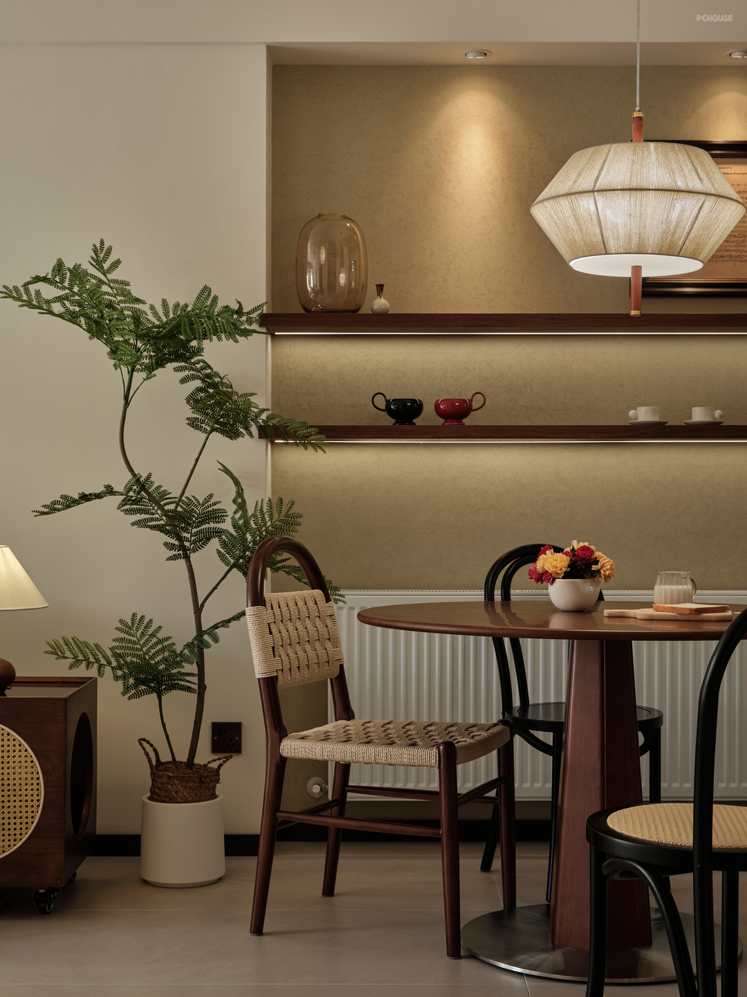 暖米色调的背景墙面、垂落的吊灯,将光线温柔包裹,柔化整体氛围,提升沉浸感,营造出慵懒而精致的用餐氛围。背景墙的木质搁板层叠着茶香与回忆,陈列与装饰画形成视觉焦点,传递生活艺术。