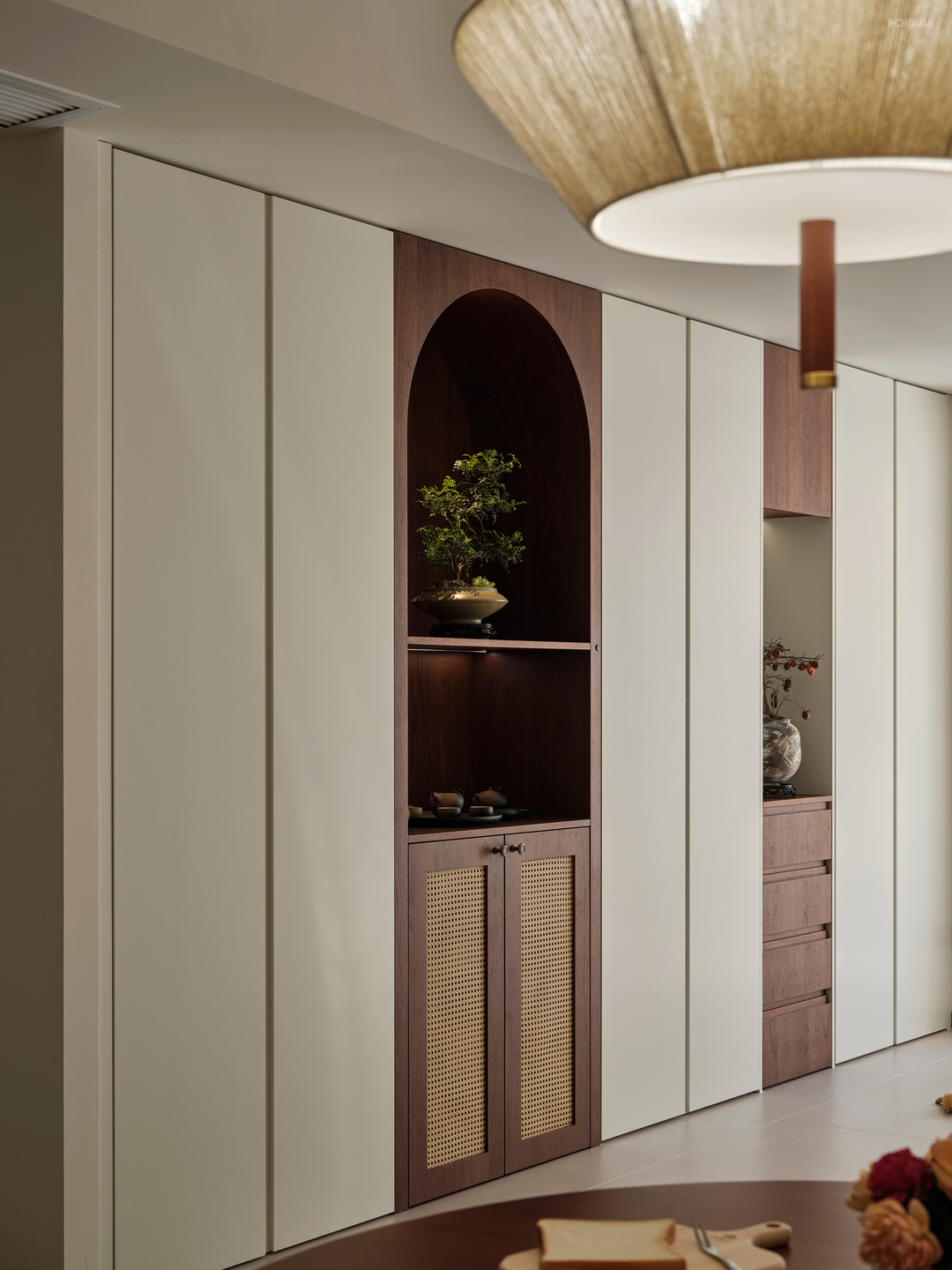 柜体以米白色为基底,营造出简洁宁静的氛围。其间,沉稳的深木色如点睛之笔,勾勒出独特轮廓。拱形开放格设计,打破规整与平淡,宛如古典园林中的月洞门,含蓄而优雅。格内的盆景为空间注入蓬勃生机,搭配古朴茶具,尽显主人的闲情雅致。加入藤编元素,细腻纹理似时光编织的诗行,自然质朴;光影洒落,于柜体表面描摹出明暗交织的画卷,每一处起伏与转折,都诉说着匠心独运。这一处多功能的柜体,是空间的守护者,收纳生活琐碎;亦是艺术的践行者,装点家居风情,于方寸之间,让我们邂逅生活的精致与美好。
