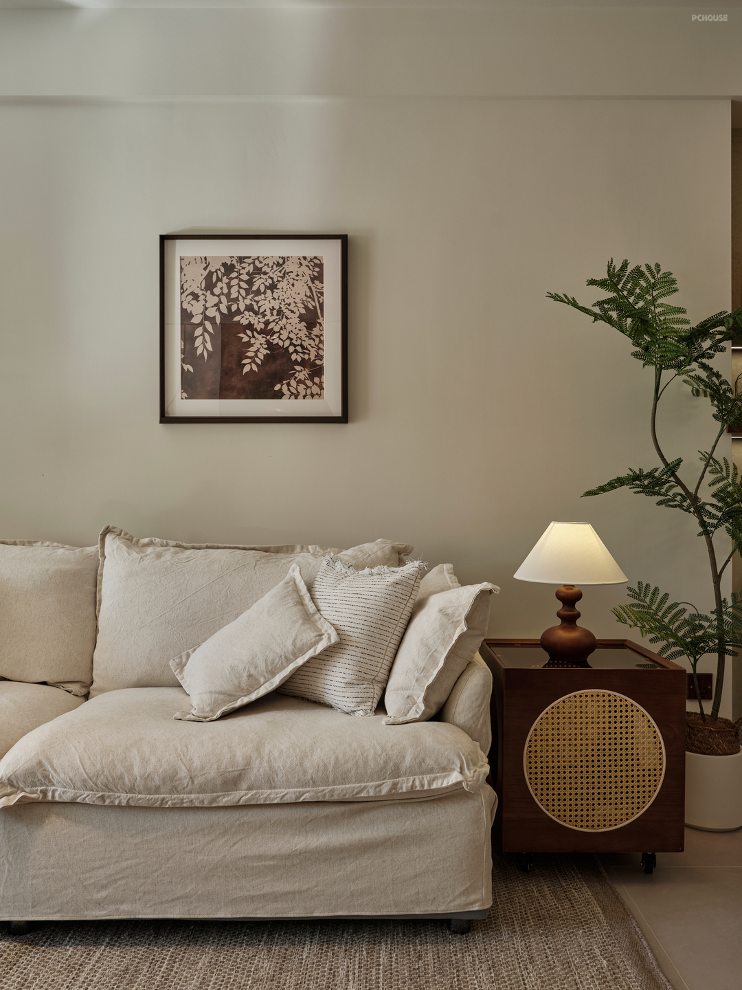 浅米色沙发宛如云朵,簇拥着形态各异的抱枕,每一个纹理、每一道褶皱,都在诉说着舒适与慵懒。一旁的木质边几,沉稳而不失精巧;藤编元素为其增添了自然意趣,仿若将林间清风引入室内。一盏复古台灯静置于上,暖黄灯光宛如月光倾洒,晕染出静谧氛围。墙上挂画,以枝叶图案绘就自然景致,似在诉说着四季流转的故事。绿植舒展枝叶,蓬勃生机与室内柔和色调相互映衬,为空间注入灵动活力。在这里,时光仿佛放慢了步调,每一寸角落都弥漫着宁静与惬意,让人得以暂忘喧嚣,漫品生活的悠然与美好。