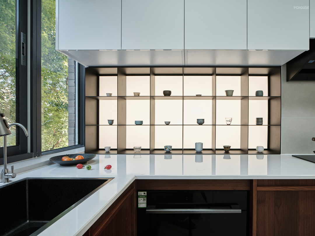 厨房一角定制开放式格架,似是一个微型的艺术展厅。精致的杯盏错落陈列,每一只都有独特的模样,或简约流畅,或古韵雅致。暖光从格架后方晕染而出,为这些杯盏披上一层温柔的纱衣,光影摇曳间,它们宛如被时光雕琢的珍宝,静静诉说着生活的美学。在这里,烹饪不再只是满足口腹之欲的劳作,而是一场在艺术与生活间穿梭的惬意旅程。