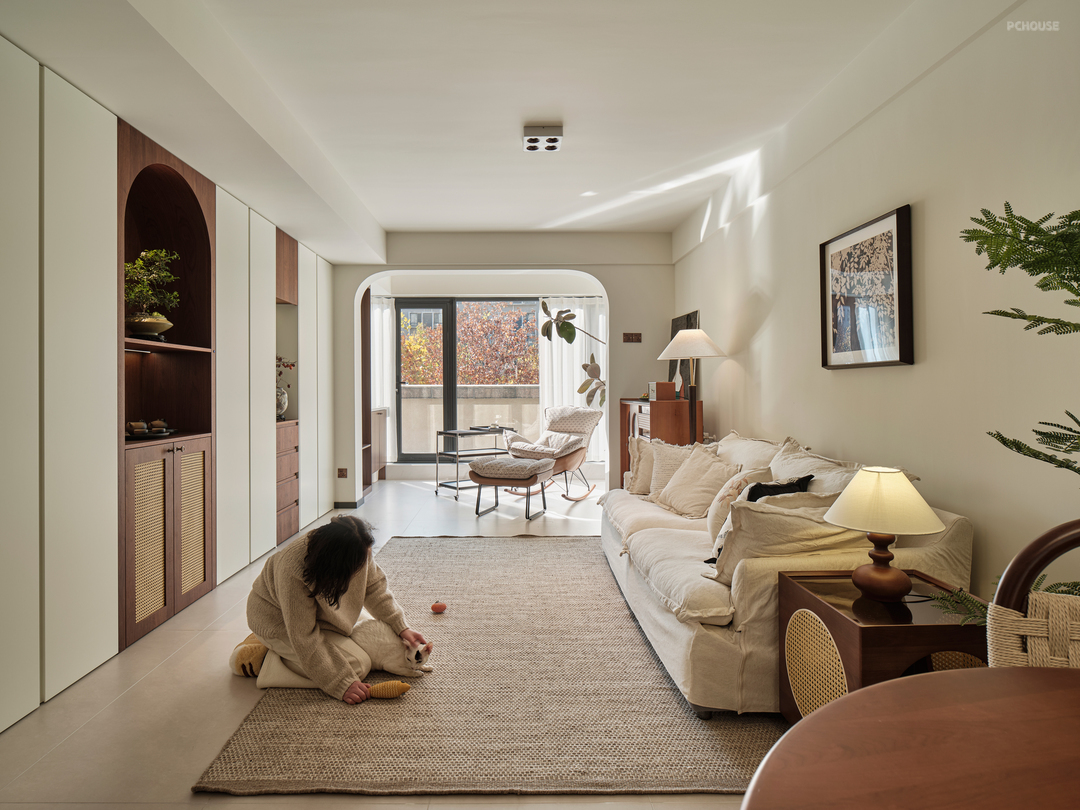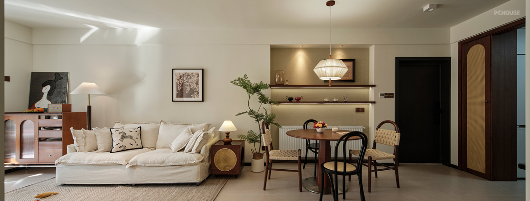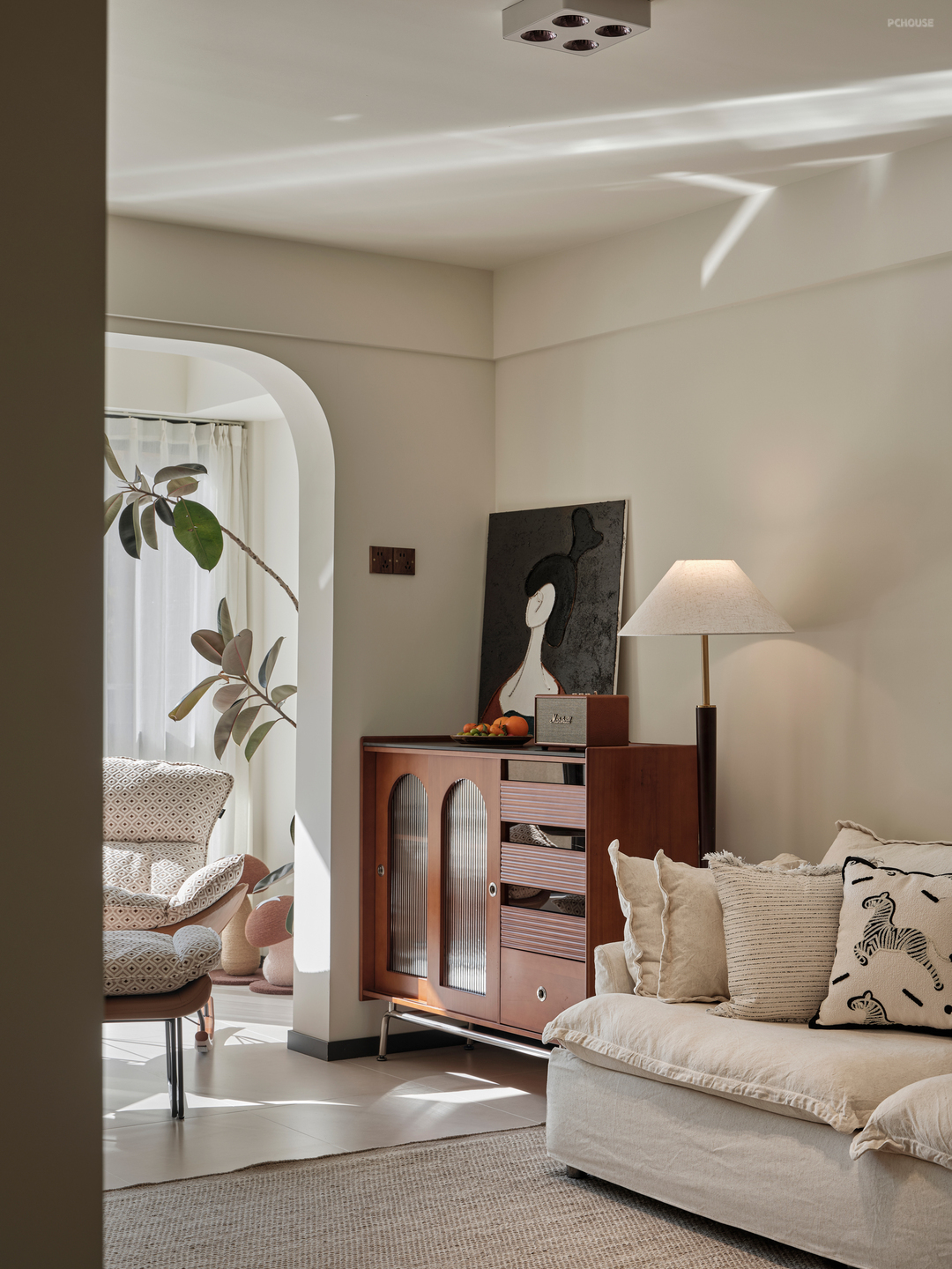 色彩以柔和中性色为基调,米白、浅咖交织出温暖底色,恰似午后的暖阳,给人安心的慰藉;其间点缀沉稳木色,增添自然质感与深度,营造出静谧高雅、温馨宜人的中古氛围。